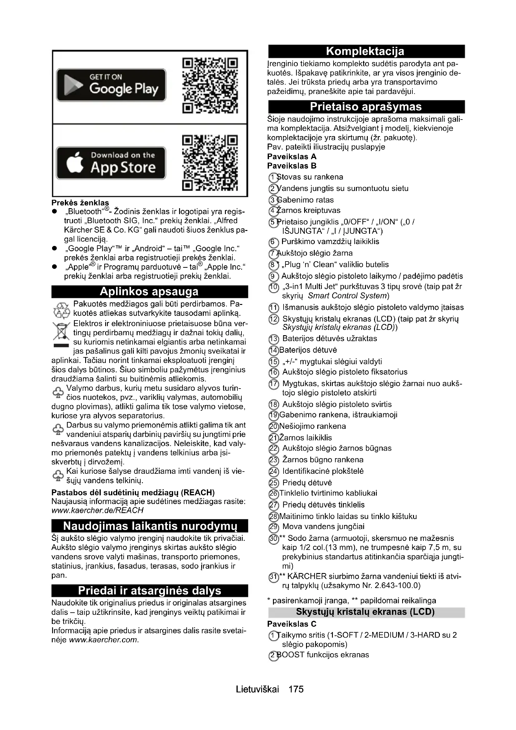 - Žodinis ženklas ir logotipai yra regis- truoti „Bluetooth SIG, Inc.“ prekių ženklai. „Alfred Kärcher SE & Co. KG“ gali naudoti šiuos ženklus pa- gal licenciją. „Google Play“™ ir „Android“ – tai™ „Google Inc.“ prekės ženklai arba registruotieji prekės ženklai. „Apple“