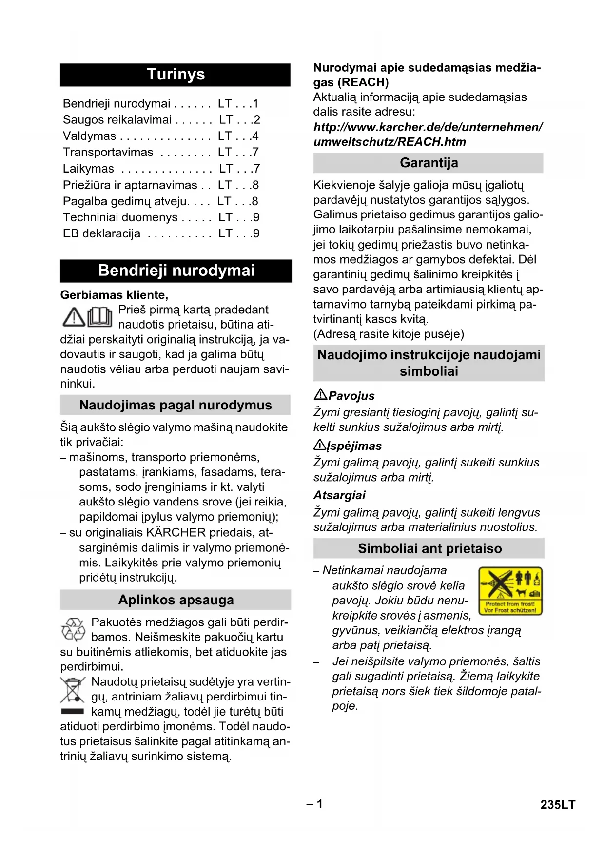 - LT Bendrieji nurodymai Naudojimas pagal nurodymus Aplinkos apsauga Garantija Naudojimo instrukcijoje naudojami simboliai Simboliai ant prietaiso 235LT– 2 Pavojus Niekada nelieskite kištuko ir rozetės šlapiomis rankomis. Nenaudokite prietaiso, jei pažeistas elektros laidas arba svarbios prietaiso dalys, pvz., aukšto slėgio žarna, purški- mo pistoletas ar saugos įranga. Kiekvieną kartą prieš pradėdami nau- doti prietaisą patikrinkite, ar nepažeis- tas maitinimo laidas ir tinklo kištukas. Pažeistą maitinimo laidą nedelsdami pakeiskite oficialioje klientų aptarnavi- mo tarnyboje/elektros prietaisų remon- to dirbtuvėse. Kiekvieną kartą prieš pradėdami nau- doti patikrinkite, ar nepažeista aukšto slėgio žarna. Pažeistą aukšto slėgio žarną nedelsdami pakeiskite. Draudžiama naudoti prietaisą sprogioje aplinkoje. Jei naudojate prietaisą pavojingoje aplinkoje (pvz., degalinėje), paisykite atitinkamų nurodymų dėl saugos. Netinkamai naudojama aukšto slėgio srovė kelia pavojų. Draudžiama srovę nukreipti į asmenis, gyvūnus, veikiančią elektros įrangą arba pat į prietaisą. Jokiu būdu nenukreipkite srovės į kitus asmenis arba save norėdami nuvalyti drabužius arba avalynę. Nepurkškite vandens ar valymo priemo- nių ant daiktų, kurių sudėtyje yra svei- katai pavojingų medžiagų (pvz., asbesto). Aukšto slėgio srovė gali pažeisti trans- porto priemonių padangas/padangų ka- merų ventilius, ir šie gali sprogti. Pirmas pažeidimo požymis – išblukusi padangų spalva. Pažeistos transporto priemonių padangos/padangų kamerų ventiliai gali sukelti pavojų gyvybei. Valymo metu išlaikykite mažiausiai 30 cm atstu- mą nuo srovės! Sprogimo pavojus! Nepurkškite degių skysčių. Jokiu būdu nesiurbkite skysčių, kurių sudėtyje yra tirpiklių, arba neskiestų rūgščių ir tirpiklių ! Šioms medžiagoms priklauso, pvz., benzinas, dažų skiedi- kliai arba mazutas. Susidariusi šių me- džiagų dulksna yra ypač degi, sprogi ir nuodinga. Jokiu būdu nenaudokite ace- tono, neskiestų rūgščių ir tirpiklių, ka- dangi jie gali pažeisti prietaiso medžiagas. 몇 Įspėjimas Ilgintuvo laido kištukas ir jungtys turi būti nepralaidus vandeniui ir negali būti vandenyje. Netinkami ilgintuvo laidai gali kelti pavo- jų. Dirbdami lauke naudokite tik tinka- mus ir reikiamai pažymėtus pakankamo skersmens ilgintuvų laidus: p. 9