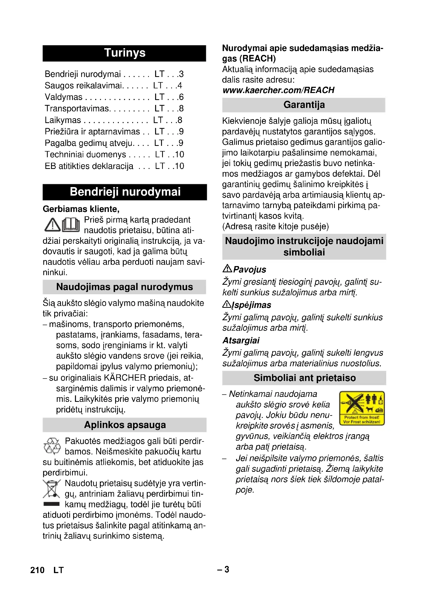 • dB(A) 95 EK Atbilstības deklarācija Produkts: Augstspiediena tīrīšanas aparāts Tips: 1.601-xxx Attiecīgās ES direktīvas: 2006/42/EK (+2009/127/EK) 2004/108/EK 2000/14/EK Piemērotās harmonizētās normas: EN 55014–1: 2006 + A1: 2009 EN 55014–2: 1997 + A2: 2008 EN 60335–1 EN 60335–2–79 EN 61000–3–2: 2006 + A2: 2009 EN 61000–3–3: 2008 EN 62233: 2008 Atbilstibas novertešanas procedura: 2000/14/EK: V pielikums Skanas intensitates līmenis dB(A) Izmērītais: 93 Garantētais: 95 CEO Head of Approbation 209LV– 3 Gerbiamas kliente, Prieš pirmą kartą pradedant naudotis prietaisu, būtina ati- džiai perskaityti originalią instrukciją, ja va- dovautis ir saugoti, kad ja galima būtų naudotis vėliau arba perduoti naujam savi- ninkui. Šią aukšto slėgio valymo mašiną naudokite tik privačiai: – mašinoms, transporto priemonėms, pastatams, įrankiams, fasadams, tera- soms, sodo įrenginiams ir kt. valyti aukšto slėgio vandens srove (jei reikia, papildomai įpylus valymo priemonių); – su originaliais KÄRCHER priedais, at- sarginėmis dalimis ir valymo priemonė- mis. Laikykitės prie valymo priemonių pridėtų instrukcijų. Pakuotės medžiagos gali būti perdir- bamos. Neišmeskite pakuočių kartu su buitinėmis atliekomis, bet atiduokite jas perdirbimui. Naudotų prietaisų sudėtyje yra vertin- gų, antriniam žaliavų perdirbimui tin- kamų medžiagų, todėl jie turėtų būti atiduoti perdirbimo įmonėms. Todėl naudo- tus prietaisus šalinkite pagal atitinkamą an- trinių žaliavų surinkimo sistemą. Nurodymai apie sudedamąsias medžia- gas (REACH) Aktualią informaciją apie sudedamąsias dalis rasite adresu: www.kaercher.com/REACH Kiekvienoje šalyje galioja mūsų įgaliotų pardavėjų nustatytos garantijos sąlygos. Galimus prietaiso gedimus garantijos galio- jimo laikotarpiu pašalinsime nemokamai, jei tokių gedimų priežastis buvo netinka- mos medžiagos ar gamybos defektai. Dėl garantinių gedimų šalinimo kreipkitės į savo pardavėją arba artimiausią klientų ap- tarnavimo tarnybą pateikdami pirkimą pa- tvirtinantį kasos kvitą. (Adresą rasite kitoje pusėje) Pavojus Žymi gresiantį tiesioginį pavojų, galintį su- kelti sunkius sužalojimus arba mirtį. 몇 Įspėjimas Žymi galimą pavojų, galintį sukelti sunkius sužalojimus arba mirtį. Atsargiai Žymi galimą pavojų, galintį sukelti lengvus sužalojimus arba materialinius nuostolius. – Netinkamai naudojama aukšto slėgio srovė kelia pavojų. Jokiu būdu nenu- kreipkite srovės į asmenis, gyvūnus, veikiančią elektros įrangą arba patį prietaisą. – Jei neišpilsite valymo priemonės, šaltis gali sugadinti prietaisą. Žiemą laikykite prietaisą nors šiek tiek šildomoje patal- poje. Turinys Bendrieji nurodymai