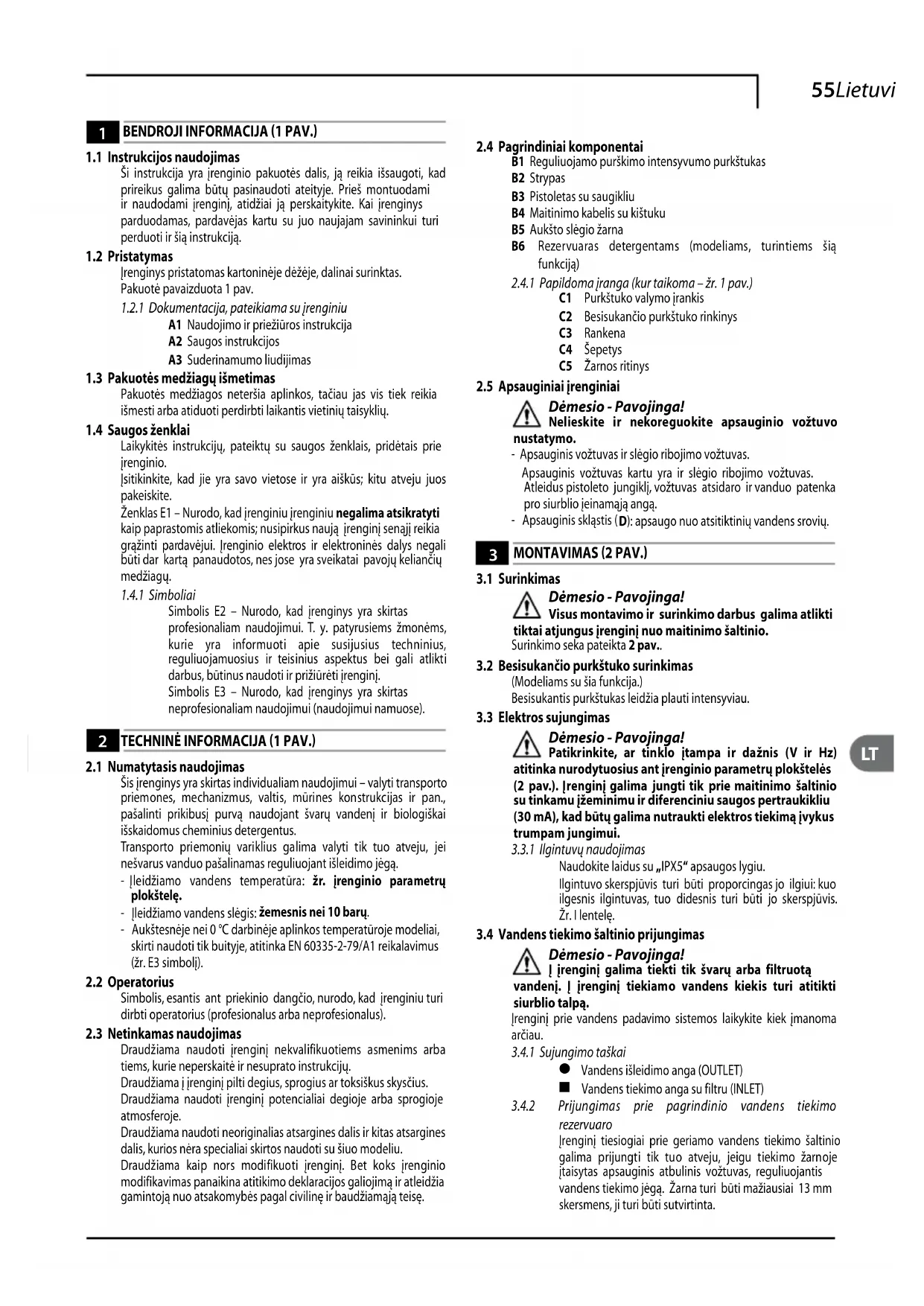 B1 Reguliuojamo purškimo intensyvumo purkštukasB2 StrypasB3 Pistoletas su saugikliuB4 Maitinimo kabelis su kištukuB5 Aukšto slėgio žarna B6 Rezervuaras detergentams (modeliams, turintiems šią funkciją)