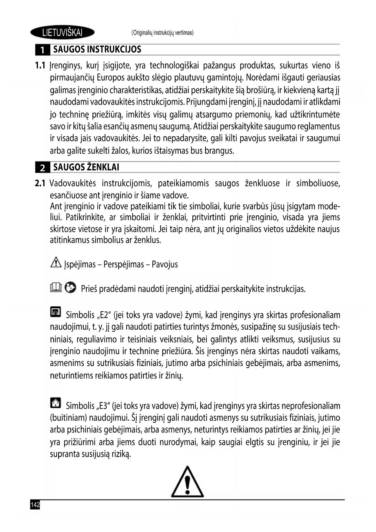 liui. Patikrinkite, ar simboliai ir ženklai, pritvirtinti prie įrenginio, visada yra jiems skirtose vietose ir yra įskaitomi. Jei taip nėra, ant jų originalios vietos uždėkite naujus atitinkamus simbolius ar ženklus. Įspėjimas – Perspėjimas – Pavojus Prieš pradėdami naudoti įrenginį, atidžiai perskaitykite instrukcijas. Simbolis „E2“ (jei toks yra vadove) žymi, kad įrenginys yra skirtas profesionaliam naudojimui, t.y. jį gali naudoti patirties turintys žmonės, susipažinę su susijusiais tech- niniais, reguliavimo ir teisiniais veiksniais, bei galintys atlikti veiksmus, susijusius su įrenginio naudojimu ir technine priežiūra. Šis įrenginys nėra skirtas naudoti vaikams, asmenims su sutrikusiais fiziniais, jutimo arba psichiniais gebėjimais, arba asmenims, neturintiems reikiamos patirties ir žinių. Simbolis „E3“ (jei toks yra vadove) žymi, kad įrenginys yra skirtas neprofesionaliam (buitiniam) naudojimui. Šį įrenginį gali naudoti asmenys su sutrikusiais fiziniais, jutimo arba psichiniais gebėjimais, arba asmenys, neturintys reikiamos patirties ar žinių, jei jie yra prižiūrimi arba jiems duoti nurodymai, kaip saugiai elgtis su įrenginiu, ir jei jie supranta susijusią riziką.142