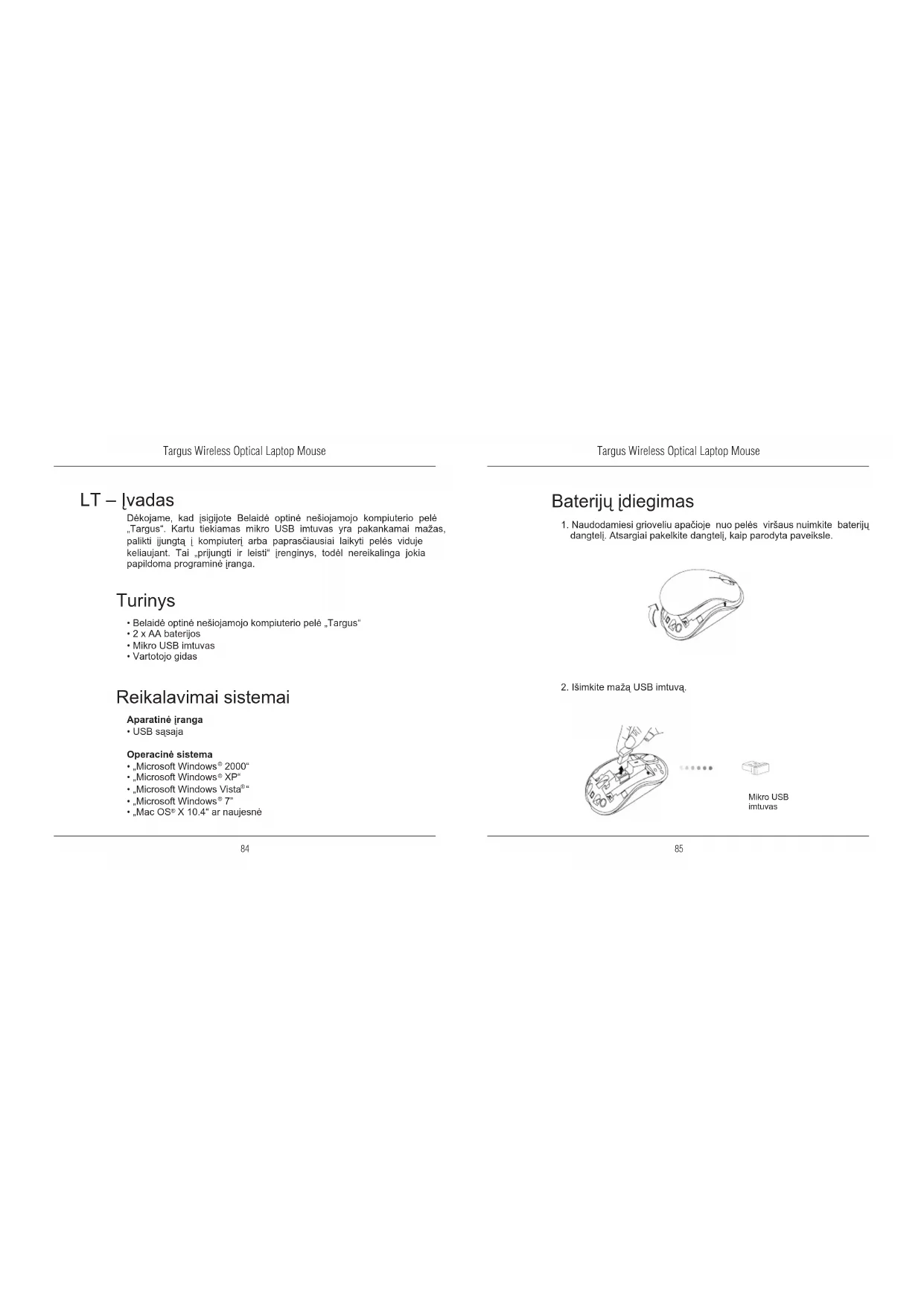 LT – Įvadas Dėkojame, kad įsigijote Belaidė optinė nešiojamojo kompiuterio pelė „Targus“. Kartu tiekiamas mikro USB imtuvas yra pakankamai mažas, palikti įjungtą į kompiuterį arba paprasčiausiai laikyti pelės viduje keliaujant. Tai „prijungti ir leisti“ įrenginys, todėl nereikalinga jokia papildoma programinė įranga. Reikalavimai sistemai Aparatinė įranga