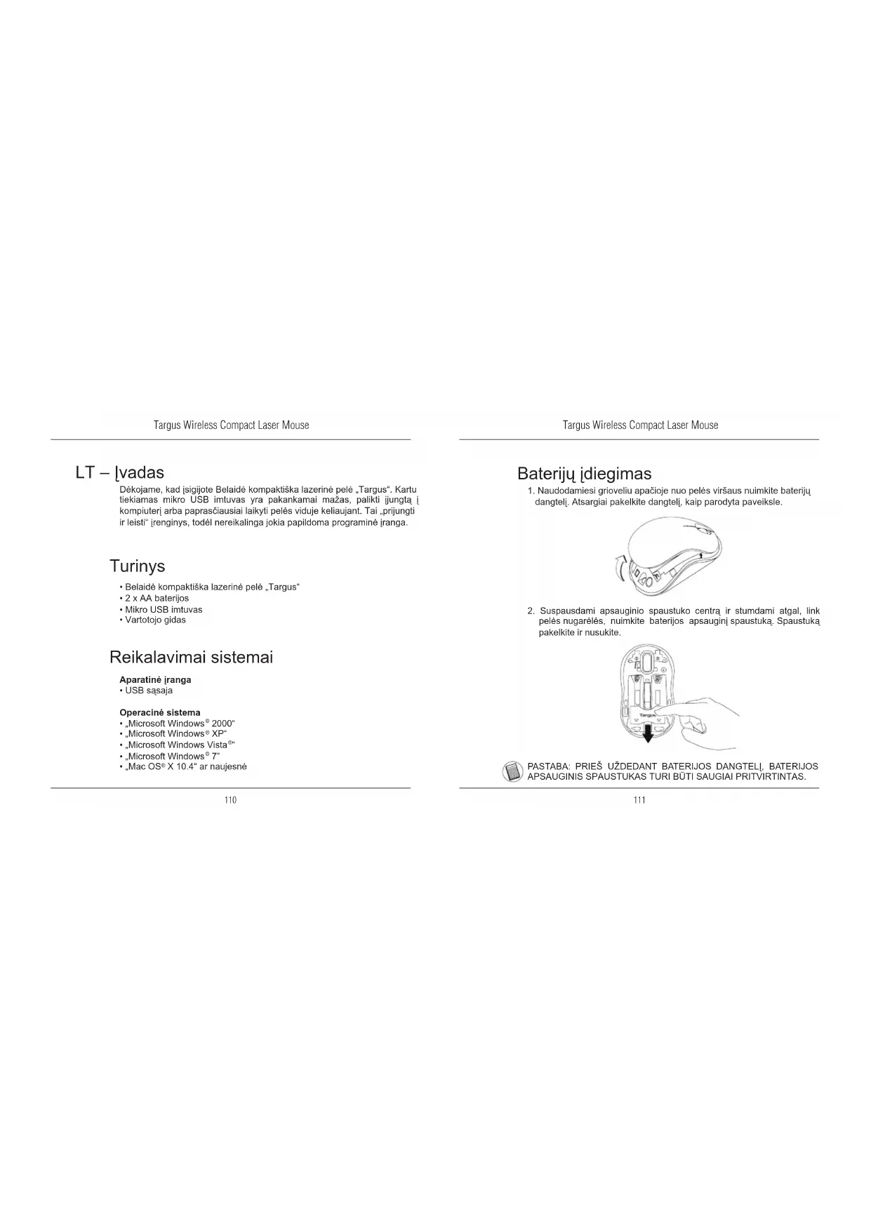 LT – Įvadas Dėkojame, kad įsigijote Belaidė kompaktiška lazerinė pelė „Targus“. Kartu tiekiamas mikro USB imtuvas yra pakankamai mažas, palikti įjungtą į kompiuterį arba paprasčiausiai laikyti pelės viduje keliaujant. Tai „prijungti ir leisti“ įrenginys, todėl nereikalinga jokia papildoma programinė įranga. Reikalavimai sistemai Aparatinė įranga