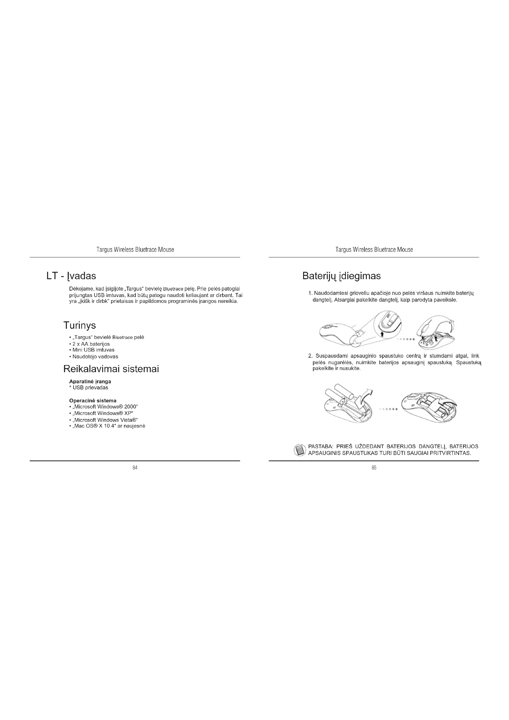 LT - Įvadas Dėkojame, kad įsigijote „Targus“ bevielę Bluetrace pelę. Prie pelės patogiai prijungtas USB imtuvas, kad būtų patogu naudoti keliaujant ar dirbant. Tai yra „įkišk ir dirbk“ prietaisas ir papildomos programinės įrangos nereikia. Reikalavimai sistemai Aparatinė įranga
