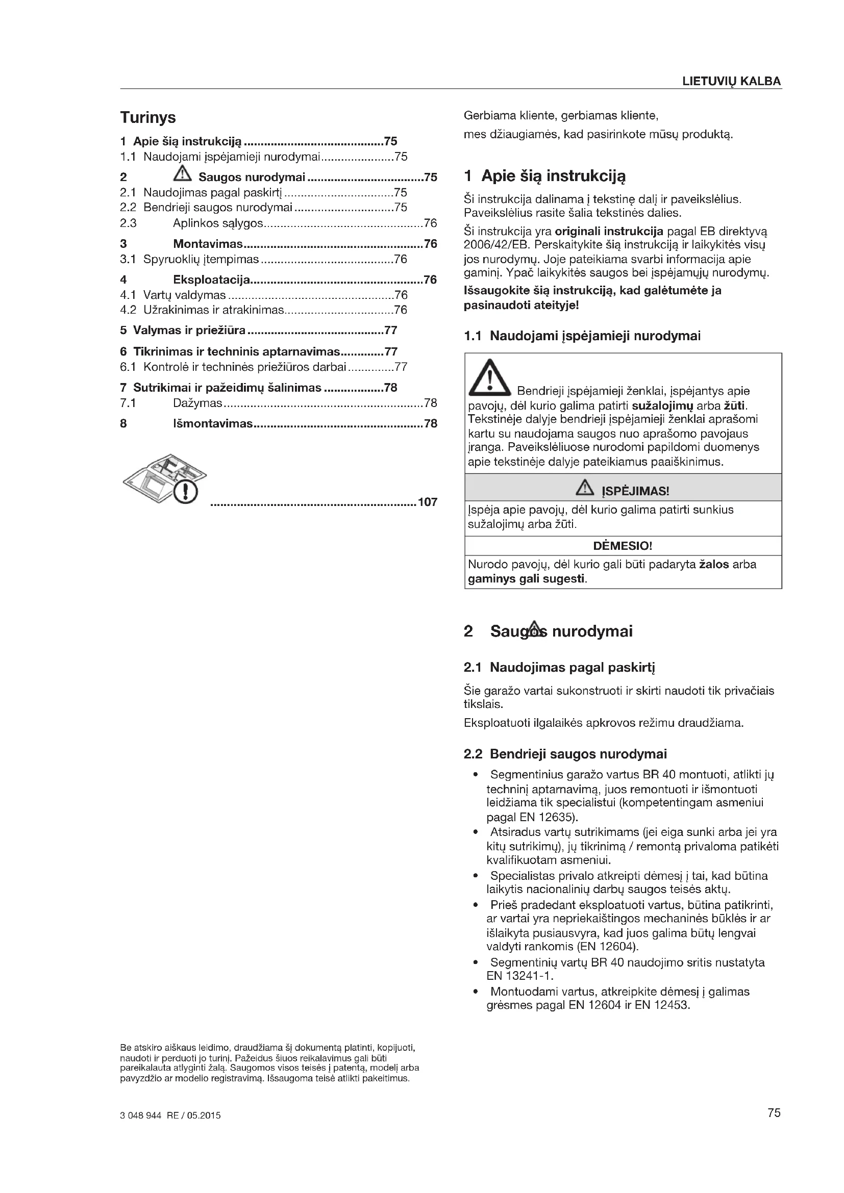 - Montuodami vartus, atkreipkite dėmesį į galimas grėsmes pagal EN12604 ir EN12453. 1 Apie šią instrukciją ..........................................75