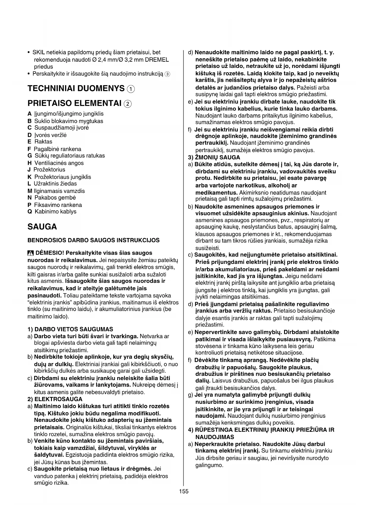 - Perskaitykite ir išsaugokite šią naudojimo instrukciją 3 TECHNINIAI DUOMENYS 1 PRIETAISO ELEMENTAI 2 A Įjungimo/išjungimo jungiklis B Suklio blokavimo mygtukas C Suspaudžiamoji įvorė D Įvorės veržlė E Raktas F Pagalbinė rankena G Sūkių reguliatoriaus ratukas H Ventiliacinės angos J Prožektorius K Prožektoriaus jungiklis L Užraktinis žiedas M Ilginamasis vamzdis N Pakabos gembė P Fiksavimo rankena Q Kabinimo kablys SAUGA