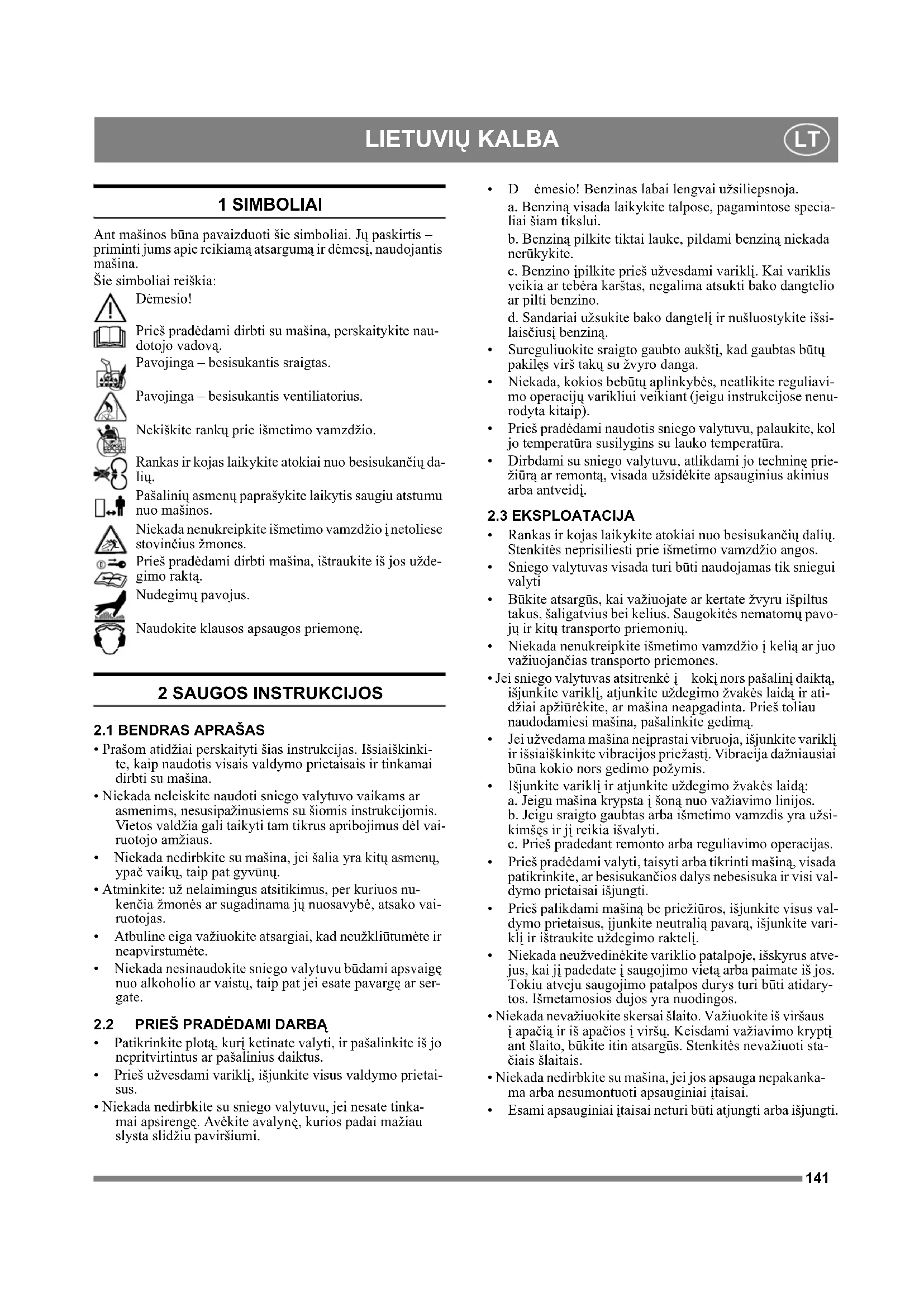 1 SIMBOLIAI Ant mašinos būna pavaizduoti šie simboliai. Jų paskirtis – priminti jums apie reikiamą atsargumą ir dėmesį, naudojantis mašina. Šie simboliai reiškia: Dėmesio! Prieš pradėdami dirbti su mašina, perskaitykite nau- dotojo vadovą. Pavojinga – besisukantis sraigtas. Pavojinga – besisukantis ventiliatorius. Nekiškite rankų prie išmetimo vamzdžio. Rankas ir kojas laikykite atokiai nuo besisukančių da- lių. Pašalinių asmenų paprašykite laikytis saugiu atstumu nuo mašinos. Niekada nenukreipkite išmetimo vamzdžio į netoliese stovinčius žmones. Prieš pradėdami dirbti mašina, ištraukite iš jos užde- gimo raktą. Nudegimų pavojus. Naudokite klausos apsaugos priemonę. 2 SAUGOS INSTRUKCIJOS
