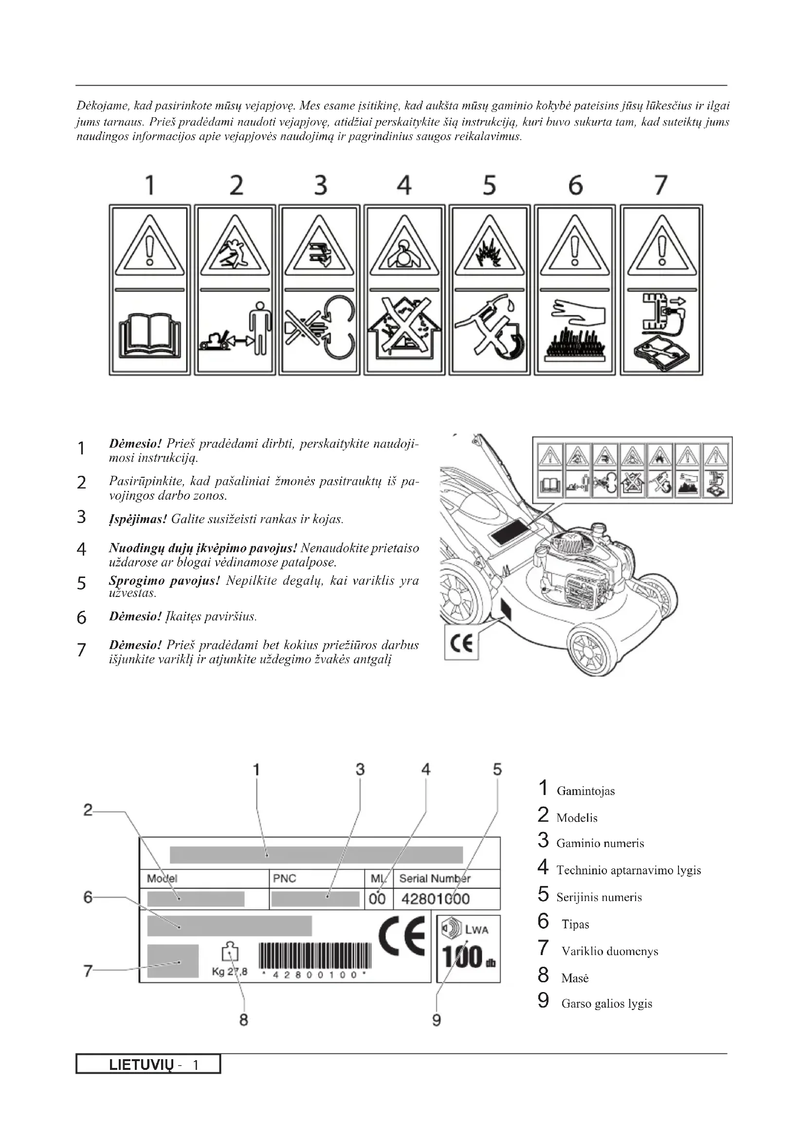 Dėkojame, kad pasirinkote mūsų vejapjovę. Mes esame įsitikinę, kad aukšta mūsų gaminio kokybė pateisins jūsų lūkesčius ir ilgai jums tarnaus. Prieš pradėdami naudoti vejapjovę, atidžiai perskaitykite šią instrukciją, kuri buvo sukurta tam, kad suteiktų jums naudingos informacijos apie vejapjovės naudojimą ir pagrindinius saugos reikalavimus. Dėmesio! Prieš pradėdami dirbti, perskaitykite naudoji- mosi instrukciją. Pasirūpinkite, kad pašaliniai žmonės pasitrauktų iš pa- vojingos darbo zonos. Įspėjimas! Galite susižeisti rankas ir kojas. Nuodingų dujų įkvėpimo pavojus! Nenaudokite prietaiso uždarose ar blogai vėdinamose patalpose. Sprogimo pavojus! Nepilkite degalų, kai variklis yra užvestas. Dėmesio! Įkaitęs paviršius. Dėmesio! Prieš pradėdami bet kokius priežiūros darbus išjunkite variklį ir atjunkite uždegimo žvakės antgalį 1 Gamintojas 2 Modelis 3 Gaminio numeris 4 Techninio aptarnavimo lygis 5 Serijinis numeris 6 Tipas 7 Variklio duomenys 8 Masė 9 Garso galios lygisLIETUVIŲ - 2 Nurodymas a) Jaunesni nei 16 metų ir su vejapjovės naudojimo nuro- dymais nesusipažinę asmenys jos naudoti negali. b) Naudojantis vejapjovę asmuo darbo teritorijoje atsako už pašalinių asmenų saugumą. Kai vejapjovė įjungta, vaikai ir naminiai gyvūnai turi būti atokiau nuo prietaiso. c) Prietaisu galima tik pjauti žolę. Negalima jo naudoti kitais tikslais (pvz. lyginti kurmių išraustos žemės ar skruzdėlynų). d) Dirbkite tik pakankamai apšviestoje teritorijoje. e) Prieš pradėdami pjauti patikrinkite, ar žolėje nėra pašalinių daiktų, kuriuos vejapjovė gali išsviesti. Pjaudami stebėkite, ar neliko jų pjaunamoje teritorijoje. Paruošimas/veikimo būdas a) Pjaudami avėkite patvarius batus ir ilgas kelnes. b) Prieš pradėdami pjauti patikrinkite, ar peilis ir peilio tvir- tinimo varžtas yra gerai pritvirtinti. Jei peilis sugadintas, jis turi būti pakeistas. c) Turite išjungti variklį, nuimti uždegimo žvakės antgalį ir palaukti, kol peilis nustos judėti prieš: