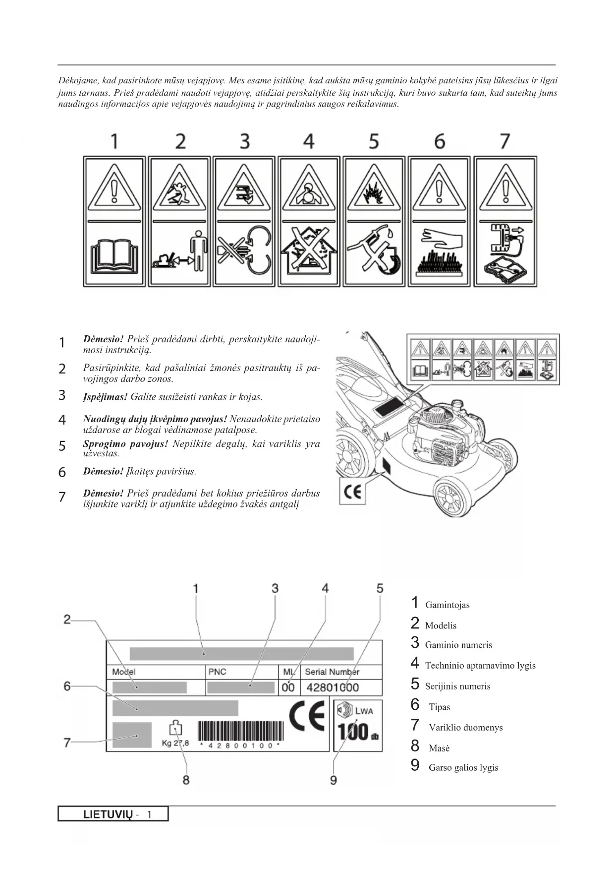 Dėkojame, kad pasirinkote mūsų vejapjovę. Mes esame įsitikinę, kad aukšta mūsų gaminio kokybė pateisins jūsų lūkesčius ir ilgai jums tarnaus. Prieš pradėdami naudoti vejapjovę, atidžiai perskaitykite šią instrukciją, kuri buvo sukurta tam, kad suteiktų jums naudingos informacijos apie vejapjovės naudojimą ir pagrindinius saugos reikalavimus. Dėmesio! Prieš pradėdami dirbti, perskaitykite naudoji- mosi instrukciją. Pasirūpinkite, kad pašaliniai žmonės pasitrauktų iš pa- vojingos darbo zonos. Įspėjimas! Galite susižeisti rankas ir kojas. Nuodingų dujų įkvėpimo pavojus! Nenaudokite prietaiso uždarose ar blogai vėdinamose patalpose. Sprogimo pavojus! Nepilkite degalų, kai variklis yra užvestas. Dėmesio! Įkaitęs paviršius. Dėmesio! Prieš pradėdami bet kokius priežiūros darbus išjunkite variklį ir atjunkite uždegimo žvakės antgalį 1 Gamintojas 2 Modelis 3 Gaminio numeris 4 Techninio aptarnavimo lygis 5 Serijinis numeris 6 Tipas 7 Variklio duomenys 8 Masė 9 Garso galios lygisLIETUVIŲ - 2 Nurodymas a) Jaunesni nei 16 metų ir su vejapjovės naudojimo nuro- dymais nesusipažinę asmenys jos naudoti negali. b) Naudojantis vejapjovę asmuo darbo teritorijoje atsako už pašalinių asmenų saugumą. Kai vejapjovė įjungta, vaikai ir naminiai gyvūnai turi būti atokiau nuo prietaiso. c) Prietaisu galima tik pjauti žolę. Negalima jo naudoti kitais tikslais (pvz. lyginti kurmių išraustos žemės ar skruzdėlynų). d) Dirbkite tik pakankamai apšviestoje teritorijoje. e) Prieš pradėdami pjauti patikrinkite, ar žolėje nėra pašalinių daiktų, kuriuos vejapjovė gali išsviesti. Pjaudami stebėkite, ar neliko jų pjaunamoje teritorijoje. Paruošimas/veikimo būdas a) Pjaudami avėkite patvarius batus ir ilgas kelnes. b) Prieš pradėdami pjauti patikrinkite, ar peilis ir peilio tvir- tinimo varžtas yra gerai pritvirtinti. Jei peilis sugadintas, jis turi būti pakeistas. c) Turite išjungti variklį, nuimti uždegimo žvakės antgalį ir palaukti, kol peilis nustos judėti prieš:
