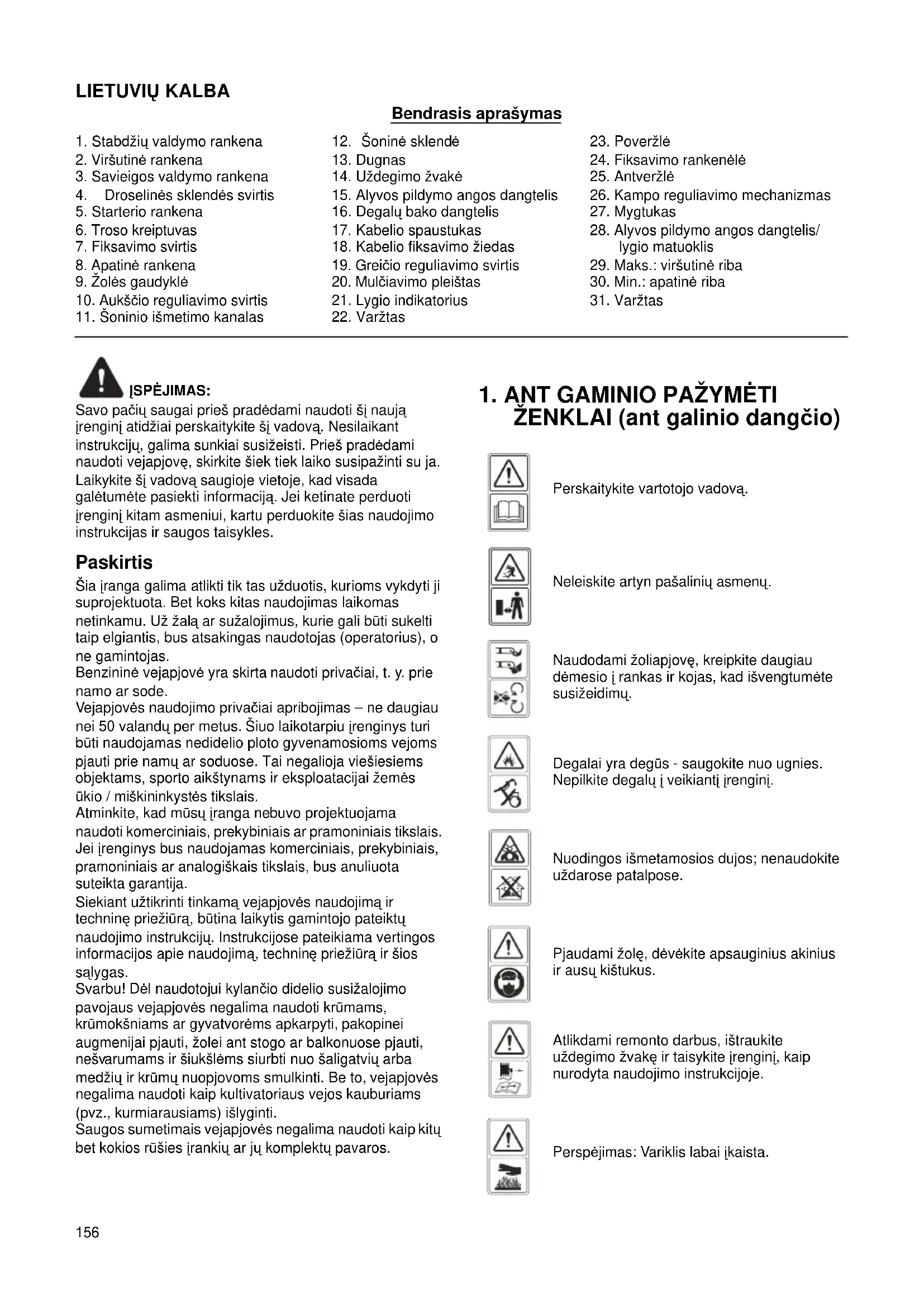 Perskaitykite vartotojo vadovą. Neleiskite artyn pašalinių asmenų. Naudodami žoliapjovę, kreipkite daugiau dėmesio į rankas ir kojas, kad išvengtumėte susižeidimų. Degalai yra degūs - saugokite nuo ugnies. Nepilkite degalų į veikiantį įrenginį. Nuodingos išmetamosios dujos; nenaudokite uždarose patalpose. Pjaudami žolę, dėvėkite apsauginius akinius ir ausų kištukus. Atlikdami remonto darbus, ištraukite uždegimo žvakę ir taisykite įrenginį, kaip nurodyta naudojimo instrukcijoje. Perspėjimas: Variklis labai įkaista.157