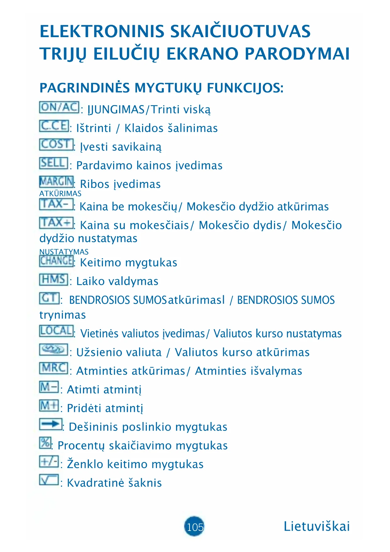 PAGRINDINĖS MYGTUKŲ FUNKCIJOS: : ĮJUNGIMAS/Trinti viską : Ištrinti / Klaidos šalinimas : Įvesti savikainą : Pardavimo kainos įvedimas : Ribos įvedimas : Kaina be mokesčių/ Mokesčio dydžio atkūrimas : Kaina su mokesčiais/ Mokesčio dydis/ Mokesčio dydžio nustatymas : Keitimo mygtukas : Laiko valdymas