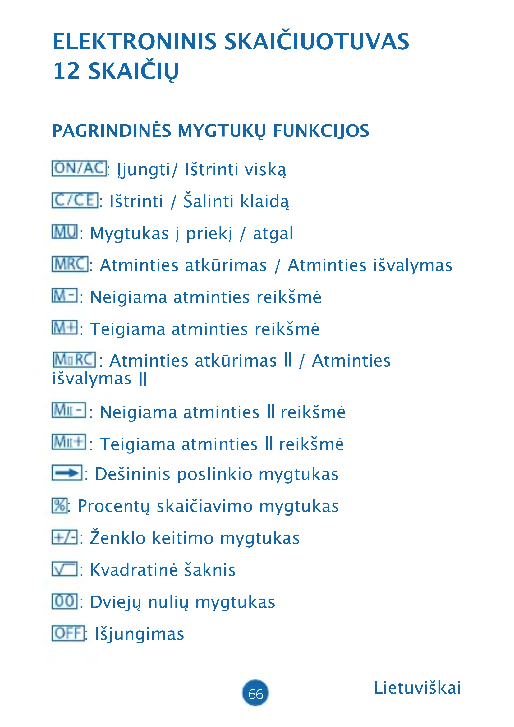: Neigiama atminties II reikšmė : Teigiama atminties II reikšmė : Dešininis poslinkio mygtukas : Procentų skaičiavimo mygtukas : Ženklo keitimo mygtukas : Kvadratinė šaknis : Dviejų nulių mygtukas : Išjungimas Lietuviškai67 Lietuviškai JUNGIKLIO APRAŠYMAS:
