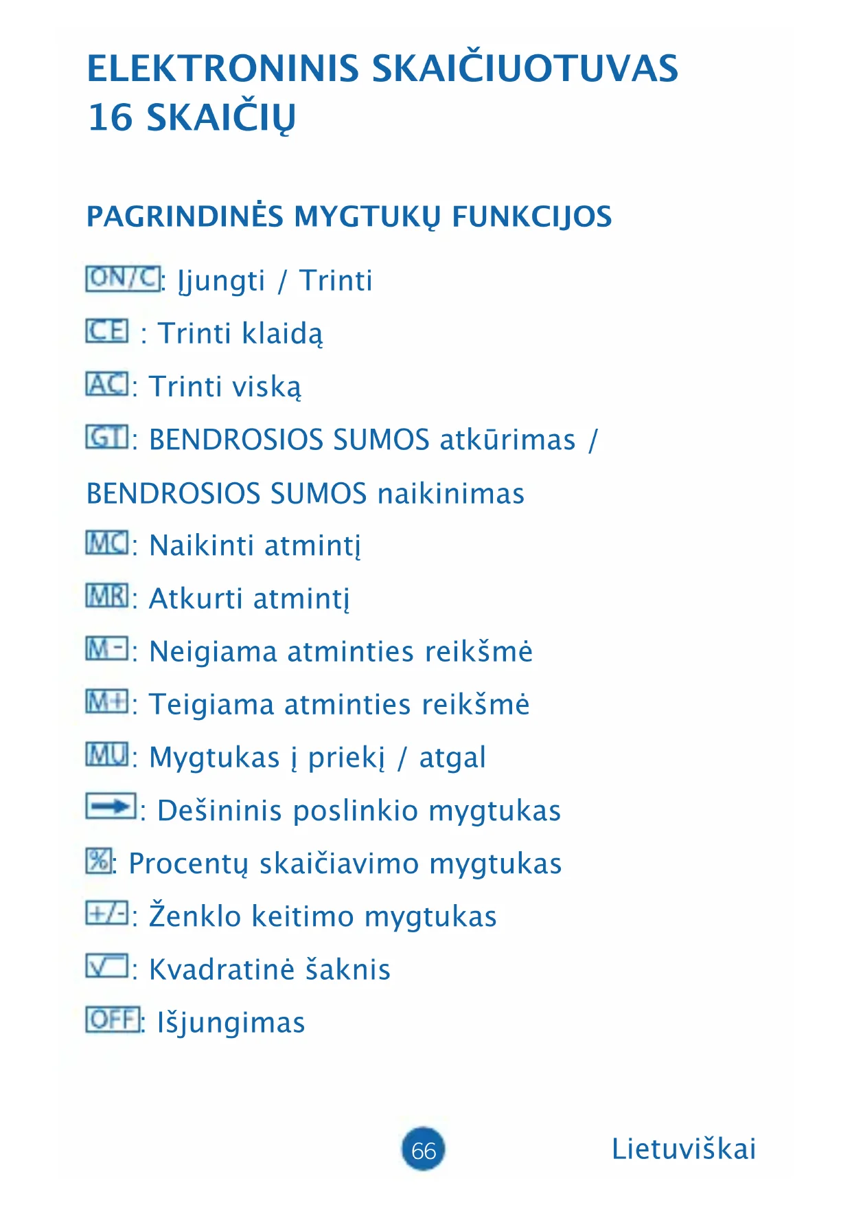 : Įjungti / Trinti : Trinti klaidą : Trinti viską : BENDROSIOS SUMOS atkūrimas / BENDROSIOS SUMOS naikinimas : Naikinti atmintį : Atkurti atmintį : Neigiama atminties reikšmė : Teigiama atminties reikšmė : Mygtukas į priekį / atgal : Dešininis poslinkio mygtukas : Procentų skaičiavimo mygtukas : Ženklo keitimo mygtukas : Kvadratinė šaknis : Išjungimas Lietuviškai67 JUNGIKLIO APRAŠYMAS: