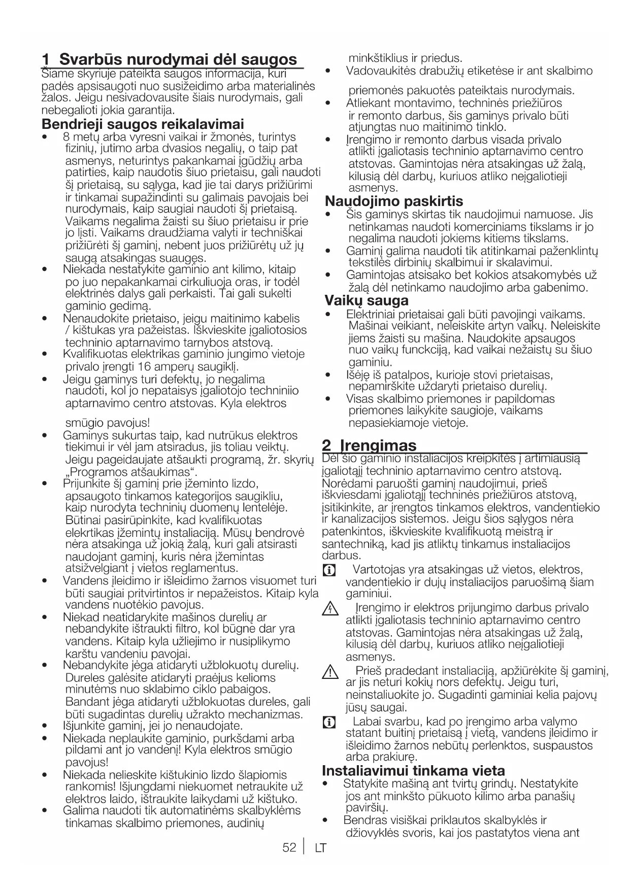 Gamybosmetu,dėlkokybėskontrolėsprocesų, mašinojegalibūtilikęvandens.Jisnekenkia mašinai. Pakavimo medžiagų išmetimas Pakavimomedžiagosgalibūtipavojingos vaikams.Pakavimomedžiagaslaikykitevaikams nepasiekiamojevietoje. Šiogaminiopakavimomedžiagospagamintosiš pakartotinaipanaudojamųmedžiagų.Tinkamai jasišmeskiteirišrūšiuokite,atsižvelgdamiįatliekų perdirbimoinstrukciją.Neišmeskitejųkartusu įprastomisbuitinėmisatliekomis.55