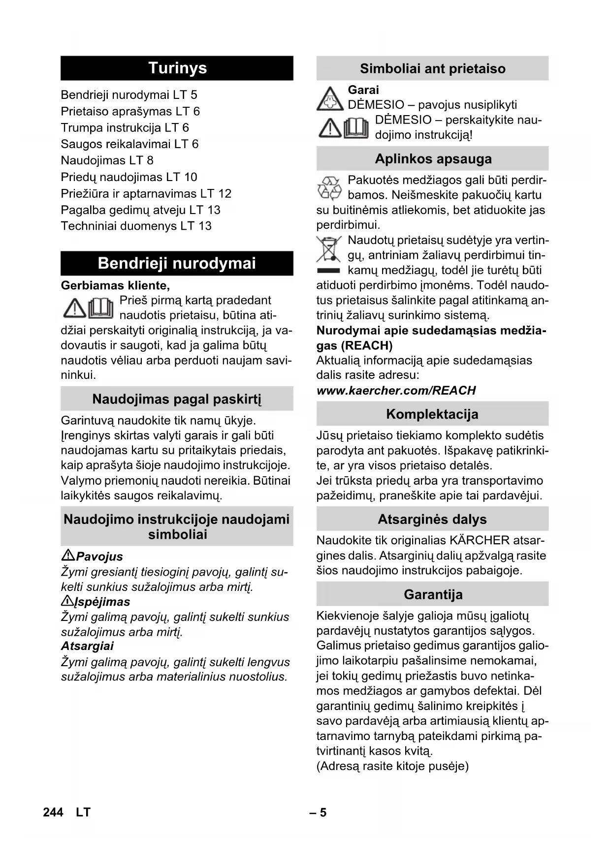 sų prietaiso tiekiamo komplekto sudėtis parodyta ant pakuotės. Išpakavę patikrinki- te, ar yra visos prietaiso detalės. Jei trūksta priedų arba yra transportavimo pažeidimų, praneškite apie tai pardavėjui. Naudokite tik originalias KÄRCHER atsar- gines dalis. Atsarginių dalių apžvalgą rasite šios naudojimo instrukcijos pabaigoje. Kiekvienoje šalyje galioja mūsų įgaliotų pardavėjų nustatytos garantijos sąlygos. Galimus prietaiso gedimus garantijos galio- jimo laikotarpiu pašalinsime nemokamai, jei tokių gedimų priežastis buvo netinka- mos medžiagos ar gamybos defektai. Dėl garantinių gedimų šalinimo kreipkitės į savo pardavėją arba artimiausią klientų ap- tarnavimo tarnybą pateikdami pirkimą pa- tvirtinantį kasos kvitą. (Adresą rasite kitoje pusėje) Turinys Bendrieji nurodymai LT 5 Prietaiso aprašymas LT 6 Trumpa instrukcija LT 6 Saugos reikalavimai LT 6 Naudojimas LT 8 Priedų naudojimas LT 10 Priežiūra ir aptarnavimas LT 12 Pagalba gedimų atveju LT 13 Techniniai duomenys LT 13 Bendrieji nurodymai Naudojimas pagal paskirtį Naudojimo instrukcijoje naudojami simboliai Simboliai ant prietaiso Aplinkos apsauga Komplektacija Atsarginės dalys Garantija 244 LT– 6 Šioje eksploatavimo instrukcijoje aprašoma maksimali įranga. Priklausomai nuo mode- lio gali skirtis tiekimo komplekto turinys (žr. pakuotę). Paveikslus rasite išlanks- tomame puslapyje! Paveikslėlius rasite 2 psl. 1 Atsukite apsauginį užraktą ir į garintuvą įpilkite maks. 1 litrą vandens. 2 Įsukite apsauginį užraktą. 3 Įkiškite garintuvo kištuką į prietaiso liz- dą. 4 Įkiškite elektros laido kištuką. Ájunkite prietaisà. Uþsidega þalia ir oranþinë kontrolinës lemputës. 5 Palaukite, kol užges oranžinė kontrolinė lemputė. 6 Prijunkite priedus prie garų pistoleto. Garintuvas paruoštas darbui. Pavojus Draudžiama naudoti prietaisą sprogioje aplinkoje. Jei naudojate prietaisą pavojingoje aplinkoje, laikykitės atitinkamų saugos nuorodų. Nenaudokite prietaiso baseinuose, jei- gu juose yra vandens. Draudžiama naudoti prietaisą elektros prietaisų valymui, pavyzdžiui, orkai- tėms, garų surinktuvams, mikrobangų krosnelėms, televizoriams, lempoms, plaukų džiovintuvams, elektros šildytu- vams ir t. t. Prieš naudodami prietaisą ir priedus, patikrinkite, ar jie tvarkingos būklės. Jei jų būklė nėra puiki, prietaiso naudoti ne- galima. Ypač kruopščiai tikrinkite mati- nimo laidus, apsauginį užraktą ir garų tiekimo žarną. Pažeistą maitinimo laidą nedelsdami pakeiskite oficialioje klientų aptarnavi- mo tarnyboje ar leiskite pakeisti kvalifi- kuotam elektrikui. Pažeistą garų tiekimo žarną nedelsda- mi pakeiskite. Galima naudoti tik gamin- tojo rekomenduojamą garų tiekimo žarną (užsakymo numer į žiūrėkite kei- čiamų detalių sąraše). Niekada nelieskite kištuko ir rozetės šlapiomis rankomis. Prietaiso aprašymas A1 Prietaiso kištukinis lizdas su dangteliu A2 Kontrolinė šildymo lemputė (ORANŽI- NĖ) A3 Apie prijungimą prie elektros tinklo pra- nešanti kontrolinė lemputė (žalia) A4 Jungiklis – įjungtas A5 Jungiklis – išjungtas A6 Apsauginis užraktas A7 Priedų laikiklis A8 Antgalio grindims laikiklis A9 Maitinimo laidas su kištuku A10Ratukai (2 vnt.) A11Vairuojamasis ratukas B1 Garo pistoletas B2 Atblokavimo mygtukas B3 Garų kiekio pasirinkimo jungiklis (su apsauga nuo vaikų) B4 Garo srauto reguliatorius B5 Garo tiekimo žarna B6 Garintuvo antgalis C1 Taškinis antgalis C2 Apvalus šepetėlis C3 Galingas antgalis D1 Rankinis antgalis D2 Frotinė įmautė E1 Ilginimo vamzdžiai (2 vnt.) E2 Atblokavimo mygtukas F1 Antgalis grindims F2 Fiksatorius F3 Šluostė G1 Langų valytuvas Parinktis H1 Slėginis garų lygintuvas H2 Garų mygtukas (apačioje) H3 Kontrolinė šildymo lemputė (ORANŽINĖ) H4 Garų mygtukas (viršuje) H5 Garų mygtuko fiksatorius H6 Temperatūros reguliatorius H7 Garintuvo antgalis Trumpa instrukcija Saugos reikalavimai 245LT– 7 Nepurkškite garų ant daiktų, kurių sudė- tyje yra sveikatai pavojingų medžiagų (pvz., asbesto). Jokiu būdu arti nekiškite rankos prie garų srauto ir nenukreipkite jo į žmones ar gyvūnus (galite nusiplikyti). 몇 Įspėjimas Prietaisą galima įjungti tik elektros lai- du, kurį pagamino elektros įrangos spe- cialistas pagal standartą IEC 60364. Prietaisą galima jungti tik į kintamosios srovės tinklą. Įtampa turi atitikti prietai- so skydelyje nurodytą įtampą. Drėgnose patalpose, pvz., vonios kam- baryje, junkite prietaisą prie kištukinio lizdo su apsauginiu liekamosios srovės pertraukikliu. Netinkami ilginamieji laidai gali kelti pa- vojų. Naudokite tik vandeniui atsparų il- ginamąjį laidą su ne mažesniu nei 3x1 mm² skersmeniu. Šakutės ir ilginamojo laido jungtis nega- li būti vandenyje. Jei keičiate elektros tinklo ar ilginamojo laidų movas, užtikrinkite, kad laidai bus apsaugoti nuo purškiamo vandens ir at- sparūs mechaniniam poveikiui. Vartotojas prietaisą turi naudoti pagal nurodymus. Jis turi paisyti aplinkos są- lygų, o dirbdamas – netoliese esančių žmonių laikytis Vaikai nuo 8 metų bei fizinę, sensorinę ir dvasinę negalią turintys bei pakanka- mai patirties ir žinių neturintys asmenys gali naudoti įrenginį tik prižiūrimi arba apmokyti, kaip saugiai jį naudoti ir su- vokdami su tuo susijusius pavojus. Šiuo įrenginiu draudžiama žaisti vaikams. Vaikai be priežiūros negali valyti įrengi- nio ir atlikti jo techninės priežiūros. Niekada nepalikite veikiančio prietaiso be priežiūros. Būkite atsargūs valydami plytelėmis klotas sienas su elektros šakutės liz- dais. Atsargiai Patikrinkite, ar elektros arba ilgintuvo lai- das nepervažiuotas, nesuspaustas, neiš- tampytas ar kitaip nepažeistas. Saugokite elektros laidus nuo karščio, naftos ir netempkite jų virš aštrių briaunų. Jokiu būdu į vandens rezervuarą nepil- kite tirpiklių, skysčių, kurių sudė
