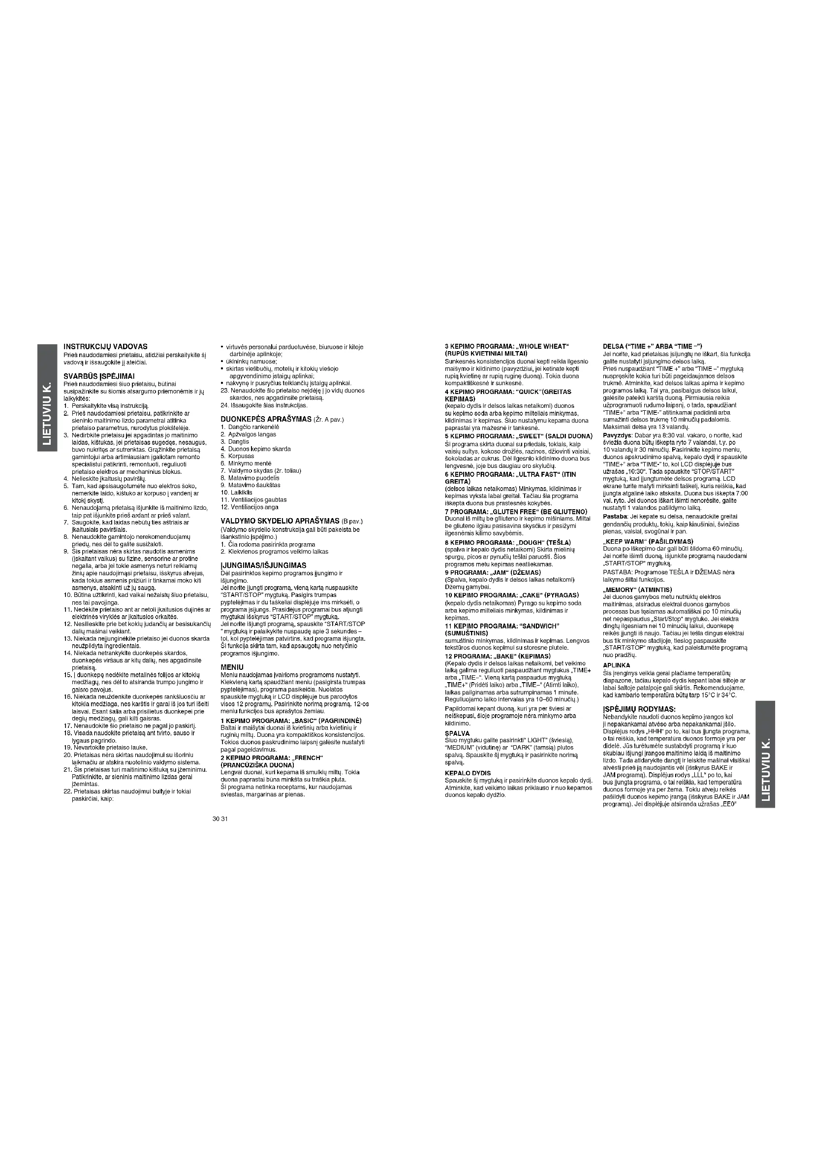 (SUMUŠTINIS) sumuštinio minkymas, kildinimas ir kepimas. Lengvos tekstūros duonos kepimui su storesne plutele. 12 PROGRAMA: „BAKE“ (KEPIMAS) (Kepalo dydis ir delsos laikas netaikomi, bet veikimo laiką galima reguliuoti paspaudžiant mygtukus „TIME+ arba „TIME−“. Vieną kartą paspaudus mygtuką „TIME+“ (Pridėti laiko) arba „TIME−“ (Atimti laiko), laikas pailginamas arba sutrumpinamas 1 minute. Reguliuojamo laiko intervalas yra 10–60 minučių.) Papildomai kepant duoną, kuri yra per šviesi ar neiškepusi, šioje programoje nėra minkymo arba kildinimo. SPALVA Šiuo mygtuku galite pasirinkti“ LIGHT” (šviesią), “MEDIUM” (vidutinę) ar “DARK” (tamsią) plutos spalvą. Spauskite šį mygtuką ir pasirinkite norimą spalvą. KEPALO DYDIS Spauskite šį mygtuką ir pasirinkite duonos kepalo dydį. Atminkite, kad veikimo laikas priklauso ir nuo kepamos duonos kepalo dydžio. DELSA (“TIME +” ARBA “TIME –”) Jei norite, kad prietaisas įsijungtų ne iškart, šia funkcija galite nustatyti įsijungimo delsos laiką. Prieš nuspaudžiant “TIME +” arba “TIME –” mygtuką nuspręskite kokia turi būti pageidaujamos delsos trukmė. Atminkite, kad delsos laikas apima ir kepimo programos laiką. Tai yra, pasibaigus delsos laikui, galėsite pateikti karštą duoną. Pirmiausia reikia užprogramuoti rudumo laipsnį, o tada, spaudžiant “TIME+” arba “TIME-” atitinkamai padidinti arba sumažinti delsos trukmę 10 minučių padalomis. Maksimali delsa yra 13 valandų. Pavyzdys: Dabar yra 8:30 val. vakaro, o norite, kad šviežia duona būtų iškepta ryto 7 valandai, t.y. po 10 valandų ir 30 minučių. Pasirinkite kepimo meniu, duonos apskrudinimo spalvą, kepalo dydį ir spauskite “TIME+” arba “TIME-” to, kol LCD displėjuje bus užrašas „10:30“. Tada spauskite “STOP/START” mygtuką, kad įjungtumėte delsos programą. LCD ekrane turite matyti mirksinti taškelį, kuris reiškia, kad įjungta atgalinė laiko atskaita. Duona bus iškepta 7:00 val. ryto. Jei duonos iškart išimti nenorėsite, galite nustatyti 1 valandos pašildymo laiką. Pastaba: Jei kepate su delsa, nenaudokite greitai gendančių produktų, tokių, kaip kiaušiniai, šviežias pienas, vaisiai, svogūnai ir pan. „KEEP WARM“ (PAŠILDYMAS) Duona po iškepimo dar gali būti šildoma 60 minučių. Jei norite išimti duoną, išjunkite programą naudodami „START/STOP“ mygtuką. PASTABA: Programose TEŠLA ir DŽEMAS nėra laikymo šiltai funkcijos. „MEMORY“ (ATMINTIS) Jei duonos gamybos metu nutrūktų elektros maitinimas, atsiradus elektrai duonos gamybos procesas bus tęsiamas automatiškai po 10 minučių net nepaspaudus „Start/Stop“ mygtuko. Jei elektra dingtų ilgesniam nei 10 minučių laikui, duonkepę reikės įjungti iš naujo. Tačiau jei tešla dingus elektrai bus tik minkymo stadijoje, tiesiog paspauskite „START/STOP“ mygtuką, kad paleistumėte programą nuo pradžių. APLINKA Šis įrenginys veikia gerai plačiame temperatūrų diapazone, tačiau kepalo dydis kepant labai šiltoje ar labai šaltoje patalpoje gali skirtis. Rekomenduojame, kad kambario temperatūra būtų tarp 15°C ir 34°C. ĮSPĖJIMŲ RODYMAS: Nebandykite naudoti duonos kepimo įrangos kol ji nepakankamai atvėso arba nepakankamai įšilo. Displėjus rodys „HHH“ po to, kai bus įjungta programa, o tai reiškia, kad temperatūra duonos formoje yra per didelė. Jūs turėtumėte sustabdyti programą ir kuo skubiau išjungi įrangos maitinimo laidą iš maitinimo lizdo. Tada atidarykite dangtį ir leiskite mašinai visiškai atvėsti prieš ją naudojantis vėl (išskyrus BAKE ir JAM programą). Displėjus rodys „LLL“ po to, kai bus įjungta programa, o tai reiškia, kad temperatūra duonos formoje yra per žema. Tokiu atveju reikės pašildyti duonos kepimo įrangą (išskyrus BAKE ir JAM programą). Jei displėjuje atsiranda užrašas „EE0“ INSTRUKCIJŲ VADOVAS Prieš naudodamiesi prietaisu, atidžiai perskaitykite šį vadovą ir išsaugokite jį ateičiai.