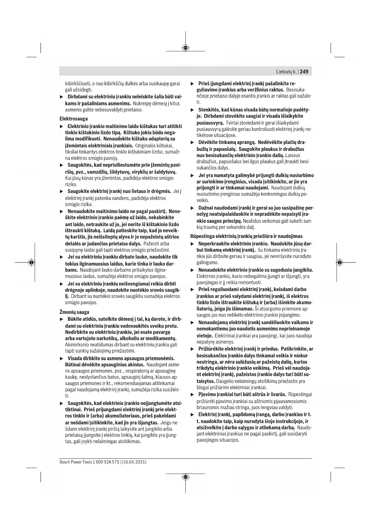 Šioje instrukcijoje pateiktas vibracijos lygis ir triukšmo emisi- ja buvo išmatuoti pagal standartizuotą matavimo metodą, ir juos galima naudoti elektriniams įrankiams palyginti. Jie taip pat skirti vibracijos ir triukšmo emisijai iš anksto įvertinti. Nurodytas vibracijos lygis ir triukšmo emisijos vertė atspindi pagrindinius elektrinio įrankio naudojimo atvejus. Tačiau jei- gu elektrinis įrankis naudojamas kitokiai paskirčiai, su kito- kiais darbo įrankiais arba jeigu jis nepakankamai techniškai prižiūrimas, vibracijos lygis ir triukšmo emisijos vertė gali ki- sti. Tokiu atveju vibracijos ir triukšmo emisija per visą darbo laikotarpį gali žymiai padidėti. Norint tiksliai įvertinti vibracijos ir triukšmo emisiją per tam tikrą darbo laiką, reikia atsižvelgti ir į laiką, per kurį elektrinis įrankis buvo išjungtas arba, nors ir veikė, bet nebuvo naudo- jamas. Tai įvertinus, vibracijos ir triukšmo emisija per visą darbo laiką žymiai sumažės. Dirbančiajam nuo vibracijos poveikio apsaugoti paskirkite papildomas apsaugos priemones, pvz.: elektrinių ir darbo įrankių techninę priežiūrą, rankų šildymą, darbo eigos orga- nizavimą. Montavimas u Prieš atliekant bet kokius elektrinio įrankio reguliavi- mo ar priežiūros darbus reikia ištraukti kištuką iš elektros tinklo lizdo. Frezos variklio įstatymas į įpjaunamąjį/griovelių frezavimo įtaisą ar kopijavimo pagal šabloną įtaisą (žr.A–Bpav.) Atidarykite įpjaunamojo/griovelių frezavimo įtaiso ar kopija- vimo pagal šabloną įtaiso užveržiamąją svirtelę(22). Stumkite frezos variklį iki atyramos į įpjaunamąjį/griovelių frezavimo įtaisą ar kopijavimo pagal šabloną įtaisą. Jei naudojate kopijavimo pagal šabloną įtaisą(3), paspaus- kite užveržiamąją svirtelę(25) ir stumkite frezos variklį(1) kopijavimo pagal šabloną įtaise(3) pagal pageidaujamą pa- dėtį aukštyn arba žemyn, kol užveržiamajai svirtelei(25) jau esant nenuspaustai, jis užsifiksuos vienoje iš 3 angų(26). Uždarykite įpjaunamojo/griovelių frezavimo įtaiso ar kopija- vimo pagal šabloną įtaiso užveržiamąją svirtelę(22). Nustatykite pageidaujamą frezavimo gylį(žr. „Frezavimo gy- lio nustatymas“, Puslapis253). Įpjaunamojo/griovelių frezavimo įtaiso ar kopijavimo pagal šabloną įtaiso frezavimo variklio išėmimas (žr.Cpav.) Atidarykite įpjaunamojo/griovelių frezavimo įtaiso ar kopija- vimo pagal šabloną įtaiso užveržiamąją svirtelę(22). Traukite frezavimo variklį iki atramos ir laikykite jį toje pa- dėtyje. Paspauskite apsauginį mygtuką(21)ir frezavimo variklį išim- kite iš įpjaunamojo/griovelių frezavimo įtaiso ar kopijavimo pagal šabloną įtaiso. Jei naudojate kopijavimo pagal šabloną įtaisą(3) papildomai paspauskite užveržiamąją svirtelę(25). Frezos įstatymas (žr.Dpav.) u Įstatant ar keičiant frezas, rekomenduojama mūvėti apsauginėmis pirštinėmis. Įvairios konstrukcijos ir kokybės frezas galima pasirinkti pa- gal pritaikymo sritį. Frezos iš didelio atsparumo greitapjovio plieno (HSS) yra skirtos minkštoms medžiagoms, pvz., minkštajai medienai ir plastikui, apdoroti. Frezos su kietlydinio ašmenimis (HM) specialiai yra skirtos kietoms ir abrazyvinėms medžiagoms, pvz., kietajai me- dienai ir aliuminiui. Originalias frezas iš plačios Bosch papildomos įrangos prog- ramos galite įsigyti specializuotoje Bosch parduotuvėje. Naudokite tik nepriekaištingos būklės ir švarias frezas. Jei galima, naudokite frezavimo įrankius, kurių koto skersmuo12mm. Frezavimo įrankį galite pakeisti, kai frezos variklis įstatytas į įpjaunamąjį/griovelių frezavimo įtaisą ar kopijavimo pagal ša- bloną įtaisą. Tačiau mes rekomenduojame įrankį keisti, kai frezos variklis yra išimtas. – Išimkite frezos variklį iš įpjaunamojo/griovelių frezavimo įtaiso ar kopijavimo pagal šabloną įtaiso. – Paspauskite suklio fiksuojamąjį klavišą(27) (➊) ir laiky- kite jį paspaustą. Sukite suklį ranka, kol fiksatorius užsifik- suos. Suklio fiksuojamąjį klavišą(27) spauskite tik tada, kai suklys visiškai sustojęs. – Atlaisvinkite gaubiamąją veržlę(17), sukdami veržliarakčiu(28) (rakto plotis 24mm) prieš laikrodžio rodyklę(➋). – Stumkite frezavimo įrankį į suspaudžiamąją įvorę. Freza- vimo įrankio kotas į suspaudžiamąją įvorę turi būti įstum- tas ne mažiau kaip20mm. – Užveržkite gaubiamąją veržlę(17), sukdami veržliarakčiu(28) (rakto plotis 24mm) pagal laikrodžio rodyklę. Atleiskite suklio fiksuojamąjį klavišą(27). u Jei nėra įmontuota kopijavimo įvorė, neįstatykite fre- zos, kurios skersmuo didesnis kaip50mm. Tokie freza- vimo įrankiai netelpa pro pagrindo plokštę. u Jokiu būdu neužveržkite suspaudžiamosios įvorės su gaubiamąja veržle, kol nepritvirtinta jokia freza. Priešingu atveju gali būti pažeista suspaudžiamoji įvorė. Dulkių, pjuvenų ir drožlių nusiurbimas Medžiagų, kurių sudėtyje yra švino, kai kurių rūšių medienos, mineralų ir metalų dulkės gali būti kenksmingos sveikatai. Dirbančiajam arba netoli esantiems asmenims nuo sąlyčio su dulkėmis arba jų įkvėpus gali kilti alerginės reakcijos, taip pat 1 609 92A 57S | (16.04.2021) Bosch Power ToolsLietuvių k. | 253 jie gali susirgti kvėpavimo takų ligomis. Kai kurios dulkės, pvz., ąžuolo ir buko, yra vėžį sukeliančios, o ypač, kai mediena yra apdorota specialiomis medienos priežiūros priemonėmis (chromatu, medienos apsaugos priemonėmis). Medžiagas, kuriose yra asbesto, leidžiama apdoroti tik specialistams. – Jei yra galimybė, naudokite apdirbamai medžiagai tinka- nčią dulkių nusiurbimo įrangą. – Pasirūpinkite geru darbo vietos vėdinimu. – Rekomenduojama dėvėti kvėpavimo takų apsauginę kaukę su P2 klasės filtru. Laikykitės jūsų šalyje galiojančių apdorojamoms medžia- goms taikomų taisyklių. u Saugokite, kad da