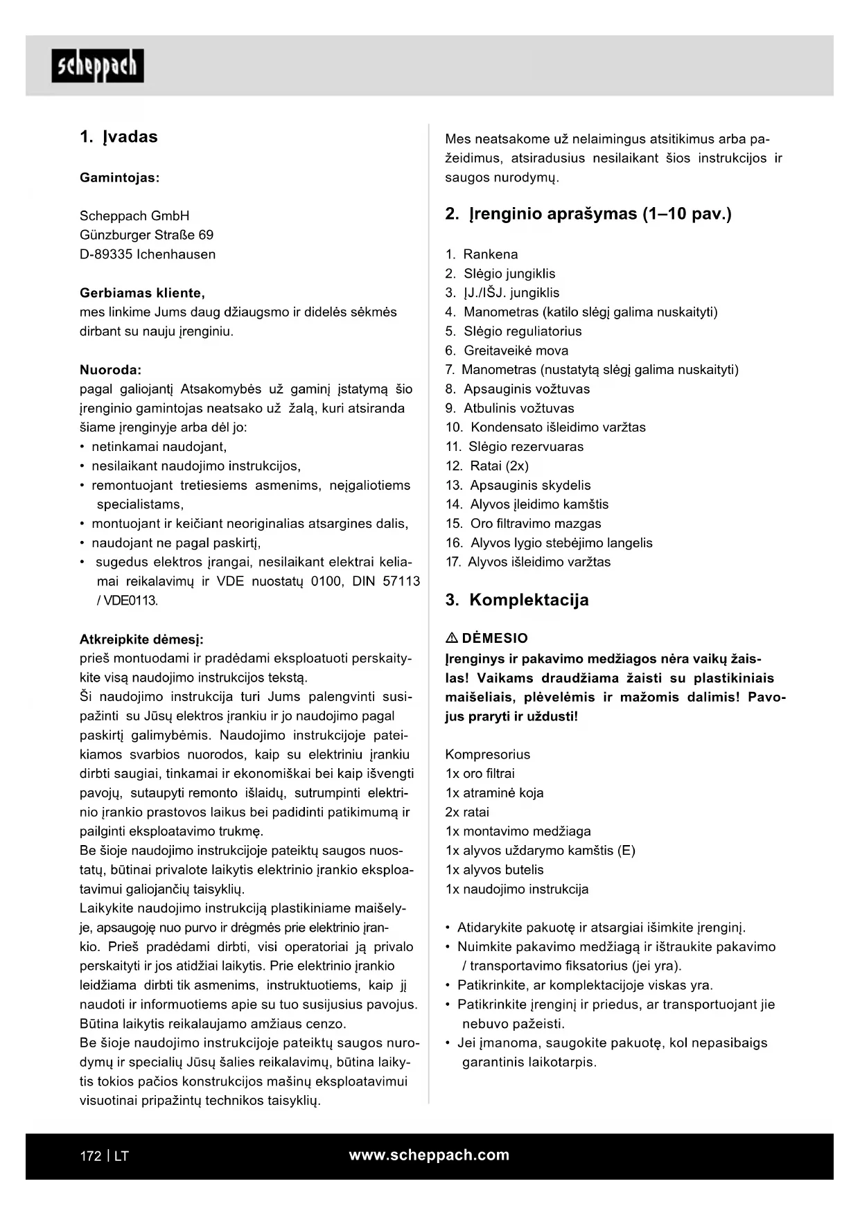 Gamintojas: Scheppach GmbH Günzburger Straße 69 D-89335 Ichenhausen Gerbiamas kliente, mes linkime Jums daug džiaugsmo ir didelės sėkmės dirbant su nauju įrenginiu. Nuoroda: pagal galiojantį Atsakomybės už gaminį įstatymą šio įrenginio gamintojas neatsako už žalą, kuri atsiranda šiame įrenginyje arba dėl jo: