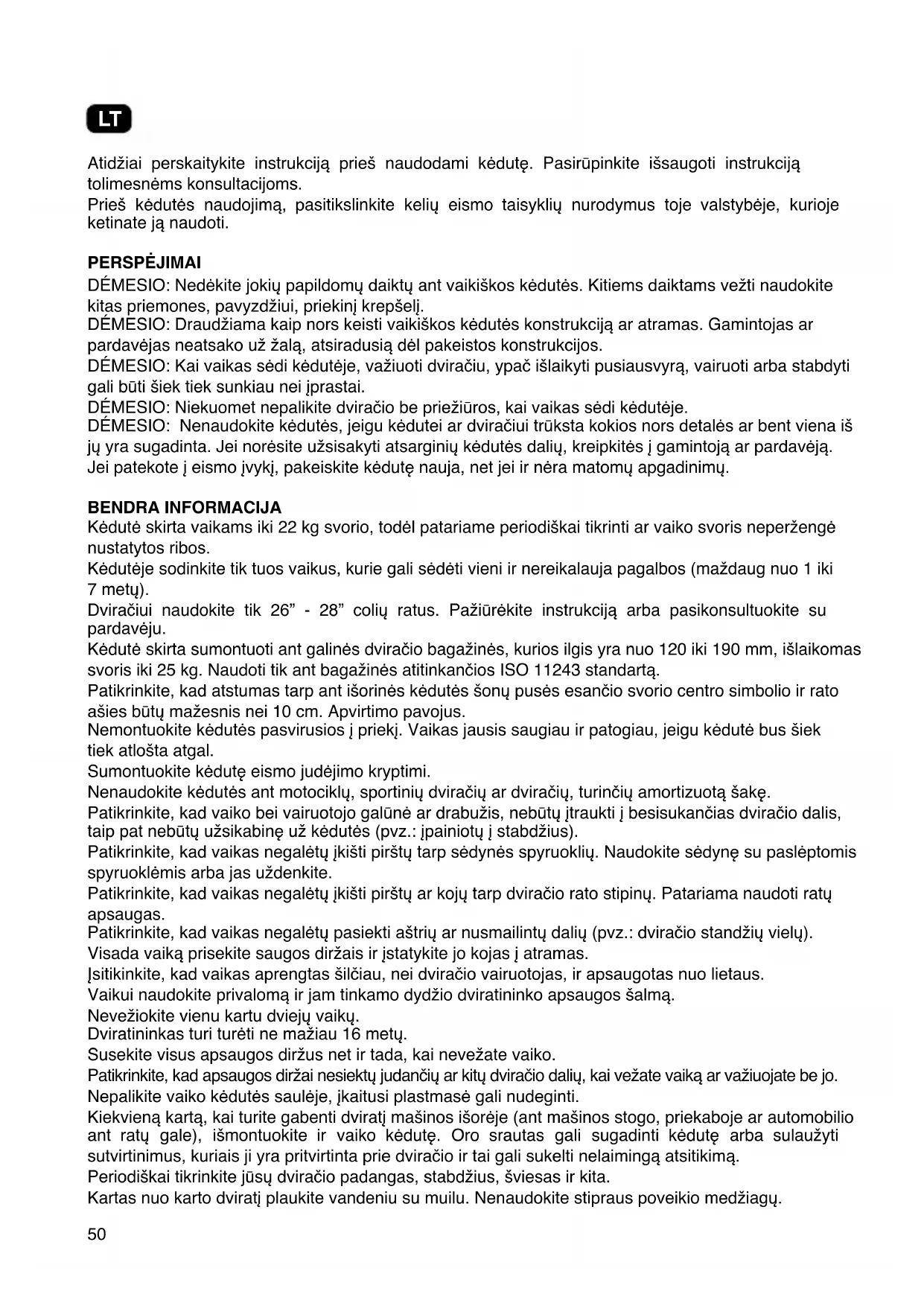 ET50 Atidžiai perskaitykite instrukciją prieš naudodami kėdutę. Pasirūpinkite išsaugoti instrukciją tolimesnėms konsultacijoms. Prieš kėdutės naudojimą, pasitikslinkite kelių eismo taisyklių nurodymus toje valstybėje, kurioje ketinate ją naudoti. PERSPĖJIMAI DÉMESIO: Nedėkite jokių papildomų daiktų ant vaikiškos kėdutės. Kitiems daiktams vežti naudokite kitas priemones, pavyzdžiui, priekinį krepšelį. DÉMESIO: Draudžiama kaip nors keisti vaikiškos kėdutės konstrukciją ar atramas. Gamintojas ar pardavėjas neatsako už žalą, atsiradusią dėl pakeistos konstrukcijos. DÉMESIO: Kai vaikas sėdi kėdutėje, važiuoti dviračiu, ypač išlaikyti pusiausvyrą, vairuoti arba stabdyti gali būti šiek tiek sunkiau nei įprastai. DÉMESIO: Niekuomet nepalikite dviračio be priežiūros, kai vaikas sėdi kėdutėje. DÉMESIO: Nenaudokite kėdutės, jeigu kėdutei ar dviračiui trūksta kokios nors detalės ar bent viena iš jų yra sugadinta. Jei norėsite užsisakyti atsarginių kėdutės dalių, kreipkitės į gamintoją ar pardavėją. Jei patekote į eismo įvykį, pakeiskite kėdutę nauja, net jei ir nėra matomų apgadinimų. BENDRA INFORMACIJA Kėdutė skirta vaikams iki 22 kg svorio, todėl patariame periodiškai tikrinti ar vaiko svoris neperžengė nustatytos ribos. Kėdutėje sodinkite tik tuos vaikus, kurie gali sėdėti vieni ir nereikalauja pagalbos (maždaug nuo 1 iki 7 metų). Dviračiui naudokite tik 26” - 28” colių ratus. Pažiūrėkite instrukciją arba pasikonsultuokite su pardavėju. Kėdutė skirta sumontuoti ant galinės dviračio bagažinės, kurios ilgis yra nuo 120 iki 190 mm, išlaikomas svoris iki 25 kg. Naudoti tik ant bagažinės atitinkančios ISO 11243 standartą. Patikrinkite, kad atstumas tarp ant išorinės kėdutės šonų pusės esančio svorio centro simbolio ir rato ašies būtų mažesnis nei 10 cm. Apvirtimo pavojus. Nemontuokite kėdutės pasvirusios į priekį. Vaikas jausis saugiau ir patogiau, jeigu kėdutė bus šiek tiek atlošta atgal. Sumontuokite kėdutę eismo judėjimo kryptimi. Nenaudokite kėdutės ant motociklų, sportinių dviračių ar dviračių, turinčių amortizuotą šakę. Patikrinkite, kad vaiko bei vairuotojo galūnė ar drabužis, nebūtų įtraukti į besisukančias dviračio dalis, taip pat nebūtų užsikabinę už kėdutės (pvz.: įpainiotų į stabdžius). Patikrinkite, kad vaikas negalėtų įkišti pirštų tarp sėdynės spyruoklių. Naudokite sėdynę su paslėptomis spyruoklėmis arba jas uždenkite. Patikrinkite, kad vaikas negalėtų įkišti pirštų ar kojų tarp dviračio rato stipinų. Patariama naudoti ratų apsaugas. Patikrinkite, kad vaikas negalėtų pasiekti aštrių ar nusmailintų dalių (pvz.: dviračio standžių vielų). Visada vaiką prisekite saugos diržais ir įstatykite jo kojas į atramas. Įsitikinkite, kad vaikas aprengtas šilčiau, nei dviračio vairuotojas, ir apsaugotas nuo lietaus. Vaikui naudokite privalomą ir jam tinkamo dydžio dviratininko apsaugos šalmą. Nevežiokite vienu kartu dviejų vaikų. Dviratininkas turi turėti ne mažiau 16 metų. Susekite visus apsaugos diržus net ir tada, kai nevežate vaiko. Patikrinkite, kad apsaugos diržai nesiektų judančių ar kitų dviračio dalių, kai vežate vaiką ar važiuojate be jo. Nepalikite vaiko kėdutės saulėje, įkaitusi plastmasė gali nudeginti. Kiekvieną kartą, kai turite gabenti dviratį mašinos išorėje (ant mašinos stogo, priekaboje ar automobilio ant ratų gale), išmontuokite ir vaiko kėdutę. Oro srautas gali sugadinti kėdutę arba sulaužyti sutvirtinimus, kuriais ji yra pritvirtinta prie dviračio ir tai gali sukelti nelaimingą atsitikimą. Periodiškai tikrinkite jūsų dviračio padangas, stabdžius, šviesas ir kita. Kartas nuo karto dviratį plaukite vandeniu su muilu. Nenaudokite stipraus poveikio medžiagų. LT51