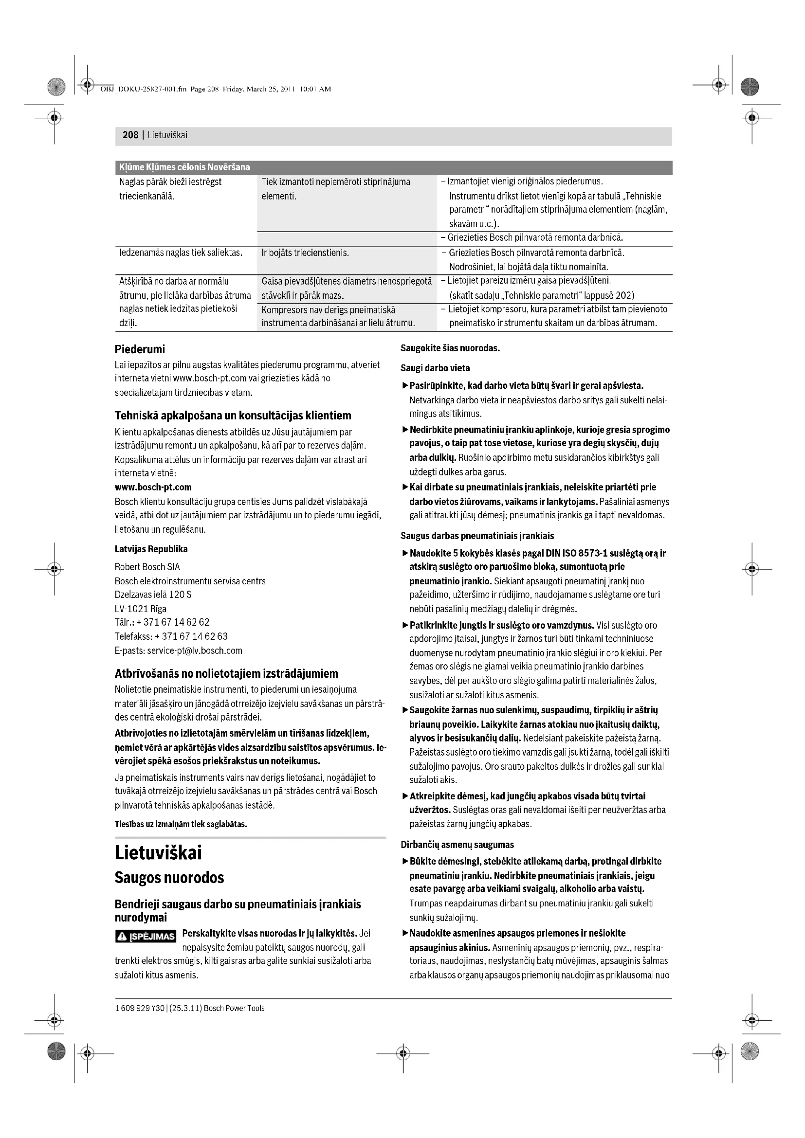 –3 lašus tepimo priemonės įlašinkite į oro tiekimo atvamzdį 6. Nenaudokite per daug tepimo priemonės, nes ji kaupsis pneumatiniame įrankyje ir bus pašalinama per oro išėjimo angą 4. Naudokite tik Bosch rekomenduojamas tepimo priemones. – Mineralinė variklių alyva SAE 10 (jei įrankis naudojamas esant labai šaltam orui) – Mineralinė variklių alyva SAE 20 Tepimo ir valymo medžiagas šalinkite aplinkai nekenksmingu būdu. Vykdykite įstatymų reikalavimus. Techninės priežiūros planas Pasirūpinkite, kad oro išėjimo anga 4, paleidimo saugiklis 2 ir paleidimo mygtukas 10 visada būtų švarūs ir ant jų nebūtų svetimkūnių (dulkių, drožlių, smėlio ir kt.). Išvalykite apkabą 8. Pašalinkite plastiko ir medienos drožles, kurios gali susikaupti apkaboje darbo metu. Pneumatinį įrankį reguliariai valykite suslėgtu oru. Gedimų šalinimas Darbai Kodėl juos reikia atlikti? Atlikimas Kasdien ištuštinti oro išleidimo filtrą. Saugo, kad pneumatiniame įrankyje nesikauptų nešvarumai ir drėgmė. – Atidarykite išleidimo vožtuvą. Tepimo priemonės daviklį visada laikyti pripildytą. Užtikrina pneumatinio įrankio tepimą. – Tepimo priemonės daviklį pripildykite rekomenduojamos tepimo priemonės. (žr. „Pneumatinio įrankio tepimas“, 214 psl.) Išvalyti apkabą 8 ir apkabos stūmiklį 7. Apsaugo vinį nuo užstrigimo. – Apkabos ir apkabos stūmiklio mechanizmą kasdien prapūskite suslėgtu oru. Užtikrinti, kad paleidimo saugiklis 2 tinkamai veiktų. Užtikrina jūsų darbo saugumą ir efektyvų pneumatinio įrankio naudojimą. – Paleidimo saugiklio mechanizmą kasdien prapūskite suslėgtu oru. Tepti pneumatinį įrankį. Mažina pneumatinio įrankio susidėvėjimą. – 2–3 lašus tepimo priemonės įlašinkite į oro tiekimo atvamzdį 6. (žr. „Pneumatinio įrankio tepimas“, 214 psl.) Ištuštinti kompresorių. Saugo, kad pneumatiniame įrankyje nesikauptų nešvarumai ir drėgmė. – Atidarykite kompresoriaus bako išleidimo vožtuvą. Gedimas Priežastis Pašalinimas Pneumatinis įrankis paruoštas naudoti, bet neiššaunama nei viena vinis. Šūvio kanale užstrigo vinis. – Pašalinkite užstrigusį tvirtinimo elementą. (žr. „Užstrigusių tvirtinimo elementų pašalinimas“, 213 psl.) Pažeistas apkabos stūmiklis 7. – Jei reikia, nuvalykite apkabos stūmiklį 7, ir įsitikinkite, kad apkaba 8 neužteršta. Per silpna arba pažeista apkabos stūmiklio spyruoklė. – Susisiekite su įgaliota Bosch klientų aptarnavimo tarnyba. Patikėkite specialistams pakeisti konstrukcinę dalį. Naudojami neleistini tvirtinimo elementai. – Naudokite tik originalią papildomą įrangą. Leidžiama naudoti tik lentelėje „Techniniai duomenys“ nurodytus tvirtinimo elementus (vinis, sąsagėles ir kt.). Tuščia apkaba 8. – Vėl užpildykite apkabą. (žr. „Apkabos užpildymas“, 211 psl.) Vinys iššaunamos tik labai lėtai ir per silpnai. Per žemas tiekiamo suslėgto oro vardinis slėgis. – Padidinkite tiekiamo suslėgto oro slėgį. Neturi būti viršijamas 8bar slėgis. Pažeistas daužiklis. – Naudokite tik Bosch rekomenduojamas tepimo priemones. (žr. „Pneumatinio įrankio tepimas“, 214 psl.) Susidėvėjęs arba pažeistas stūmoklio sandarinamasis žiedas. – Susisiekite su įgaliota Bosch klientų aptarnavimo tarnyba. Patikėkite specialistams pakeisti konstrukcinę dalį. Susidėvėjęs amortizatorius. – Susisiekite su įgaliota Bosch klientų aptarnavimo tarnyba. Patikėkite specialistams pakeisti konstrukcinę dalį. Oro tiekimo žarnos 13 ilgis ir skersmuo neatitinka pateiktų šio pneumatinio įrankio duomenų. – Naudokite tinkamų matmenų oro tiekimo žarną. (žr. „Techniniai duomenys“, 210 psl.) Sulenkta oro tiekimo žarna 13. – Ištiesinkite oro tiekimo žarną. OBJ_DOKU-25827-001.fm Page 214 Friday, March 25, 2011 10:01 AMLietuviškai | 215 Bosch Power Tools 1 609 929 Y30 | (25.3.11) Papildoma įranga Visą kokybiškos papildomos įrangos programą galite rasti internete www.bosch-pt.com arba pasiteirauti specializuotos prekybos atstovo. Klientų aptarnavimo skyrius ir klientų konsultavimo tarnyba Klientų aptarnavimo skyriuje gausite atsakymus į klausimus, susijusius su jūsų gaminio remontu, technine priežiūra bei atsarginėmis dalimis. Detalius brėžinius ir informaciją apie atsargines dalis rasite čia: www.bosch-pt.com Bosch klientų konsultavimo tarnybos specialistai mielai jums patars gaminių ir papildomos įrangos pirkimo, naudojimo bei nustatymo klau- simais. Lietuva Bosch įrankių servisas Informacijos tarnyba: +370 (037) 713350 ļrankių remontas: +370 (037) 713352 Faksas: +370 (037) 713354 El. paštas: service-pt@lv.bosch.com Šalinimas Pneumatinis įrankis, papildomi įtaisai ir pakuotės medžiagos turi būti ekologiškai utilizuojami. Tepimo ir valymo medžiagas šalinkite aplinkai nekenksmingu būdu. Vykdykite įstatymų reikalavimus. Jeigu jūsų pneumatinis įrankis yra nebetinkamas naudoti, prašome jį atiduoti antriniam perdirbimui arba grąžinti į prekybos vietą, t. y. į įgaliotą Bosch klientų aptarnavimo skyrių. Galimi pakeitimai. Vinys įšaunamos per giliai. Per aukštas tiekiamo suslėgto oro vardinis slėgis. – Sumažinkite tiekiamo suslėgto oro slėgį. Slėgis neturi būti žemesnis už 5 bar. Per žemai nustatytas gylio ribotuvas. – Gylio ribotuvą nustatykite pagal pageidaujamą gylį. (žr. „Gylio ribotuvo nustatymas“, 213 psl.) Susidėvėjęs amortizatorius. – Susisiekite su įgaliota Bosch klientų aptarnavimo tarnyba. Patikėkite specialistams pakeisti konstrukcinę dalį. Vinys nepakankamai giliai įšaunamos. Per žemas tiekiamo suslėgto oro vardinis slėgis. – Padidinkite tiekiamo suslėgto oro slėgį. Neturi būti viršijamas 8bar slėgis. Per aukštai nustatytas gylio ribotuvas. – Gylio ribotuvą nustatykite pagal pageidaujamą gylį. (žr. „Gylio ribotuvo nustatymas“, 213 psl.) Oro tiekimo žarnos 13 ilgi