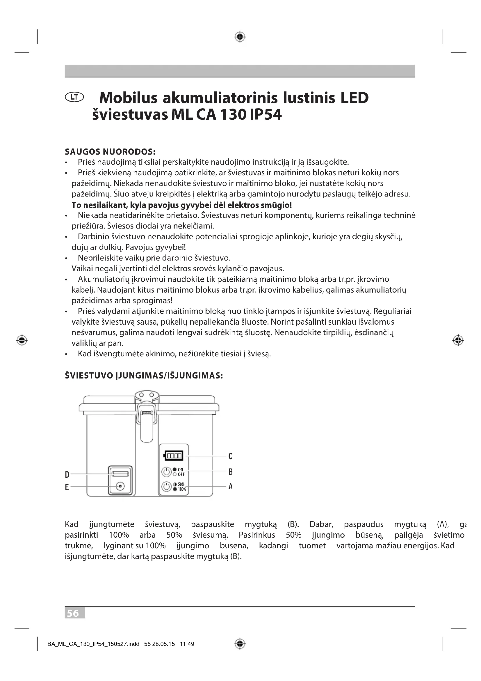 - Kadišvengtumėteakinimo,nežiūrėkitetiesiaiįšviesą. ŠVIESTUVO ĮJUNGIMAS/IŠJUNGIMAS: Kad įjungtumėte šviestuvą, paspauskite mygtuką (B). Dabar, paspaudus mygtuką (A), galima pasirinkti 100% arba 50% šviesumą. Pasirinkus 50% įjungimo būseną, pailgėja švietimo trukmė, lyginantsu100% įjungimo būsena, kadangi tuomet vartojamamažiauenergijos.Kad išjungtumėte,darkartąpaspauskitemygtuką(B).