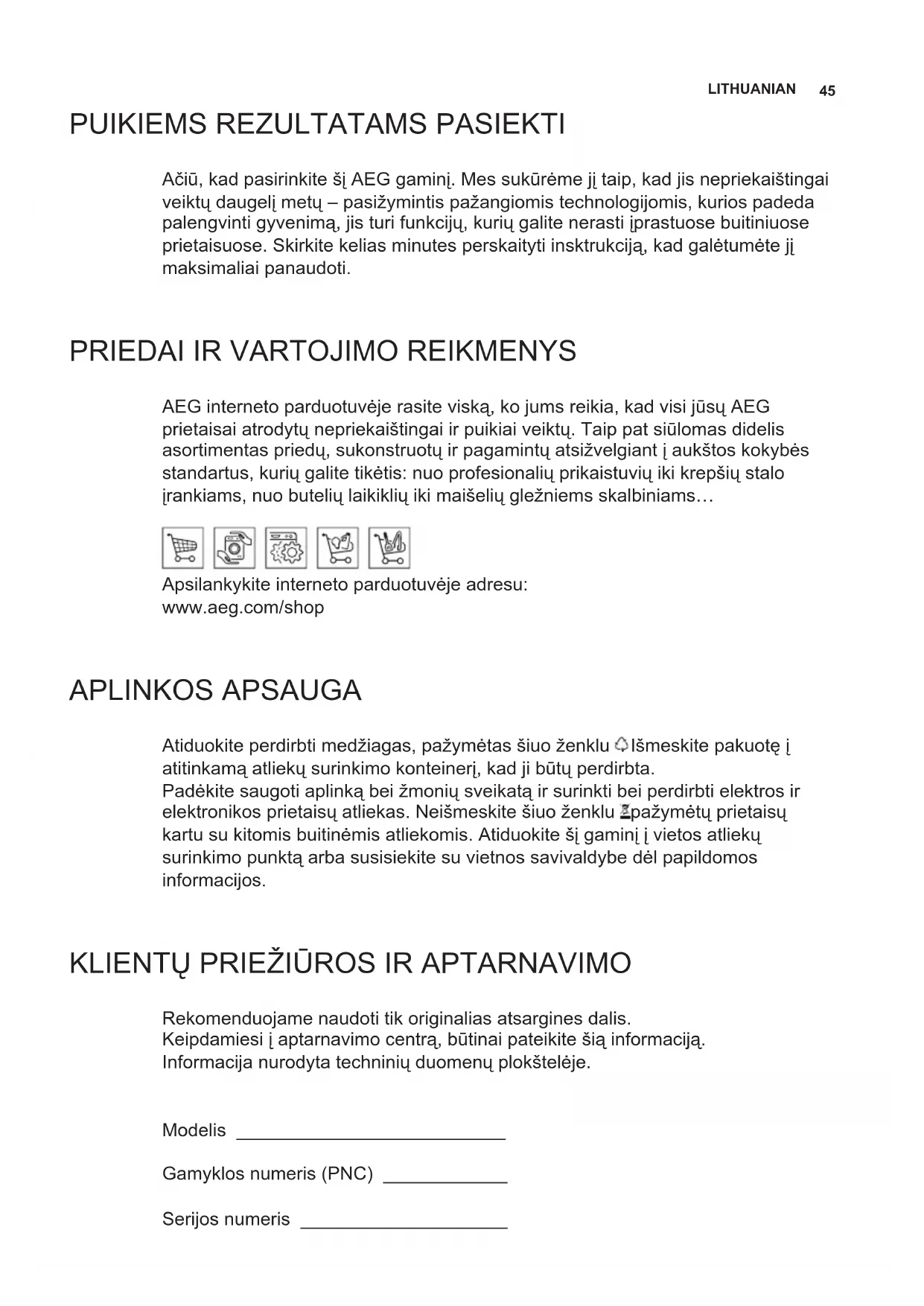AEG interneto parduotuvėje rasite viską, ko jums reikia, kad visi jūsų AEG prietaisai atrodytų nepriekaištingai ir puikiai veiktų. Taip pat siūlomas didelis asortimentas priedų, sukonstruotų ir pagamintų atsižvelgiant į aukštos kokybės standartus, kurių galite tikėtis: nuo profesionalių prikaistuvių iki krepšių stalo įrankiams, nuo butelių laikiklių iki maišelių gležniems skalbiniams… Apsilankykite interneto parduotuvėje adresu: www.aeg.com/shop APLINKOS APSAUGA Atiduokite perdirbti medžiagas, pažymėtas šiuo ženklu . Išmeskite pakuotę į atitinkamą atliekų surinkimo konteinerį, kad ji būtų perdirbta. Padėkite saugoti aplinką bei žmonių sveikatą ir surinkti bei perdirbti elektros ir elektronikos prietaisų atliekas. Neišmeskite šiuo ženklu pažymėtų prietaisų kartu su kitomis buitinėmis atliekomis. Atiduokite šį gaminį į vietos atliekų surinkimo punktą arba susisiekite su vietnos savivaldybe dėl papildomos informacijos.