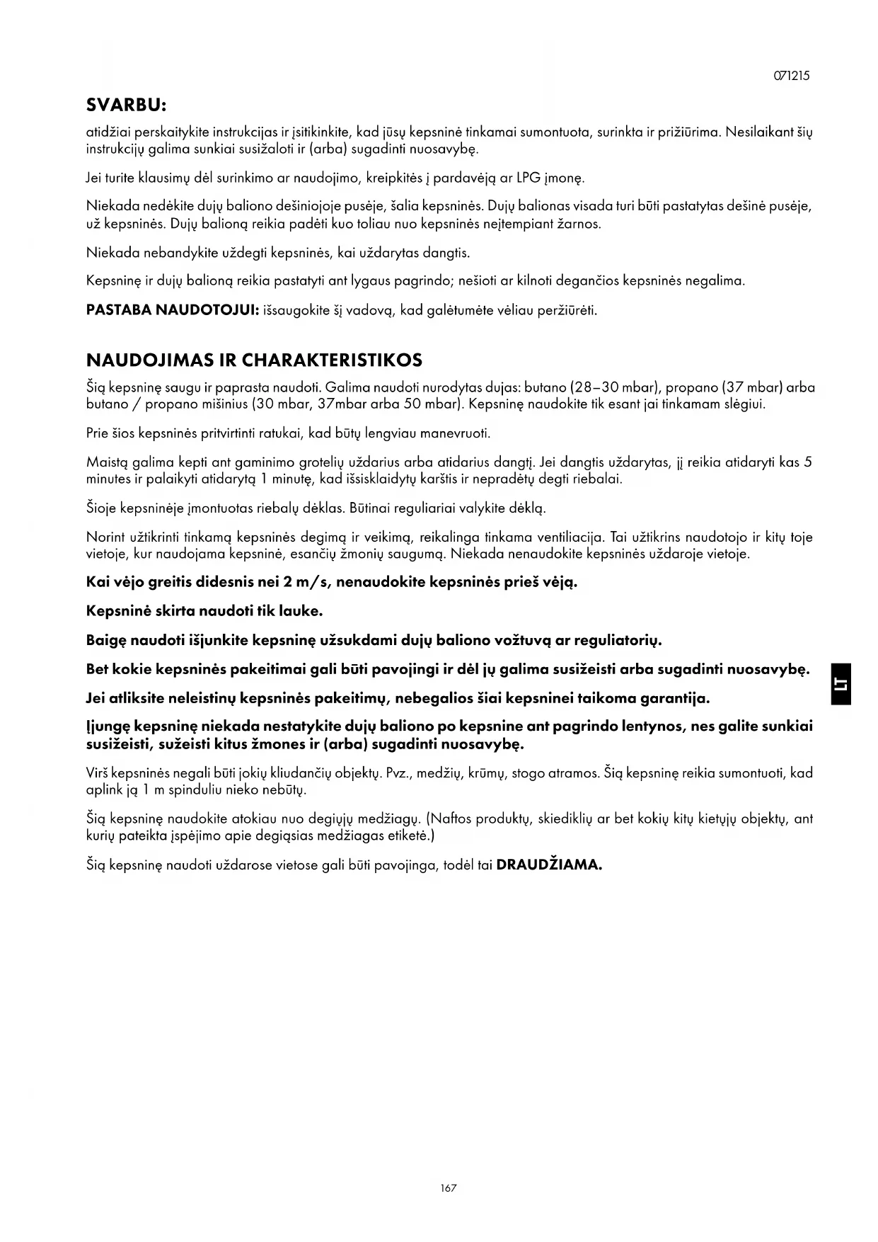 Šią kepsninę saugu ir paprasta naudoti. Galima naudoti nurodytas dujas: butano (28–30 mbar), propano (37 mbar) arba butano / propano mišinius (30 mbar, 37mbar arba 50 mbar). Kepsninę naudokite tik esant jai tinkamam slėgiui. Prie šios kepsninės pritvirtinti ratukai, kad būtų lengviau manevruoti. Maistą galima kepti ant gaminimo grotelių uždarius arba atidarius dangtį. Jei dangtis uždarytas, jį reikia atidaryti kas 5 minutes ir palaikyti atidarytą 1 minutę, kad išsisklaidytų karštis ir nepradėtų degti riebalai. Šioje kepsninėje įmontuotas riebalų dėklas. Būtinai reguliariai valykite dėklą. Norint užtikrinti tinkamą kepsninės degimą ir veikimą, reikalinga tinkama ventiliacija. Tai užtikrins naudotojo ir kitų toje vietoje, kur naudojama kepsninė, esančių žmonių saugumą. Niekada nenaudokite kepsninės uždaroje vietoje. Kai vėjo greitis didesnis nei 2 m/s, nenaudokite kepsninės prieš vėją. Kepsninė skirta naudoti tik lauke. Baigę naudoti išjunkite kepsninę užsukdami dujų baliono vožtuvą ar reguliatorių. Bet kokie kepsninės pakeitimai gali būti pavojingi ir dėl jų galima susižeisti arba sugadinti nuosavybę. Jei atliksite neleistinų kepsninės pakeitimų, nebegalios šiai kepsninei taikoma garantija. Įjungę kepsninę niekada nestatykite dujų baliono po kepsnine ant pagrindo lentynos, nes galite sunkiai susižeisti, sužeisti kitus žmones ir (arba) sugadinti nuosavybę. Virš kepsninės negali būti jokių kliudančių objektų. Pvz., medžių, krūmų, stogo atramos. Šią kepsninę reikia sumontuoti, kad aplink ją 1 m spinduliu nieko nebūtų. Šią kepsninę naudokite atokiau nuo degiųjų medžiagų. (Naftos produktų, skiediklių ar bet kokių kitų kietųjų objektų, ant kurių pateikta įspėjimo apie degiąsias medžiagas etiketė.) Šią kepsninę naudoti uždarose vietose gali būti pavojinga, todėl tai DRAUDŽIAMA. LT168