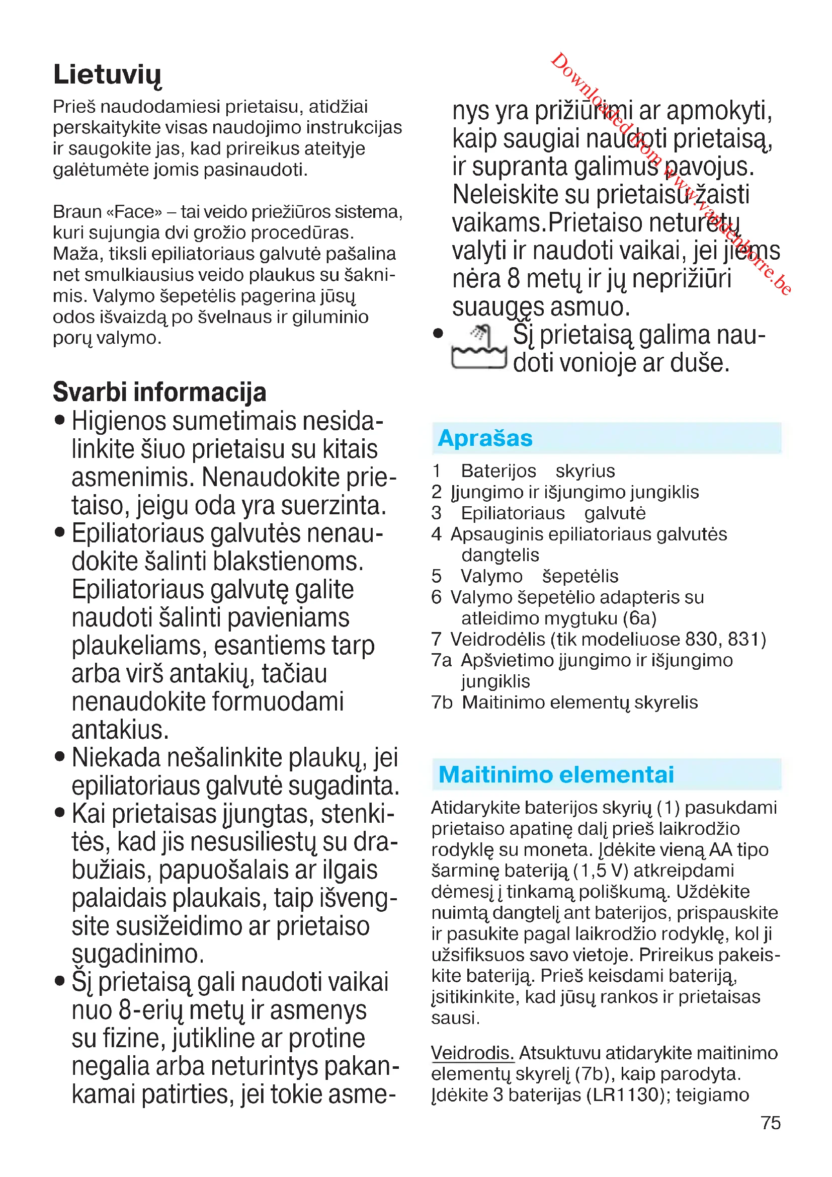 Šį prietaisą galima nau- doti vonioje ar duše. Aprašas 1 Baterijos skyrius 2 Įjungimo ir išjungimo jungiklis 3 Epiliatoriaus galvutė 4 Apsauginis epiliatoriaus galvutės dangtelis 5 Valymo šepetėlis 6 Valymo šepetėlio adapteris su atleidimo mygtuku (6a) 7 Veidrodėlis (tik modeliuose 830, 831) 7a Apšvietimo įjungimo ir išjungimo jungiklis 7b Maitinimo elementų skyrelis Maitinimo elementai Atidarykite baterijos skyrių (1) pasukdami prietaiso apatinę dalį prieš laikrodžio rodyklę su moneta. Įdėkite vieną AA tipo šarminę bateriją (1,5 V) atkreipdami dėmesį į tinkamą poliškumą. Uždėkite nuimtą dangtelį ant baterijos, prispauskite ir pasukite pagal laikrodžio rodyklę, kol ji užsifiksuos savo vietoje. Prireikus pakeis- kite bateriją. Prieš keisdami bateriją, įsitikinkite, kad jūsų rankos ir prietaisas sausi. Veidrodis. Atsuktuvu atidarykite maitinimo elementų skyrelį (7b), kaip parodyta. Įdėkite 3 baterijas (LR1130); teigiamo 96892473_SE810_S4-110.indd 7596892473_SE810_S4-110.indd 75 27.02.14 15:3327.02.14 15:33 CSS APPROVED Effective Date 5Mar2014 GMT - Printed 02Oct2014 Page 75 of 110 Downloaded from www.vandenborre.be76 poliaus ženklas turi būti viršuje. Uždėkite baterijų skyriaus dangtelį. Jeigu ilgą laiką nenaudojate prietaiso arba baterijos tuščios, gali ištekėti bate- rijose esantis elektrolitas. Norėdami išvengti susižalojimo ir prietaiso sugadi- nimo, baterijas išimkite laiku ir stenkitės, kad ištekėjęs elektrolitas nesusiliestų su oda. Veido epiliacija