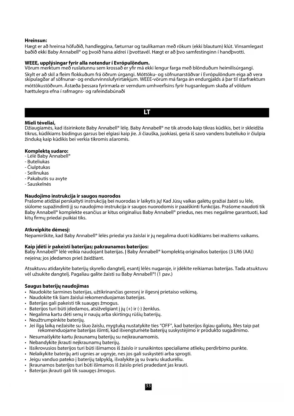 - Sodinimasantnaktipuodžio.Pirmiausialėlę„BabyAnnabell®“reikiapagirdytivandeniu.Lėlę„Baby Annabell®“ pasodinus ant naktipuodžio ir paspaudus širdelę ant pilvuko, lėlė nusišlapina į naktipuodį. Po to lėlę „Baby Annabell®“ reikia kruopščiai išdžiovinti. Energijos taupymo režimas, energijos taupymo režimo pabaiga: Jeigu kurį laiką nežaisite su Baby Annabell® lėle, ji užmigs ir jos kalbėjimo bei judėjimo mechanizmas automatiškai išsijungs. Gavusi savo buteliuką ar žinduką, ji pabus ir vėl ims guguoti. Jei norite vėl įjungti lėlę, svirtelę iš pozicijos „ON“pasukiteįpoziciją„OFF“irtadavėlį„ON“. Kilus problemoms: Baby Annabell® lėlė reaguoja ne taip, kaip aprašyta. Prašome patikrinkite baterijas (žr. 1 ). Ar baterijos tuščios? Ar jos gerai įdėtos? Ar jos teisingai prijungtos? Prireikus, išimkite jas ir vėl įdėkite. Funkcijos neveikia. Išimkite ir vėl įdėkite baterijas, tada vėl įjunkite Baby Annabell® lėlėje „ON” poziciją. Nesigirdi jokių garsų, kad Baby Annabell® lėlė geria iš buteliuko. Įkiškite buteliuką kiek giliau į Baby Annabell® lėlės burnytę. Baby Annabell® lėlė nečiulpia žinduko. Nesigirdi jokių žinduko garsų. Įkiškite žinduką kiek giliau į Baby Annabell® lėlės burnytę.35 Baby Annabell® lėlė negeria iš buteliuko, iš jos burnytės bėga vanduo, nesigirdi jokių garsų, kad ji geria. Įkiškite buteliuką tiksliai į Baby Annabell® lėlės burnytę. Tuo pačiu metu švelniai spauskite buteliuką, kad vanduo nutekėtų į žinduką. Girdant buteliuką reikia pakankamai giliai įkišti į burną. Atkreipkite dėmesį, kad lėlė pati nesiurbia vandens, todėl buteliuką reikia spausti. Lėlė girdoma spaudžiant ir atleidžiant buteliuką. Taip lėlės viduje esantis vandens indas užpildomas tolygiai. Iš Baby Annabell® lėlės burnytės bėga vanduo. Buteliukas yra per toli nuo Baby Annabell® lėlės burnytės arba ji nebenori gerti ir jos ašarų skyrelis yra perpildytas. Baby Annabell® lėlė neverkia. Baby Annabell® neverkia. Buteliukas įkištas į Baby Annabell® burną nepakankamai giliai. Dėl to negali veikti ašarų funkcija, nes įpilta per mažai skysčio. Baby Annabell® verks, tik kai išgers ne mažiau kaip ¼ buteliuke esančio vandens. Lėlė verks tik tada, jei gers tik iš komplekte esančio buteliuko. Baby Annabell® lėlei netyčia davėte atsigerti sulčių ar arbatos. Nedelsdami duokite Baby Annabell® lėlei atsigerti švaraus vandens ir leiskite jai kiek paverkti, kol jos ašaros taps skaidrios. Valymas: Galvą, rankas, kojas ir iš medžiagos pagamintą kūną galima nuvalyti drėgna (nešlapia) šluoste. Baby Annabell® nemaudykite ir neplaukite skalbimo mašinoje. Šliaužtinuką galima išsklabti rankomis. Utilizacija pagal direktyvą dėl elektros ir elektroninės įrangos atliekų. Visi produktai, paženklinti perbrauktu atliekų konteineriu, negali būti išmetami kartu su neišrūšiotomis atliekomis. Tokie produktai turi būti surenkami atskirai. Pakartotinio atliekų perdirbimo bendrovės šiuo tikslu įsteigė atliekų surinkimo punktus, į kuriuos nemokamai galima pristatyti įrengimų atliekas iš privačių namų ūkių. Netinkamaiutilizavusatliekas,išelektrosirelektroniniųprietaisųįaplinkągaliišsiskirtinuodingosmedžiagos.