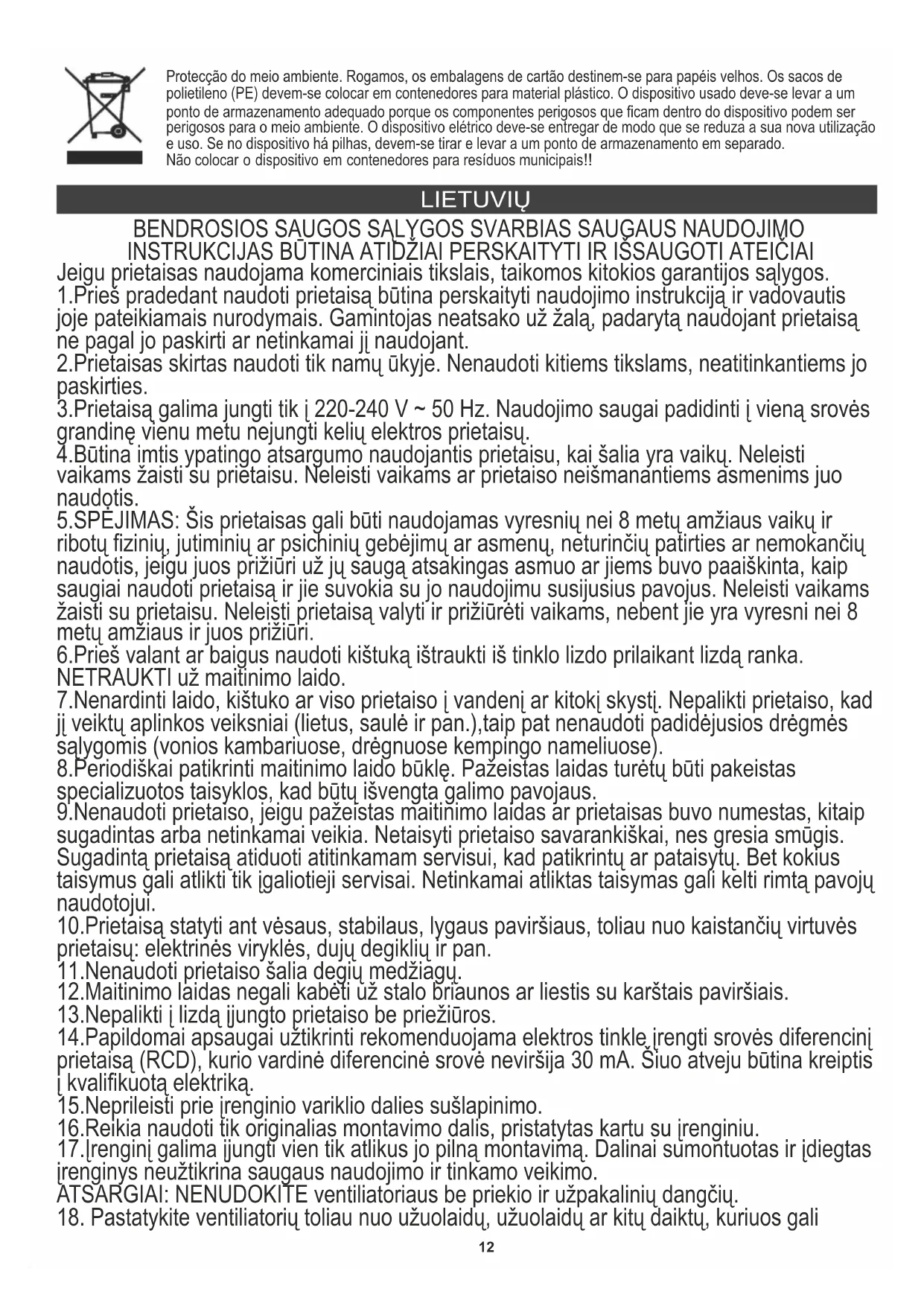 Protecção do meio ambiente. Rogamos, os embalagens de cartão destinem-se para papéis velhos. Os sacos de polietileno (PE) devem-se colocar em contenedores para material plástico. O dispositivo usado deve-se levar a um ponto de armazenamento adequado porque os componentes perigosos que ficam dentro do dispositivo podem ser perigosos para o meio ambiente. O dispositivo elétrico deve-se entregar de modo que se reduza a sua nova utilização e uso. Se no dispositivo há pilhas, devem-se tirar e levar a um ponto de armazenamento em separado. Não colocar o dispositivo em contenedores para resíduos municipais!! LIETUVIŲ13 traukti darbinis ventiliatorius.