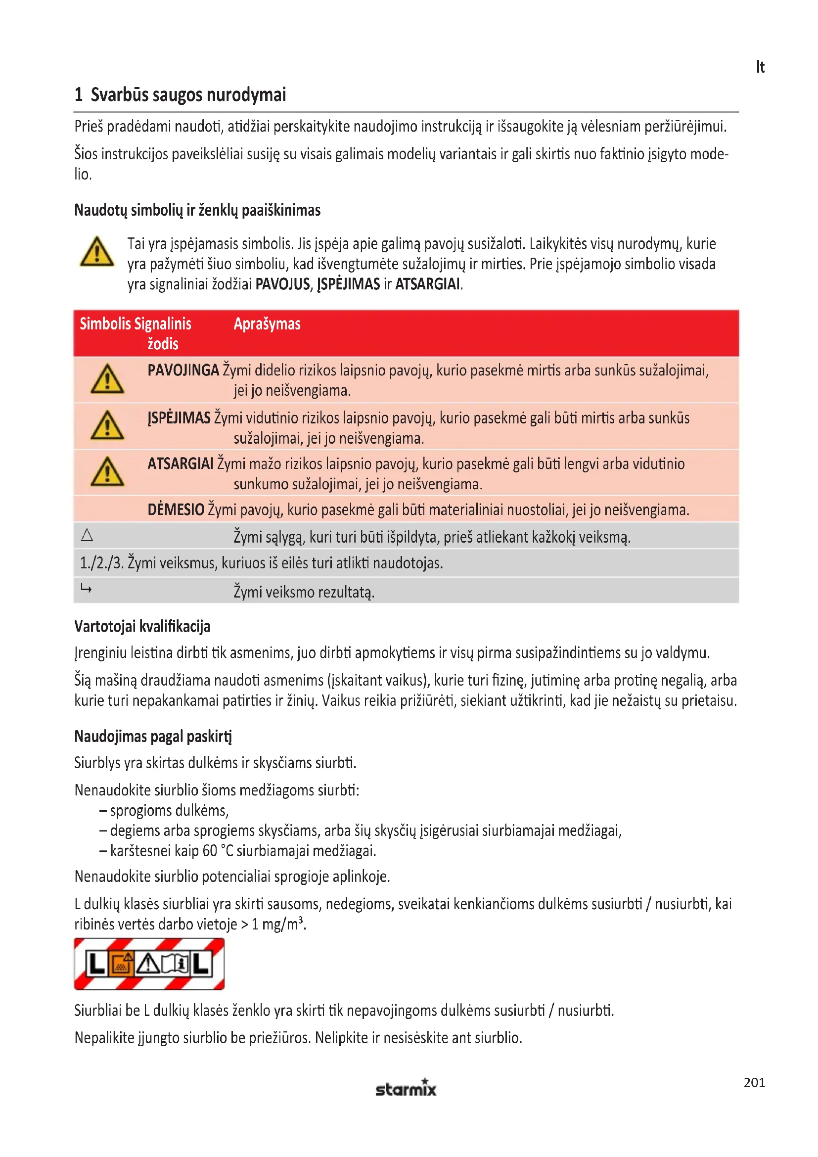 Siurbliai be L dulkiuj klases zenklo yra skirti tik nepavojingoms dulkems susiarbti / nusiurbti.