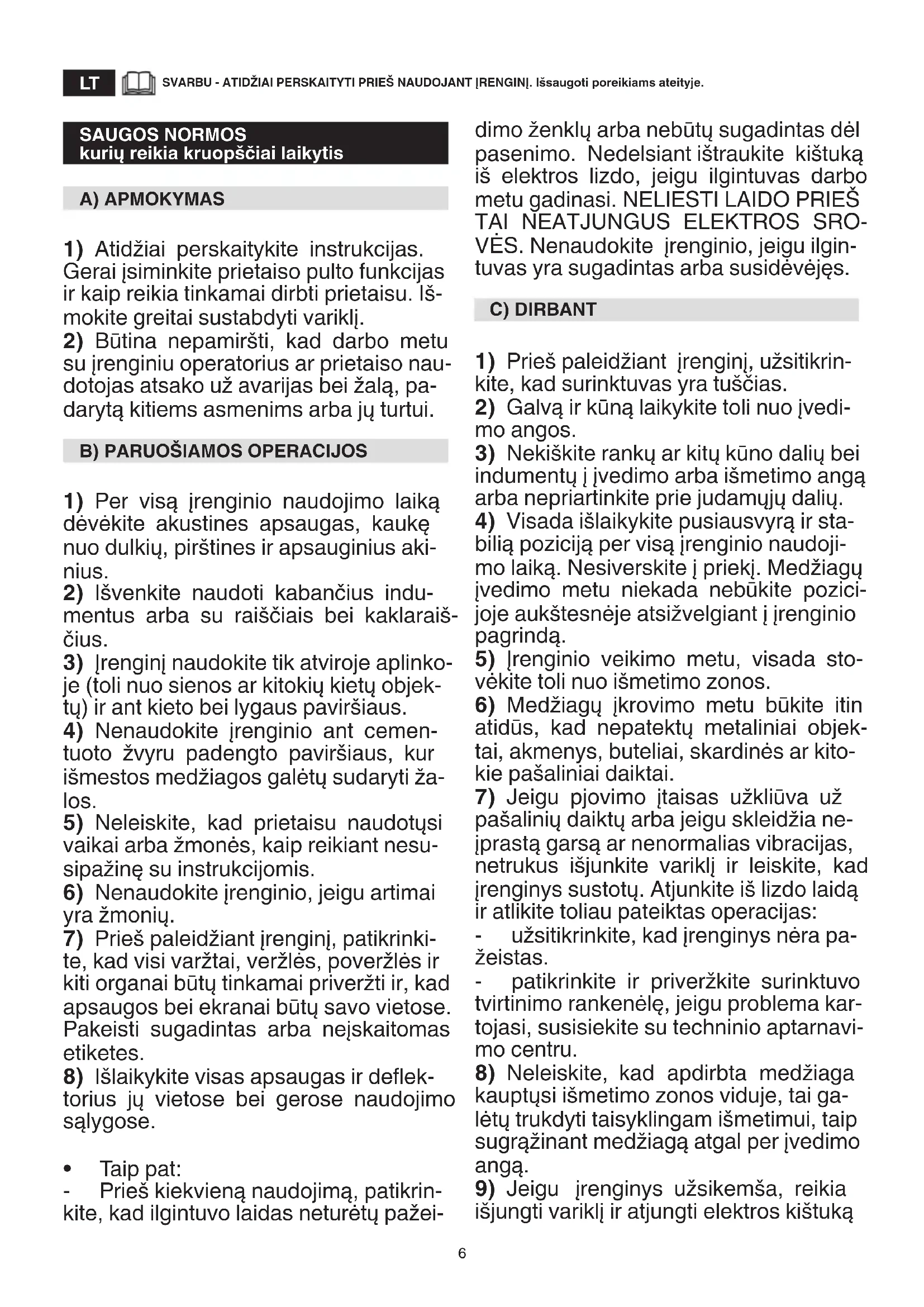 - Taip pat: - Nenaudokite įrenginio, jeigu jungiklis yra defektuotas ir nėra įmanoma regulia- riai įjungti ir išjungti įrenginio. - Nelieskite ilgintuvo laido ir kištuko šlapiomis rankomis. - Nemindžiokite ir netampykite ilgintu- vo laido. - Sustabdykite įrenginį ir atjunkite maitinimo laidą: - kaskart, kai įrenginys paliekamas be priežiūros; - prieš pašalinant užsiblokavimo priežastis arba ištuštinant iškrovimo kanalą; DĖMESIO – Lūžimo arba nelaimingų at- sitikimų atveju darbo metu, netrukus iš- junkite variklį; atvejais, kai yra sudaromi nuostoliai su asmeniniais sužalojimais patiems arba tretiesiems, veikite pirmo- sios pagalbos procedūromis ir kreipkitės į Sanitarinę Įstaigą reikalingam gydymui. D) PRIEŽIŪRA IR SANDĖLIAVIMAS