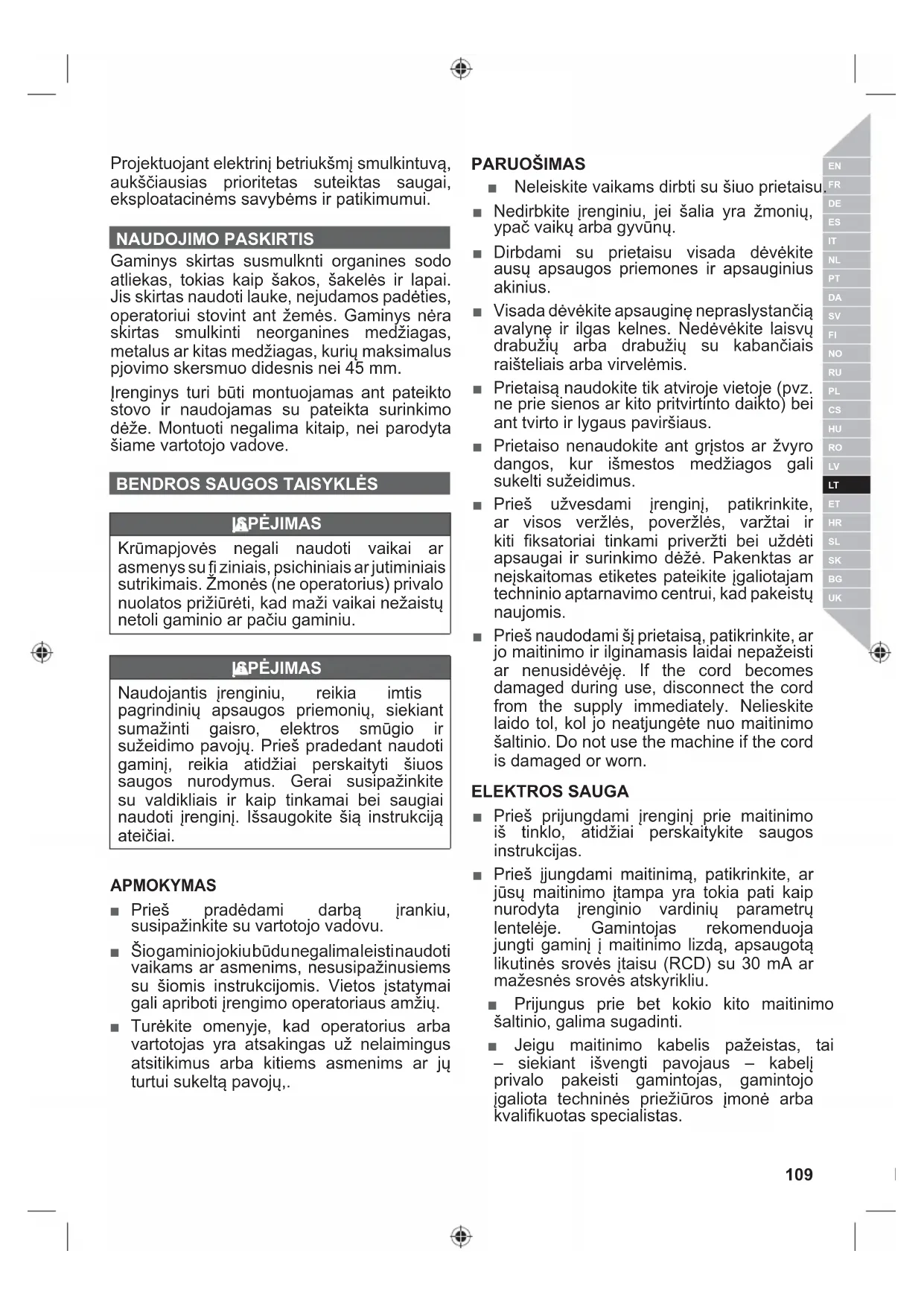Pjovimo jtaisas traumatica sakas ir stiebus j irenginj. Prasidejus padavimui, nebandykite stabdyti smulkinti paduodamos medziagos. Idedant medziaga j gaminj, butina muveti pirstines, kad nesusidraskytu oda.