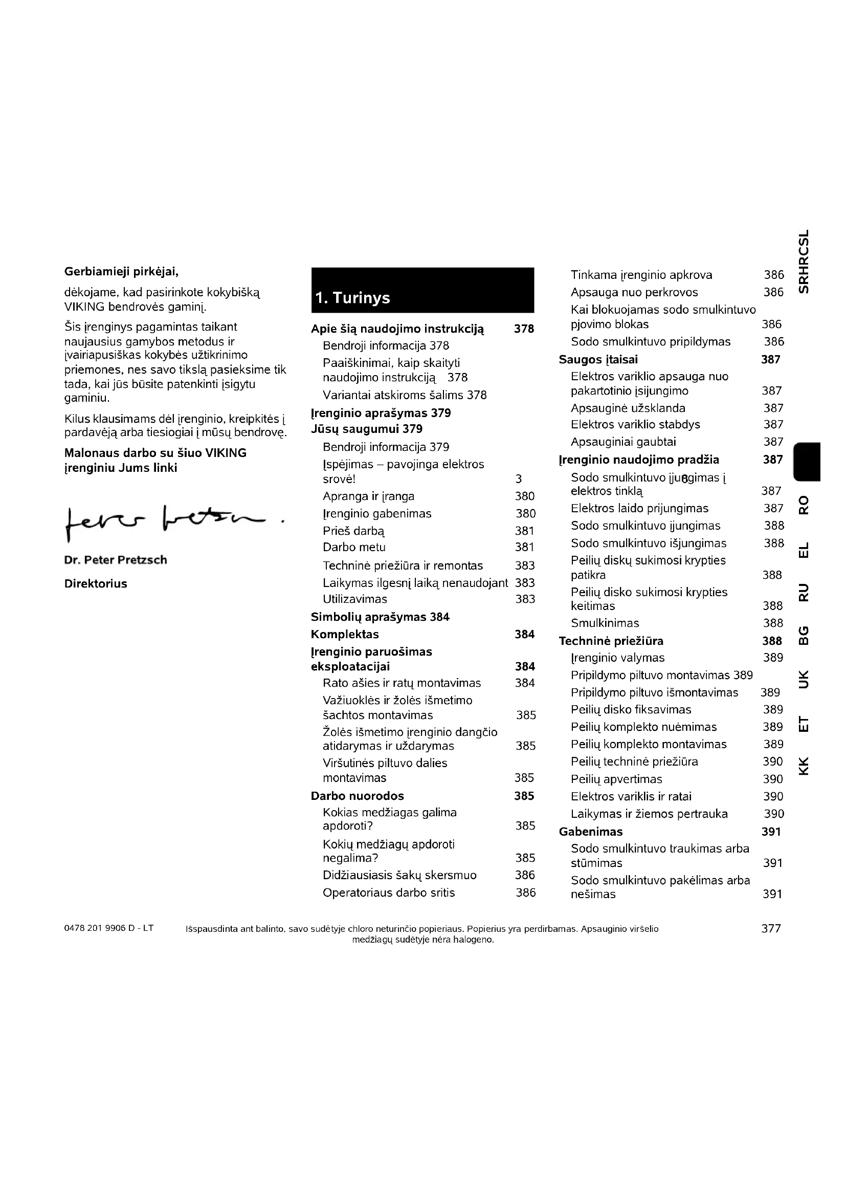 SRHRCSLVLT 0478 201 9906 D - LT ROELRUBGUKETKK Gerbiamieji pirkėjai, dėkojame, kad pasirinkote kokybišką VIKING bendrovės gaminį. Šis įrenginys pagamintas taikant naujausius gamybos metodus ir įvairiapusiškas kokybės užtikrinimo priemones, nes savo tikslą pasieksime tik tada, kai jūs būsite patenkinti įsigytu gaminiu. Kilus klausimams dėl įrenginio, kreipkitės į pardavėją arba tiesiogiai į mūsų bendrovę. Malonaus darbo su šiuo VIKING įrenginiu Jums linki Direktorius Išspausdinta ant balinto, savo sudėtyje chloro neturinčio popieriaus. Popierius yra perdirbamas. Apsauginio viršelio medžiagų sudėtyje nėra halogeno.