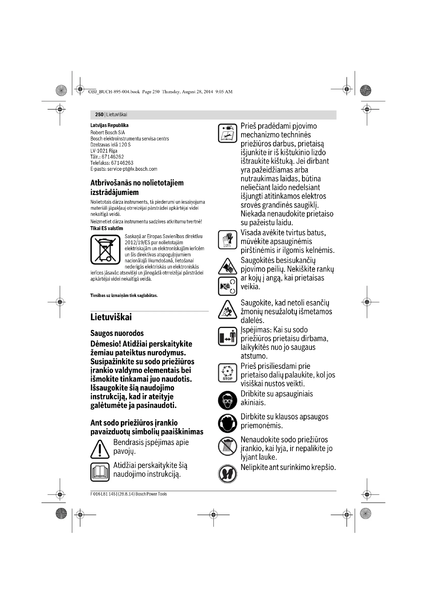 rsegi un aizsargierīces. Pirms instrumenta lietošanas no- drošiniet, lai tam tiktu veikti visi vajadzīgie apkalpošanas un remonta darbi. Ja, neraugoties uz augsto izgatavošanas kvalitāti un rūpīgo pēcražošanas pārbaudi, dārza instruments tomēr sabojājas, tas remontējams firmas Bosch pilnvarotā dārza instrumentu remonta darbnīcā. Spiedplāksnes izņemšana (attēls J) Uzmanību! Pirms apkalpošanas vai tīrīšanas izslēdziet dārza instrumentu un atvienojiet tā kontaktdakšu no elektrotīkla. Rīkojieties šādi arī tad, ja elektrokabelis ir bojāts, pārgriezts vai samezglojies. Strādājot ar dārza instrumentu, kā arī, veicot tā apkalpošanu vai tīrīšanu, vienmēr uzvelciet aizsargcimdus. Normāli lietojot un regulējot instrumentu atbilstoši šeit sniegtajiem norādījumiem, griezējveltnis 16 un spiedplāksne 15 spēj kalpot daudzus gadus. Lai spiedplāksnes 15 tīrīšanas vai nomaiņas gadījumā to izņemtu, rīkojieties šādi. Spiedplāksne 15 jāiestiprina pretē jā secībā un pēc tam jāveic tās regulēšana (skatīt sadaļu „Spiedplāksnes regulēšana (attēls H)“). Apkope pēc darba un uzglabāšana Zaru smalcinātāju nedrīkst tīrīt ar augstspiediena tīrītāju vai mazgāt tekošā ūdenī. Pamatīgi notīriet dārza instrumenta ārējās virsmas ar mīkstu suku un audumu. Nelietojiet tīrīšanai ūdeni, šķīdinātājus un pulēšanas līdzekļus. Attīriet zāles paliekas un nosēdumus, īpaši rūpīgi iztīrot ventilācijas atveres 3. Uzglabājiet dārza instrumentu sausā vietā. Nenovietojiet uz dārza instrumenta citus priekšmetus. Elektrokabeli var uzglabāt, ievietojot zaru smalcinātājā (tikai Apvienotajai Karalistei). (att ēls K). Zaru smalcinātāju var uzglabāt ar noņemtu ievadpiltuvi, kā parādīts attēlā B (skatīt arī sadaļu „Ievadpiltuves montāža (attēli E–F)“). Klientu konsultāciju dienests un konsultācijas par lietošanu www.bosch-garden.com Pieprasot konsultācijas un pasūtot rezerves daļas, lūdzam noteikti paziņot desmitzīmju pasūtījuma numuru, kas norādīts uz dārza instrumenta marķējuma plāksnītes. Sasmalcināmais materiāls netiek ievilkts instrumentā Sasmalcināmais materiāls ir mitrs un mīksts Lietojiet bīdītāju sasmalcināmā materiāla iebīdīšanai dārza instrumentā Sasmalcināmais materiāls iestrēgst dārza instrumentā Izvelciet iestrēgušo materiālu (vienmēr uzvelciet dārznieka aizsargcimdus) Nospiediet dzelteno virzienmaiņas taustiņu (skatīt sadaļu „Darbī bas virziena maiņa“) Materiāls netiek pilnīgi sasmalcināts un veido „krelles“ Veiciet spiedplāksnes regulēšanu skatīt sadaļu „Spiedplāksnes regulēšana (attēls H)“ Starp griezējveltni un spiedplāksni iestrēgušo sasmalcināmo materiālu nav iespējams izbrīvēt, nospiežot virzienmaiņas taustiņu Nav pareizi noregulēta spiedplāksne Nospiediet regulējošo rokturi 10, ievietojiet sešstūra stieņatslēgu 17 (5 mm – neietilpst piegādes komplektā) regulējošās skrūves galvas padziļinājumā un atbrīvojiet spiedplāksni, griežot skrūvi pretēji pulksteņa rād ītāju kustības virzienam (attēls I) Pēc iestrēgušā materiāla izvilkšanas no jauna noregulējiet spiedplāksni (skatīt sadaļu „Spiedplāksnes regulēšana (attēls H)“) Pazīme Iespējamais cēlonis Novēršana Pilnīgi izskrūvējiet spiedplāksnes skrūvi, kā parādīts attēlā. Ar skrūvgrieža palīdzību paceliet un izņemiet spiedplāksni 15. OBJ_BUCH-895-004.book Page 249 Thursday, August 28, 2014 9:05 AM250 | Lietuviškai F 016 L81 145 | (28.8.14) Bosch Power Tools Latvijas Republika Robert Bosch SIA Bosch elektroinstrumentu servisa centrs Dzelzavas ielā 120 S LV-1021 Rīga Tālr.: 67146262 Telefakss: 67146263 E-pasts: service-pt@lv.bosch.com Atbrīvošanās no nolietotajiem izstrādājumiem Nolietotais dārza instruments, tā piederumi un iesaiņojuma materiāli jāpakļauj otrreizējai pārstrādei apkārtējai videi nekaitīgā veidā. Neizmetiet dārza instrumentu sadzīves atkritumu tvertnē! Tikai ES valstīm Saskaņā ar Eiropas Savienības direktīvu 2012/19/ES par nolietotajām elektriskajām un elektroniskajām ierīcēm un šīs direktīvas atspoguļojumiem nacionālajā likumdošanā, lietošanai nederīgās elektriskās un elektroniskās ierīces jāsavāc atsevišķi un jānogādā otrreizējai pā rstrādei apkārtējai videi nekaitīgā veidā. Tiesības uz izmaiņām tiek saglabātas. Lietuviškai Saugos nuorodos Dėmesio! Atidžiai perskaitykite žemiau pateiktus nurodymus. Susipažinkite su sodo priežiūros įrankio valdymo elementais bei išmokite tinkamai juo naudotis. Išsaugokite šią naudojimo instrukciją, kad ir ateityje galėtumėte ja pasinaudoti. Ant sodo priežiūros įrankio pavaizduotų simbolių paaiškinimas Bendrasis įspėjimas apie pavojų. Atidžiai perskaitykite šią naudojimo instrukciją. Prieš pradėdami pjovimo mechanizmo techninės priežiūros darbus, prietaisą išjunkite ir iš kištukinio lizdo ištraukite kištuką. Jei dirbant yra pažeidžiamas arba nutraukimas laidas, būtina neliečiant laido nedelsiant išjungti atitinkamos elektros srovės grandinės saugiklį. Niekada nenaudokite prietaiso su pažeistu laidu. Visada avėkite tvirtus batus, mūvėkite apsauginėmis pirštinėmis ir ilgomis kelnėmis. Saugokitės besisukančių pjovimo peilių. Nekiškite rankų ar kojų į angą, kai prietaisas veikia. Saugokite, kad netoli esančių žmonių nesužalotų išmetamos dalelės. Įspėjimas: Kai su sodo priežiūros prietaisu dirbama, laikykitės nuo jo saugaus atstumo. Prieš prisiliesdami prie prietaiso dalių palaukite, kol jos visiškai nustos veikti. Dribkite su apsauginiais akiniais. Dirbkite su klausos apsaugos priemonėmis. Nenaudokite sodo priežiūros įrankio, kai lyja, ir nepalikite jo lyjant lauke. Nelipkite ant surinkimo krepšio. OBJ_BUCH-895-004.book Page 250 Thursday, August 28, 2014 9:05 AMLietuvi