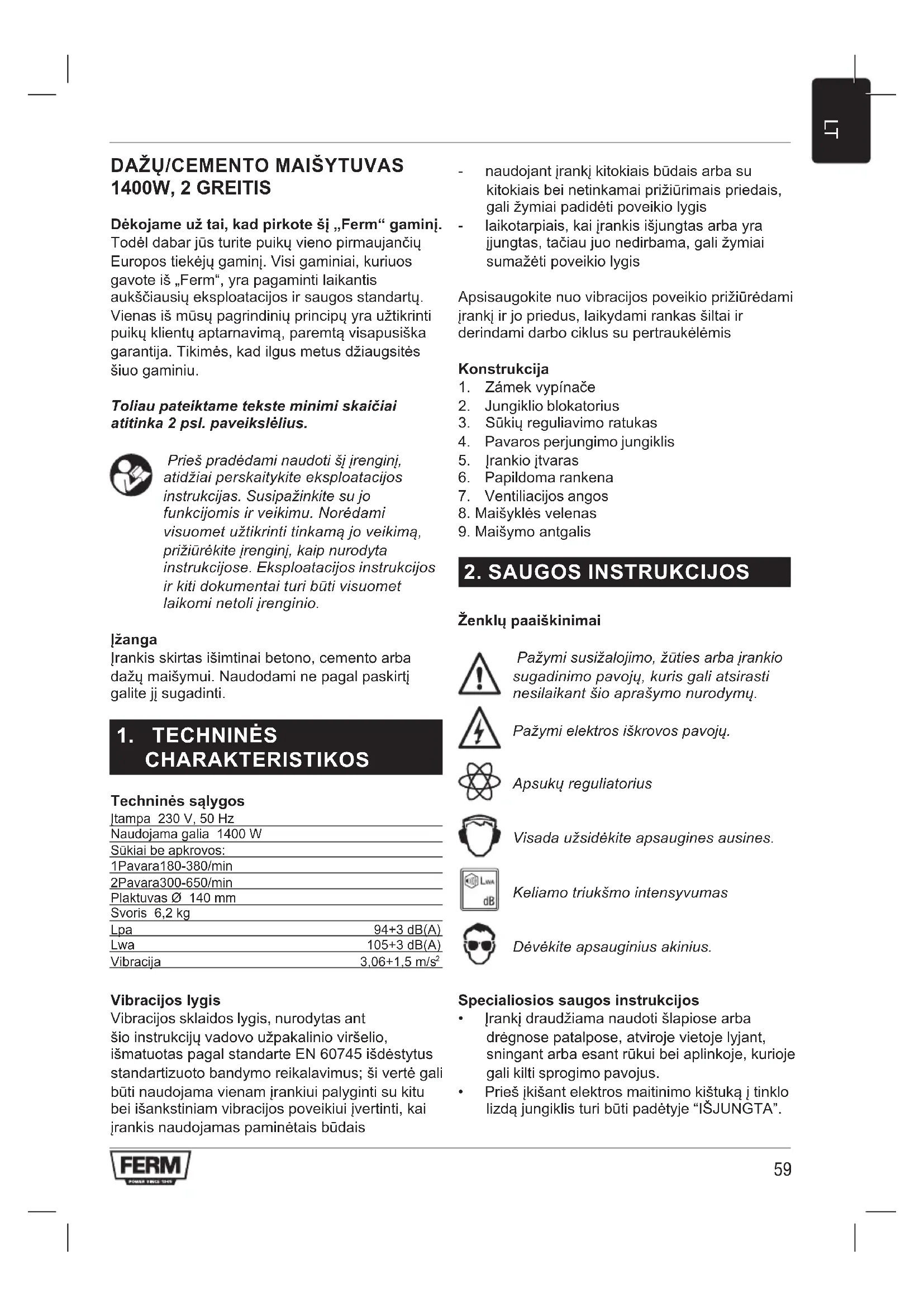 1400W, 2 GREITIS Dėkojame už tai, kad pirkote šį „Ferm“ gaminį. Todėl dabar jūs turite puikų vieno pirmaujančių Europos tiekėjų gaminį. Visi gaminiai, kuriuos gavote iš „Ferm“, yra pagaminti laikantis aukščiausių eksploatacijos ir saugos standartų. Vienas iš mūsų pagrindinių principų yra užtikrinti puikų klientų aptarnavimą, paremtą visapusiška garantija. Tikimės, kad ilgus metus džiaugsitės šiuo gaminiu. Toliau pateiktame tekste minimi skaičiai atitinka 2 psl. paveikslėlius. Priešpradėdaminaudotišįįrenginį, atidžiaiperskaitykiteeksploatacijos instrukcijas.Susipažinkitesujo funkcijomisirveikimu.Norėdami visuometužtikrintitinkamąjoveikimą, prižiūrėkiteįrenginį,kaipnurodyta instrukcijose. Eksploatacijos instrukcijos irkitidokumentaituribūtivisuomet laikominetoliįrenginio. Įžanga Įrankis skirtas išimtinai betono, cemento arba dažų maišymui. Naudodami ne pagal paskirtį galite jį sugadinti.