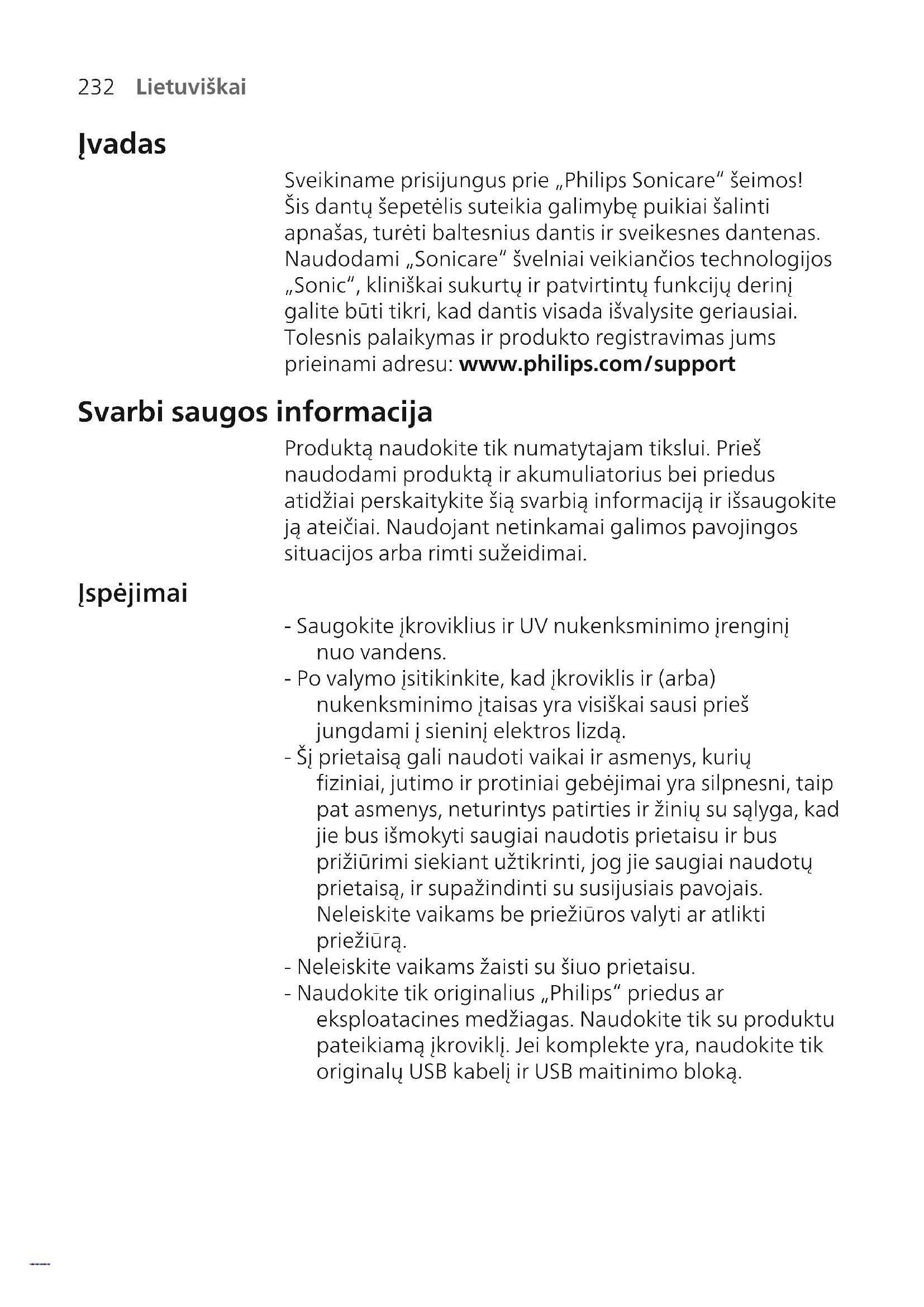 Lietuviškai Įvadas Sveikiname prisijungus prie „Philips Sonicare“ šeimos! Šis dantų šepetėlis suteikia galimybę puikiai šalinti apnašas, turėti baltesnius dantis ir sveikesnes dantenas. Naudodami „Sonicare“ švelniai veikiančios technologijos „Sonic“, kliniškai sukurtų ir patvirtintų funkcijų derinį galite būti tikri, kad dantis visada išvalysite geriausiai. Tolesnis palaikymas ir produkto registravimas jums prieinami adresu: www.philips.com/support Svarbi saugos informacija Produktą naudokite tik numatytajam tikslui. Prieš naudodami produktą ir akumuliatorius bei priedus atidžiai perskaitykite šią svarbią informaciją ir išsaugokite ją ateičiai. Naudojant netinkamai galimos pavojingos situacijos arba rimti sužeidimai. Įspėjimai - Saugokite įkroviklius ir UV nukenksminimo įrenginį nuo vandens. - Po valymo įsitikinkite, kad įkroviklis ir (arba) nukenksminimo įtaisas yra visiškai sausi prieš jungdami į sieninį elektros lizdą. - Šį prietaisą gali naudoti vaikai ir asmenys, kurių fiziniai, jutimo ir protiniai gebėjimai yra silpnesni, taip pat asmenys, neturintys patirties ir žinių su sąlyga, kad jie bus išmokyti saugiai naudotis prietaisu ir bus prižiūrimi siekiant užtikrinti, jog jie saugiai naudotų prietaisą, ir supažindinti su susijusiais pavojais. Neleiskite vaikams be priežiūros valyti ar atlikti priežiūrą. - Neleiskite vaikams žaisti su šiuo prietaisu. - Naudokite tik originalius „Philips“ priedus ar eksploatacines medžiagas. Naudokite tik su produktu pateikiamą įkroviklį. Jei komplekte yra, naudokite tik originalų USB kabelį ir USB maitinimo bloką.233 Lietuviškai - Šiame prietaise nėra dalių, kurių priežiūrą galėtų atlikti naudotojas. Jei prietaisas apgadintas, nustokite jį naudoti ir susisiekite su klientų aptarnavimo centru savo šalyje. Tik prietaisams su laidu: Jei laidas pažeistas, pakeiskite įkroviklį su nukenksminimo įrenginiu nauju. - Nenaudokite įkroviklio ir (arba) nukenksminimo įtaiso įrenginio lauke arba netoli įkaitusių paviršių. - Jokių produkto dalių neplaukite indaplovėje. - Šis prietaisas skirtas valyti tik dantis, dantenas ir liežuvį. - Visada laikykite dezinfekavimo įrenginį vaikams nepasiekiamoje vietoje. - Nebenaudokite nukenksminimo įrenginio, jei UV šviesos lemputė lieka šviesti atidarius dureles. UV šviesa gali būti pavojinga žmonių akims ir odai. - Dezinfekavimo įrenginį naudokite tik uždėję apsauginį skydelį. - Nelieskite UV nukenksminimo įrenginio UV šviesos lemputės, kai ji karšta. - Nebenaudokite šepetėlio galvutės, jei jos šereliai suspausti ar sulinkę. Šepetėlio galvutę keiskite kas 3 mėnesius arba dažniau, jei atsiranda susidėvėjimo požymių. - Venkite tiesioginio kontakto su produktais, kuriuose yra eterinių aliejų arba kokosų aliejaus. Kontaktas gali lemti šerių atsiskyrimą. - Nustokite naudoti prietaisą ir pasitarkite su odontologu/ gydytoju, jei po naudojimo pasireiškia per didelis kraujavimas, po 1 savaitės naudojimo kraujavimas tęsiasi arba jei jaučiate diskomfortą ar skausmą. - Jei per ankstesnius 2 mėnesius jums buvo atlikta burnos ertmės arba dantenų operacija, prieš naudodamiesi prietaisu pasitarkite su savo odontologu. - Jei jums implantuotas širdies stimuliatorius ar kitas prietaisas, prieš naudodamiesi pasitarkite su gydytoju ar implantuoto prietaiso gamintoju. - Jei jums kilo su medicina susijusių klausimų, prieš naudodami šį prietaisą pasikonsultuokite su gydytoju.234 Lietuviškai - Šis prietaisas yra asmeninis priežiūros prietaisas ir nėra skirtas naudoti keliems pacientams odontologijos praktikai ar įstaigoje. Baterijos saugos instrukcijos - Šiame prietaise įdėtos baterijos, kurias pakeisti turi tik įgudę asmenys. - Produktą naudokite tik numatytajam tikslui. Prieš naudodami produktą ir akumuliatorius bei priedus atidžiai perskaitykite šią informaciją ir išsaugokite ją ateičiai. Naudojant netinkamai gali kelti pavojų arba rimtus sužeidimus. Teikiami priedai skirtingiems produktams gali skirtis. - Naudokite tik originalius „Philips“ priedus ir eksploatacines medžiagas. Naudokite tik nuimamą maitinimo bloką TCBxxxx, HX6100, HX6110, HX6160 arba WAAxxxx. - Laikykite produktą ir akumuliatorius toliau nuo ugnies bei vietose, kur nėra tiesioginės saulės šviesos ar aukštos temperatūros. - Jei produktas tampa neįprastai karštas arba jaučiamas kvapas, pasikeičia spalva arba įkrovimas trunka ilgiau nei turėtų, nustokite naudoti ir įkrauti produktą bei kreipkitės į „Philips“. - Produktų ir jų baterijų nedėkite į mikrobangų krosneles arba indukcines virykles. - Neatidarykite, nemodifikuokite, nepjaustykite, nesugadinkite ir neišrinkite produkto ar baterijos, kad išvengtumėte baterijų perkaitimo arba toksinių ir pavojingų medžiagų paskleidimo. Užtikrinkite, kad naudojant akumuliatorius nebūtų trumpojo jungimo, perkrovimo arba atvirkštinio krovimo. - Šiame prietaise yra nekeičiamų baterijų. Kai baigiasi baterijos naudojimo laikas, prietaisą būtina tinkamai šalinti, žr. skyrių apie perdirbimą. - Jei baterijos pažeistos arba teka, venkite sąlyčio su oda arba akimis. Taip atsitikus, nedelsdami gerai paskalaukite vandeniu ir kreipkitės į gydytoją. - Prieš tvarkydami baterijas įsitikinkite, kad jūsų rankos, produktas ir baterijos yra sausi.235 Lietuviškai - Jei išėmę baterijas norite išvengti jų atsitiktinio trumpojo jungimo, neleiskite baterijų gnybtams liestis su metaliniais daiktais (pvz., monetomis, plaukų smeigtukais, žiedais). Draudžiama vynioti baterijas į aliuminio foliją. Prieš šalindami baterijas apvyniokite jų gnybtus lipnia juosta arba įdėkite baterijas į plastikinį maišelį. - Įkraukite ir naudokite produktą nuo 0°C iki 40°C temperatūroje. Laikymo ir gabenimo sąlygos Temperatūra: nuo –10°C iki 60°C. Elektromagnetiniai laukai (EML) Šis Philips prietaisa