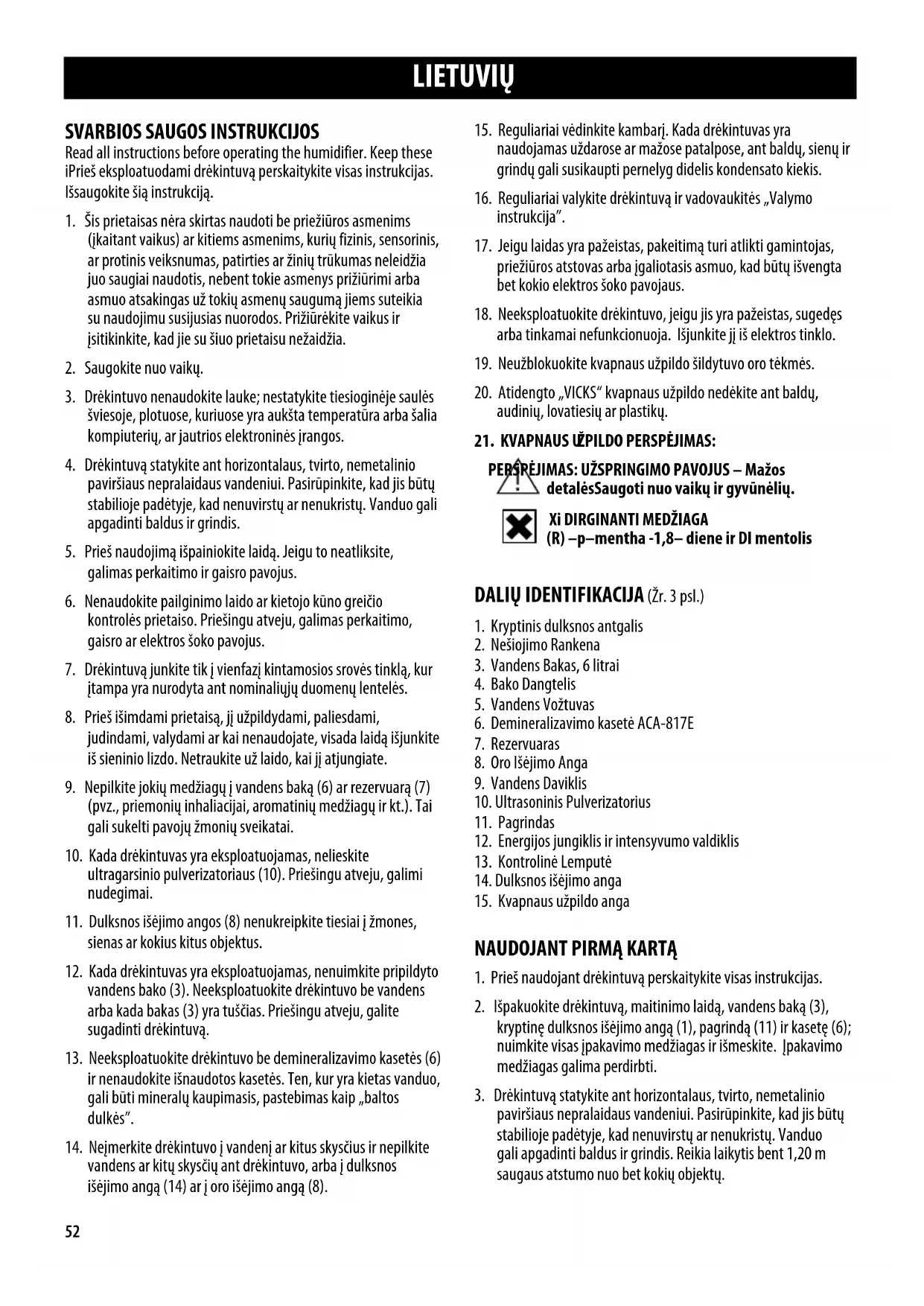 Read all instructions before operating the humidifier. Keep these iPrieš eksploatuodami drėkintuvą perskaitykite visas instrukcijas. Išsaugokite šią instrukciją.