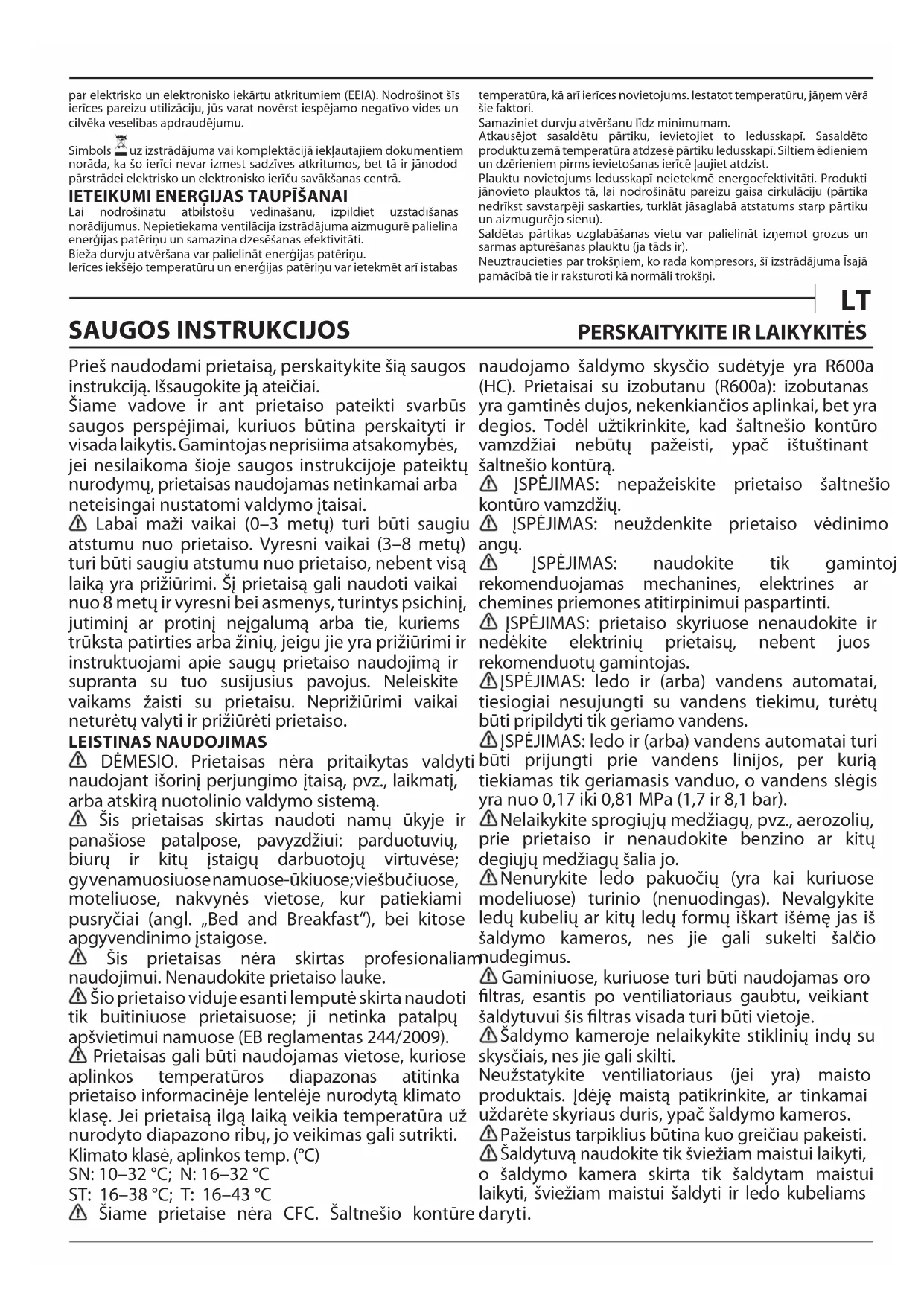 Prieš naudodami prietaisą, perskaitykite šią saugos instrukciją. Išsaugokite ją ateičiai. Šiame vadove ir ant prietaiso pateikti svarbūs saugos perspėjimai, kuriuos būtina perskaityti ir visada laikytis. Gamintojas neprisiima atsakomybės, jei nesilaikoma šioje saugos instrukcijoje pateiktų nurodymų, prietaisas naudojamas netinkamai arba neteisingai nustatomi valdymo įtaisai. Labai maži vaikai (0–3 metų) turi būti saugiu atstumu nuo prietaiso. Vyresni vaikai (3–8 metų) turi būti saugiu atstumu nuo prietaiso, nebent visą laiką yra prižiūrimi. Šį prietaisą gali naudoti vaikai nuo 8 metų ir vyresni bei asmenys, turintys psichinį, jutiminį ar protinį neįgalumą arba tie, kuriems trūksta patirties arba žinių, jeigu jie yra prižiūrimi ir instruktuojami apie saugų prietaiso naudojimą ir supranta su tuo susijusius pavojus. Neleiskite vaikams žaisti su prietaisu. Neprižiūrimi vaikai neturėtų valyti ir prižiūrėti prietaiso. LEISTINAS NAUDOJIMAS DĖMESIO. Prietaisas nėra pritaikytas valdyti naudojant išorinį perjungimo įtaisą, pvz., laikmatį, arba atskirą nuotolinio valdymo sistemą. Šis prietaisas skirtas naudoti namų ūkyje ir panašiose patalpose, pavyzdžiui: parduotuvių, biurų ir kitų įstaigų darbuotojų virtuvėse; gy venamuosiuose namuose-ūkiuose; viešbučiuose, moteliuose, nakvynės vietose, kur patiekiami pusryčiai (angl. „Bed and Breakfast“), bei kitose apgyvendinimo įstaigose. Šis prietaisas nėra skirtas profesionaliam naudojimui. Nenaudokite prietaiso lauke. Šio prietaiso viduje esanti lemputė skirta naudoti tik buitiniuose prietaisuose; ji netinka patalpų apšvietimui namuose (EB reglamentas 244/2009). Prietaisas gali būti naudojamas vietose, kuriose aplinkos temperatūros diapazonas atitinka prietaiso informacinėje lentelėje nurodytą klimato klasę. Jei prietaisą ilgą laiką veikia temperatūra už nurodyto diapazono ribų, jo veikimas gali sutrikti. Klimato klasė, aplinkos temp. (°C) SN: 10–32 °C; N: 16–32 °C ST: 16–38 °C; T: 16–43 °C Šiame prietaise nėra CFC. Šaltnešio kontūre naudojamo šaldymo skysčio sudėtyje yra R600a (HC). Prietaisai su izobutanu (R600a): izobutanas yra gamtinės dujos, nekenkiančios aplinkai, bet yra degios. Todėl užtikrinkite, kad šaltnešio kontūro vamzdžiai nebūtų pažeisti, ypač ištuštinant šaltnešio kontūrą. ĮSPĖJIMAS: nepažeiskite prietaiso šaltnešio kontūro vamzdžių. ĮSPĖJIMAS: neuždenkite prietaiso vėdinimo angų. ĮSPĖJIMAS: naudokite tik gamintojo rekomenduojamas mechanines, elektrines ar chemines priemones atitirpinimui paspartinti. ĮSPĖJIMAS: prietaiso skyriuose nenaudokite ir nedėkite elektrinių prietaisų, nebent juos rekomenduotų gamintojas. ĮSPĖJIMAS: ledo ir (arba) vandens automatai, tiesiogiai nesujungti su vandens tiekimu, turėtų būti pripildyti tik geriamo vandens. ĮSPĖJIMAS: ledo ir (arba) vandens automatai turi būti prijungti prie vandens linijos, per kurią tiekiamas tik geriamasis vanduo, o vandens slėgis yra nuo 0,17 iki 0,81 MPa (1,7 ir 8,1 bar). Nelaikykite sprogiųjų medžiagų, pvz., aerozolių, prie prietaiso ir nenaudokite benzino ar kitų degiųjų medžiagų šalia jo. Nenurykite ledo pakuočių (yra kai kuriuose modeliuose) turinio (nenuodingas). Nevalgykite ledų kubelių ar kitų ledų formų iškart išėmę jas iš šaldymo kameros, nes jie gali sukelti šalčio nudegimus. Gaminiuose, kuriuose turi būti naudojamas oro filtras, esantis po ventiliatoriaus gaubtu, veikiant šaldytuvui šis filtras visada turi būti vietoje. Šaldymo kameroje nelaikykite stiklinių indų su skysčiais, nes jie gali skilti. Neužstatykite ventiliatoriaus (jei yra) maisto produktais. Įdėję maistą patikrinkite, ar tinkamai uždarėte skyriaus duris, ypač šaldymo kameros. Pažeistus tarpiklius būtina kuo greičiau pakeisti. Šaldytuvą naudokite tik šviežiam maistui laikyti, o šaldymo kamera skirta tik šaldytam maistui laikyti, šviežiam maistui šaldyti ir ledo kubeliams daryti.Nedėkite nesuvynioto maisto tiesiai ant vidinių šaldytuvo ar šaldymo kameros paviršių. Prietaisuose gali būti specialių skyrių (šviežio maisto skyrių, nulio laipsnių dėžę ir pan.). Jei kitaip nenurodyta specialiame prietaiso lankstinuke, juos galima išimti ir tai neturės įtakos veikimui. C pentanas naudojamas kaip porodaris izoliacinėse putose; tai yra degios dujos. ĮRENGIMAS Prietaisą perkelti ir įrengti turi du ar daugiau žmonių. Priešingu atveju galite susižeisti. Mūvėkite apsaugines pirštines, kai išpakuojate ir montuojate prietaisą. Priešingu atveju galite įsipjauti. Įrengimą, taip pat prijungimo prie vandentiekio bei elektros tinklo darbus bei remontą turi atlikti kvalifikuotas technikas. Prietaisą remontuoti ar jo dalis keisti galima tik tuo atveju, jei tai nurodyta naudotojo vadove. Pasirūpinkite, kad montavimo vietoje nebūtų vaikų. Išpakavę prietaisą, patikrinkite, ar jis nebuvo pažeistas transportuojant. Jei kyla problemų, kreipkitės į prekybos atstovą arba artimiausią techninės priežiūros po pardavimo tarnybą. Įrengus prietaisą, pakuotės medžiagas (plastiką, polistireno dalis ir pan.) laikykite vaikams nepasiekiamoje vietoje, kad nekiltų uždusimo pavojus. Prieš vykdant bet kokius įrengimo darbus, prietaisą būtina išjungti iš elektros tinklo, kad nekiltų elektros smūgio pavojus. Pasirūpinkite, kad montuojant, prietaisas nepažeistų maitinimo laido. Priešingu atveju gali kilti gaisro ar elektros smūgio pavojus. Prietaisą įjungti galima tik baigus įrengimo darbus. Perkeldami prietaisą būkite atsargūs, kad nepažeistumėte grindų (pvz., parketo). Įrengtas prietaisas turi stovėti lygiai ant grindų, kurios turi būti pakankamai tvirtos, kad išlaikytų prietaiso svorį. Įrengimo vieta turi būti pakankamai erdvi ir tikti prietaiso paskirčiai. Nestatykite prietaiso arti šilumos šaltinių, o keturios jo kojelės turi tvirtai