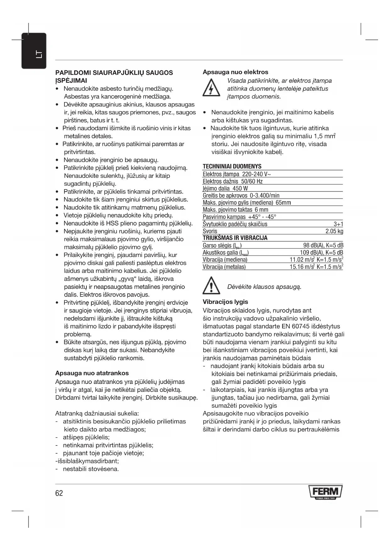 Dėvėkite klausos apsaugą. Vibracijos lygis Vibracijos sklaidos lygis, nurodytas ant šio instrukcijų vadovo užpakalinio viršelio, išmatuotas pagal standarte EN 60745 išdėstytus standartizuoto bandymo reikalavimus; ši vertė gali būti naudojama vienam įrankiui palyginti su kitu bei išankstiniam vibracijos poveikiui įvertinti, kai įrankis naudojamas paminėtais būdais - naudojant įrankį kitokiais būdais arba su kitokiais bei netinkamai prižiūrimais priedais, gali žymiai padidėti poveikio lygis - laikotarpiais, kai įrankis išjungtas arba yra įjungtas, tačiau juo nedirbama, gali žymiai sumažėti poveikio lygis Apsisaugokite nuo vibracijos poveikio prižiūrėdami įrankį ir jo priedus, laikydami rankas šiltai ir derindami darbo ciklus su pertraukėlėmis63