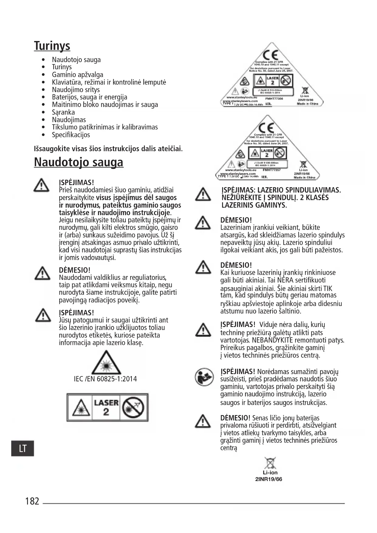 - Lazerinio gaminio gedimo arba pažeidimo atveju jo negalima taisyti pačiam naudotojui; jį privaloma grąžinti atstovui arba pristatyti į„Stanley“ garantinio aptarnavimo / techninės priežiūros centrą. Bet tokius reikiamus techninės priežiūros darbus privalo atlikti tik kvalikuotas meistras, naudojantis tik originalias keičiamąsias dalis. Taip užtikrinsite saugų gaminio veikimą.185