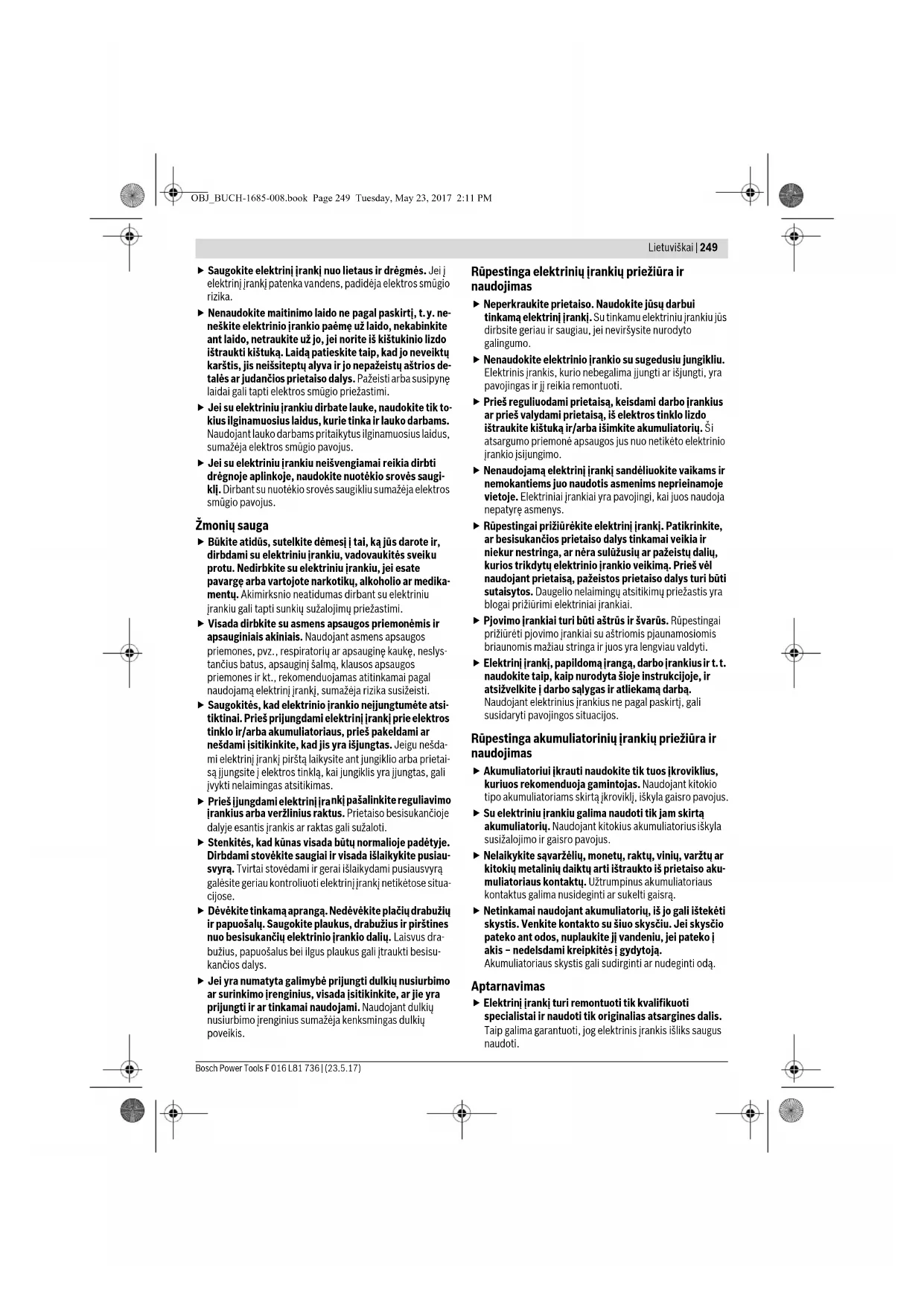 griešanas tālums ar vienu akumulatoru ir pārāk mazs Pārāk liela berze nepietiekošas eļļošanas dēļ Apsmidziniet asmeņu vadotni ar smēreļļu Asmeņus nepieciešams notīrītNotīriet asmeņus Akumulators nav pilnīgi uzlādēts Uzlādējiet akumulatoru, kā norādīts sadaļā „Ieteikumi akumulatora uzlādei“ Akumulatora uzlādes indikators deg pastāvīgi Uzlāde nenotiek Akumulators nav pievienots vai ir nepareizi pievienots uzlādes ierīcei Pareizi pievienojiet akumulatoru uzlādes ierīcei Akumulatora kontakti ir netīri Notīriet akumulatora kontaktus, piemēram, vairākkārt pievienojot akumulatoru uzlādes ierīcei un atvienojot no tās, vai arī nomain iet akumulatoru Akumulators ir bojāts Nomainiet akumulatoru Asmeņi kustas pārāk lēni vai arī nedarbojas pretiestrēgšanas mehānisms Uzlādējiet akumulatoru Uzlādējiet akumulatoru, kā norādīts sadaļā „Ieteikumi akumulatora uzlādei“ Akumulators ir ticis uzglabāts pie temperatūras, kas ir ārpus pieļaujamo vērtību diapazona Nogaidiet, līdz akumulators uzsilst līdz istabas temperatūrai (līdz tā temperatūra sasniedz pieļaujamo vērtību diapazonu, kas ir no 0 līdz 45 °C) Akumulatora uzlādes indikators neiedegas Uzlādes ierīces kontaktdakša nav pievienota vai ir slikti pievienota elektrotīkla kontaktligzdai Pievienojiet elektrobarošanas bloku elektrotīklam vai stingrāk iebīdiet tā kontaktdakšu elektrotīkl a kontaktligzdā Ir bojāta elektrotīkla kontaktligzda, savienojo- šais kabelis vai uzlādes ierīce Pārbaudiet spriegumu elektrotīkla kontakt- ligzdā vai nogādājiet uzlādes ierīci pārbaudei Bosch pilnvarotā elektroinstrumentu remonta darbnīcā OBJ_BUCH-1685-008.book Page 247 Tuesday, May 23, 2017 2:11 PM248 | Lietuviškai F 016 L81 736 | (23.5.17) Bosch Power Tools Klientu konsultāciju dienests un konsultācijas par lietošanu www.bosch-garden.com Pieprasot konsultācijas un pasūtot rezerves daļas, noteikti paziņojiet 10 zīmju izstrādājuma numuru, kas atrodams uz elektroinstrumenta marķējuma plāksnītes. Latvijas Republika Robert Bosch SIA Bosch elektroinstrumentu servisa centrs Mūkusalas ielā 97 LV-1004 Rīga Tālr.: 67146262 Telefakss: 67146263 E-pasts: service-pt@lv.bosch.com Transportēšana Uz izstrādājumam pievienotajiem litija-jonu akumulatoriem attiecas noteikumi par bīstamo kravu pārvadāšanu. Lietotājs var transportēt akumulatorus ielu transporta plūsmā bez papildu nosacījumiem. Pārsūtot tos ar trešo personu starpniecību (piemēram, ar gaisa transporta vai citu transporta aģentūru starpniecību), jāievēro īpaši sūtījuma iesaiņošanas un marķēšanas noteikumi. Tāpēc sūtījumu sagatavošanas laikā jāpieaicina kravu pārvadāšanas speciālists. Pārsūtiet akumulatoru tikai tad, ja tā korpuss nav bojāts. Aizlīmējiet vaļējos akumulatora kontaktus un iesaiņojiet akumulatoru tā, lai tas iesaiņojumā nepārvietotos. Lūdz am ievērot arī ar akumulatoru pārsūtīšanu saistītos nacionālos noteikumus, ja tādi pastāv. Atbrīvošanās no nolietotajiem izstrādājumiem Neizmetiet dārza instrumentus, uzlādes ierīces un akumulatorus vai baterijas sadzīves atkritumu tvertnē! Tikai ES valstīm Atbilstoši Eiropas Savienības direktīvai 2012/19/ES, lietošanai nederīgās elektriskās un elektroniskās ierīces, kā arī, atbilstoši direktīvai 2006/66/EK, bojātie vai nolietotie akumulatori un baterijas jāsavāc atsevišķi un jānogādā otrreizējai pārstrādei apkārtējai videi nekaitīgā veidā. Akumulatori un baterijas Litija-jonu akumulatori Lūdzam ievērot norādījumus, kas sniegti sadaļā „Transportēšana“. Tiesības uz izmaiņām tiek saglabātas. Lietuviškai Saugos nuorodos Pavaizduotų simbolių paaiškinimas Atidžiai perskaitykite šią naudojimo instrukciją. Saugokite elektrinį įrankį nuo lietaus. Prieš pradėdami sodo priežiūros įrankio reguliavimo ar valymo darbus arba jeigu sodo priežiūros įrankį ilgesnį laiką paliksite be priežiūros, iš jo išimkite akumuliatorių. Bendrosios darbo su elektriniais įrankiais saugos nuorodos Perskaitykite visas šias saugos nuorodas ir reikalavimus. Jei nepaisysite žemiau pateiktų saugos nuorodų ir reikalavimų, gali trenkti elektros smūgis, kilti gaisras ir galite sunkiai susižaloti arba sužaloti kitus asmenis. Išsaugokite šias saugos nuorodas ir reikalavimus, kad ir ateityje galėtumėte jais pasinaudoti. Toliau pateiktame tekste vartojama sąvoka „Elektrinis įrankis“ apibūdina įrankius, maitinamus iš elektros tinklo (su maitinimo laidu), ir akumuliatorinius įrankius (be maitinimo laido). Darbo vietos saugumas Darbo vieta turi būti švari ir gerai apšviesta. Netvarkinga arba blogai apšviesta darbo vieta gali tapti nelaimingų atsitikimų priežastimi. Nedirbkite su elektriniu įrankiu aplinkoje, kurioje yra degių skysčių, dujų ar dulkių. Elektriniai įrankiai gali kibirkščiuoti, o nuo kibirkščių dulkės arba susikaupę garai gali užsidegti. Dirbdami su elektriniu įrankiu neleiskite šalia būti žiūrovams, vaikams ir lankytojams. Nukreipę dėmesį į kitus asmenis galite nebesuvaldyti prietaiso. Elektrosauga Elektrinio įrankio maitinimo laido kištukas turi atitikti tinklo kištukinio lizdo tipą. Kištuko jokiu būdu negali- ma modifikuoti. Nenaudokite kištuko adapterių su įžemintais elektriniais įrankiais. Originalūs kištukai, tiks- liai tinkantys elektros tinklo kištukiniam lizdui, sumažina elektros smūgio pavojų. Saugokitės, kad neprisiliestumėte prie įžemintų pa- viršių, pvz., vamzdžių, šildytuvų, viryklių ar šaldytuvų. Kai jūsų kūnas yra įžemintas, padidėja elektros smūgio ri- zika. OBJ_BUCH-1685-008.book Page 248 Tuesday, May 23, 2017 2:11 PMLietuviškai | 249 Bosch Power Tools F 016 L81 736 | (23.5.17) Saugokite elektrinį įrankį nuo lietaus ir drėgmės. Jei į elektrinį įrankį patenka vandens, padidėja elektros smūgio rizika. Nenaudokite 