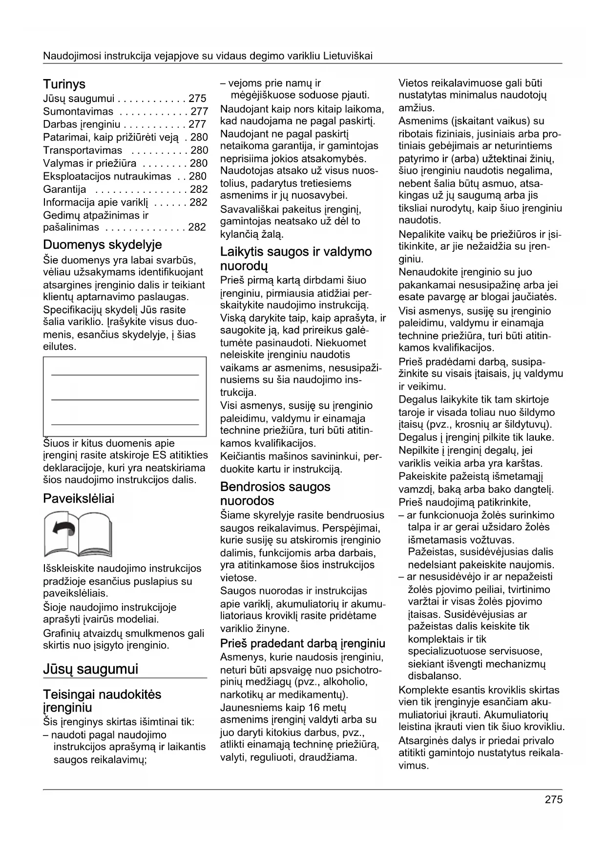 - Gedimų atpažinimas ir pašalinimas Duomenys skydelyje Šie duomenys yra labai svarbūs, vėliau užsakymams identifikuojant atsargines įrenginio dalis ir teikiant klientų aptarnavimo paslaugas. Specifikacijų skydelį Jūs rasite šalia variklio. Įrašykite visus duo- menis, esančius skydelyje, į šias eilutes. Šiuos ir kitus duomenis apie įrenginį rasite atskiroje ES atitikties deklaracijoje, kuri yra neatskiriama šios naudojimo instrukcijos dalis. Paveikslėliai Išskleiskite naudojimo instrukcijos pradžioje esančius puslapius su paveikslėliais. Šioje naudojimo instrukcijoje aprašyti įvairūs modeliai. Grafinių atvaizdų smulkmenos gali skirtis nuo įsigyto įrenginio. Jūsų saugumui Teisingai naudokitės įrenginiu Šis įrenginys skirtas išimtinai tik: – naudoti pagal naudojimo instrukcijos aprašymą ir laikantis saugos reikalavimų; – vejoms prie namų ir mėgėjiškuose soduose pjauti. Naudojant kaip nors kitaip laikoma, kad naudojama ne pagal paskirtį. Naudojant ne pagal paskirtį netaikoma garantija, ir gamintojas neprisiima jokios atsakomybės. Naudotojas atsako už visus nuos- tolius, padarytus tretiesiems asmenims ir jų nuosavybei. Savavališkai pakeitus įrenginį, gamintojas neatsako už dėl to kylančią žalą. Laikytis saugos ir valdymo nuorodų Prieš pirmą kartą dirbdami šiuo įrenginiu, pirmiausia atidžiai per- skaitykite naudojimo instrukciją. Viską darykite taip, kaip aprašyta, ir saugokite ją, kad prireikus galė- tumėte pasinaudoti. Niekuomet neleiskite įrenginiu naudotis vaikams ar asmenims, nesusipaži- nusiems su šia naudojimo ins- trukcija. Visi asmenys, susiję su įrenginio paleidimu, valdymu ir einamąja technine priežiūra, turi būti atitin- kamos kvalifikacijos. Keičiantis mašinos savininkui, per- duokite kartu ir instrukciją. Bendrosios saugos nuorodos Šiame skyrelyje rasite bendruosius saugos reikalavimus. Perspėjimai, kurie susiję su atskiromis įrenginio dalimis, funkcijomis arba darbais, yra atitinkamose šios instrukcijos vietose. Saugos nuorodas ir instrukcijas apie variklį, akumuliatorių ir akumu- liatoriaus kroviklį rasite pridėtame variklio žinyne. Prieš pradedant darbą įrenginiu Asmenys, kurie naudosis įrenginiu, neturi būti apsvaigę nuo psichotro- pinių medžiagų (pvz., alkoholio, narkotikų ar medikamentų). Jaunesniems kaip 16 metų asmenims įrenginį valdyti arba su juo daryti kitokius darbus, pvz., atlikti einamąją techninę priežiūrą, valyti, reguliuoti, draudžiama. Vietos reikalavimuose gali būti nustatytas minimalus naudotojų amžius. Asmenims (įskaitant vaikus) su ribotais fiziniais, jusiniais arba pro- tiniais gebėjimais ar neturintiems patyrimo ir (arba) užtektinai žinių, šiuo įrenginiu naudotis negalima, nebent šalia būtų asmuo, atsa- kingas už jų saugumą arba jis tiksliai nurodytų, kaip šiuo įrenginiu naudotis. Nepalikite vaikų be priežiūros ir įsi- tikinkite, ar jie nežaidžia su įren- giniu. Nenaudokite įrenginio su juo pakankamai nesusipažinę arba jei esate pavargę ar blogai jaučiatės. Visi asmenys, susiję su įrenginio paleidimu, valdymu ir einamąja technine priežiūra, turi būti atitin- kamos kvalifikacijos. Prieš pradėdami darbą, susipa- žinkite su visais įtaisais, jų valdymu ir veikimu. Degalus laikykite tik tam skirtoje taroje ir visada toliau nuo šildymo įtaisų (pvz., krosnių ar šildytuvų). Degalus į įrenginį pilkite tik lauke. Nepilkite į įrenginį degalų, jei variklis veikia arba yra karštas. Pakeiskite pažeistą išmetamąjį vamzdį, baką arba bako dangtelį. Prieš naudojimą patikrinkite, – ar funkcionuoja žolės surinkimo talpa ir ar gerai užsidaro žolės išmetamasis vožtuvas. Pažeistas, susidėvėjusias dalis nedelsiant pakeiskite naujomis. – ar nesusidėvėjo ir ar nepažeisti žolės pjovimo peiliai, tvirtinimo varžtai ir visas žolės pjovimo įtaisas. Susidėvėjusias ar pažeistas dalis keiskite tik komplektais ir tik specializuotuose servisuose, siekiant išvengti mechanizmų disbalanso. Komplekte esantis kroviklis skirtas vien tik įrenginyje esančiam aku- muliatoriui įkrauti. Akumuliatorių leistina įkrauti vien tik šiuo krovikliu. Atsarginės dalys ir priedai privalo atitikti gamintojo nustatytus reikala- vimus.Lietuviškai Naudojimosi instrukcija vejapjove su vidaus degimo varikliu p. 282