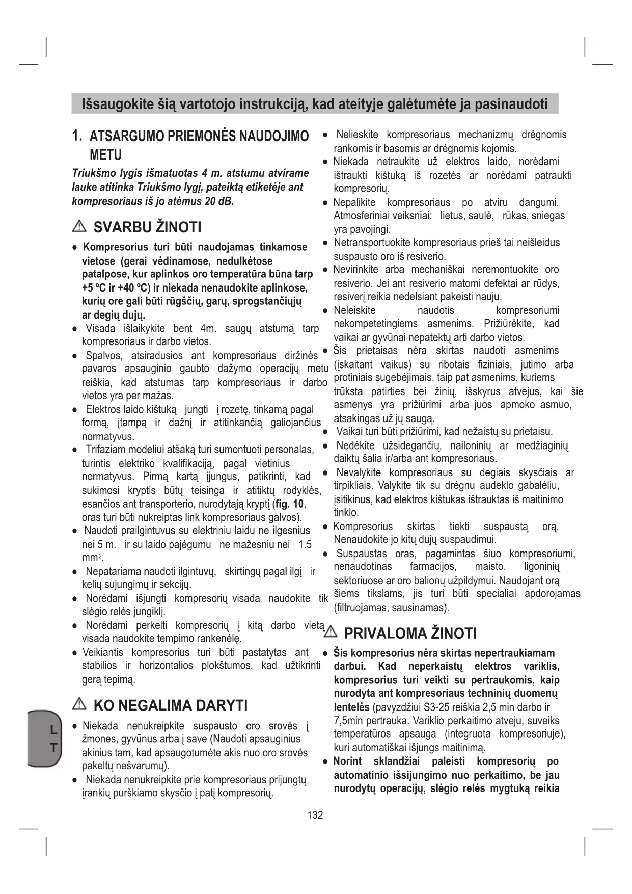- Kompresorius gali buti naudiojamas tik tam skirmose vietose (gera ventiliacija ir tinkama temperatura nuo +5^ iki +40^ ). Tose patalpose negali buti d rugšciu, garu, sprogiu arba degiu duju.