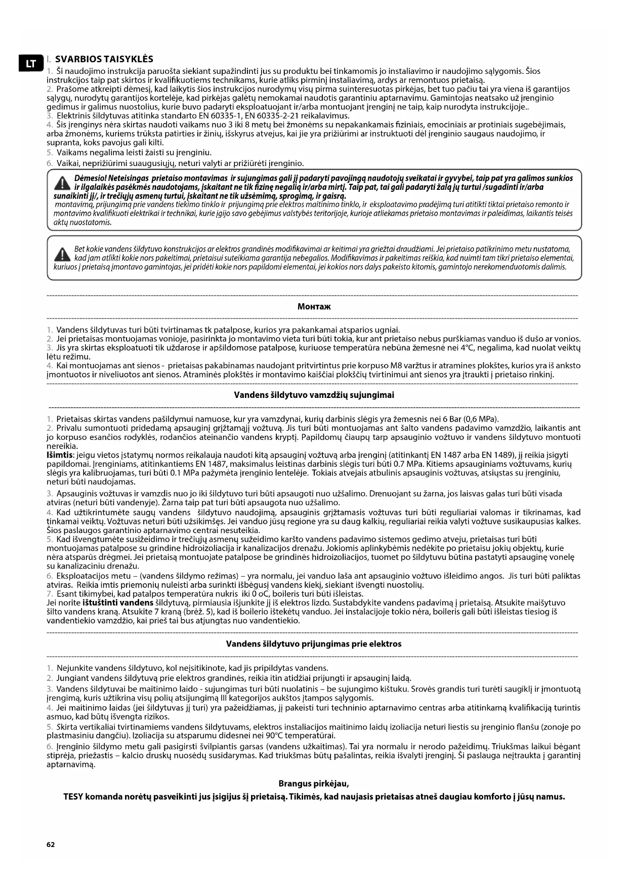 3. Vandens šildytuvai be maitinimo laido - sujungimas turi būti nuolatinis – be sujungimo kištuku. Srovės grandis turi turėti saugiklį ir įmontuotą įrengimą, kuris užtikrina visų polių atsijungimą III kategorijos aukštos įtampos sąlygomis. 4. Jei maitinimo laidas (jei šildytuvas jį turi) yra pažeidžiamas, jį pakeisti turi techninio aptarnavimo centras arba atitinkamą kvalikaciją turintis asmuo, kad būtų išvengta rizikos. 5. Skirta vertikaliai tvirtinamiems vandens šildytuvams, elektros instaliacijos maitinimo laidų izoliacija neturi liestis su įrenginio flanšu (zonoje po plastmasiniu dangčiu). Izoliacija su atsparumu didesnei nei 90°C temperatūrai. 6. Įrenginio šildymo metu gali pasigirsti švilpiantis garsas (vandens užkaitimas). Tai yra normalu ir nerodo pažeidimų. Triukšmas laikui bėgant stiprėja, priežastis – kalcio druskų nuosėdų susidarymas. Kad triukšmas būtų pašalintas, reikia išvalyti įrenginį. Ši paslauga neįtraukta į garantinį aptarnavimą. Brangus pirkėjau, TESY komanda norėtų pasveikinti jus įsigijus šį prietaisą. Tikimės, kad naujasis prietaisas atneš daugiau komforto į jūsų namus.63Lietuvių