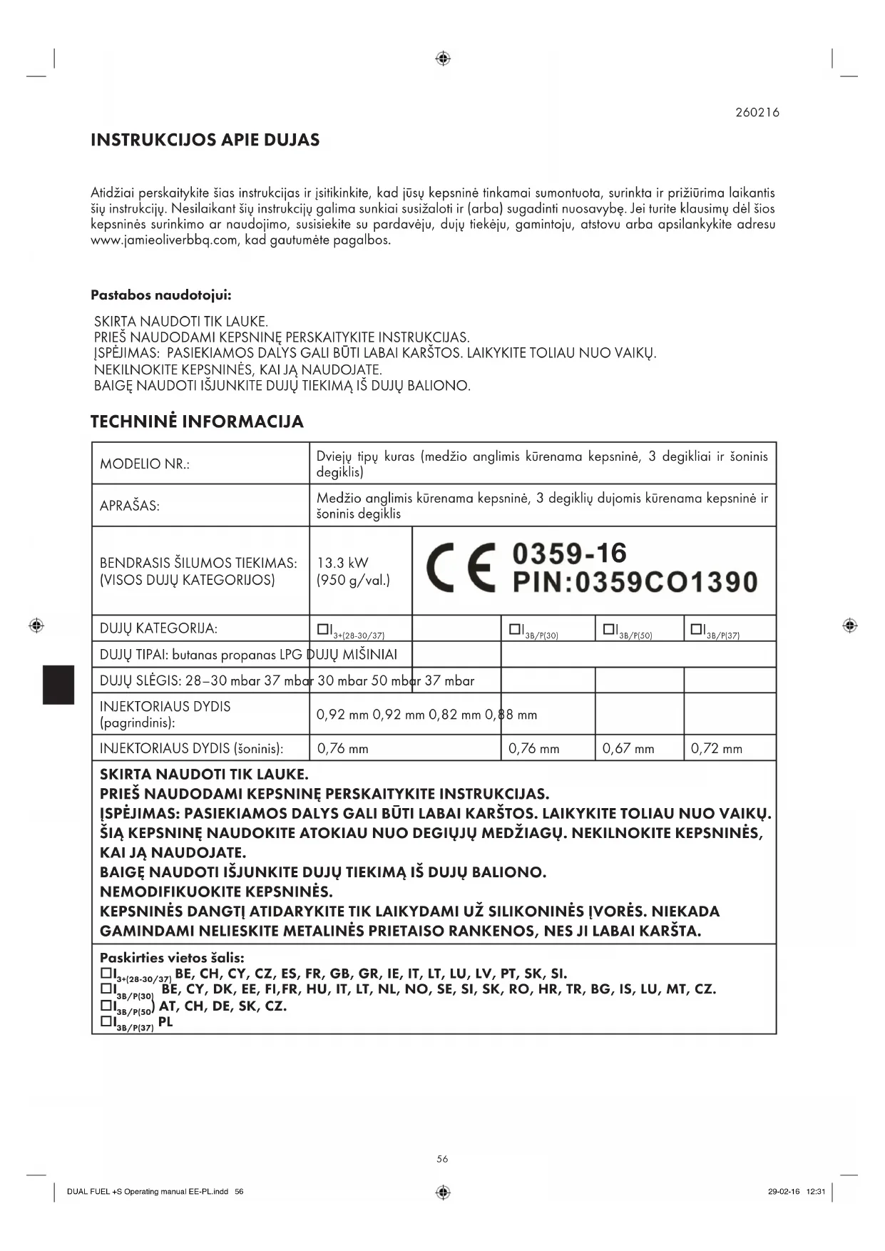 Atidžiai perskaitykite šias instrukcijas ir įsitikinkite, kad jūsų kepsninė tinkamai sumontuota, surinkta ir prižiūrima laikantis šių instrukcijų. Nesilaikant šių instrukcijų galima sunkiai susižaloti ir (arba) sugadinti nuosavybę. Jei turite klausimų dėl šios kepsninės surinkimo ar naudojimo, susisiekite su pardavėju, dujų tiekėju, gamintoju, atstovu arba apsilankykite adresu www.jamieoliverbbq.com, kad gautumėte pagalbos. Pastabos naudotojui: SKIRTA NAUDOTI TIK LAUKE. PRIEŠ NAUDODAMI KEPSNINĘ PERSKAITYKITE INSTRUKCIJAS. ĮSPĖJIMAS: PASIEKIAMOS DALYS GALI BŪTI LABAI KARŠTOS. LAIKYKITE TOLIAU NUO VAIKŲ. NEKILNOKITE KEPSNINĖS, KAI JĄ NAUDOJATE. BAIGĘ NAUDOTI IŠJUNKITE DUJŲ TIEKIMĄ IŠ DUJŲ BALIONO. TECHNINĖ INFORMACIJA MODELIO NR.: Dviejų tipų kuras (medžio anglimis kūrenama kepsninė, 3 degikliai ir šoninis degiklis) APRAŠAS: Medžio anglimis kūrenama kepsninė, 3 degiklių dujomis kūrenama kepsninė ir šoninis degiklis BENDRASIS ŠILUMOS TIEKIMAS: (VISOS DUJŲ KATEGORIJOS)