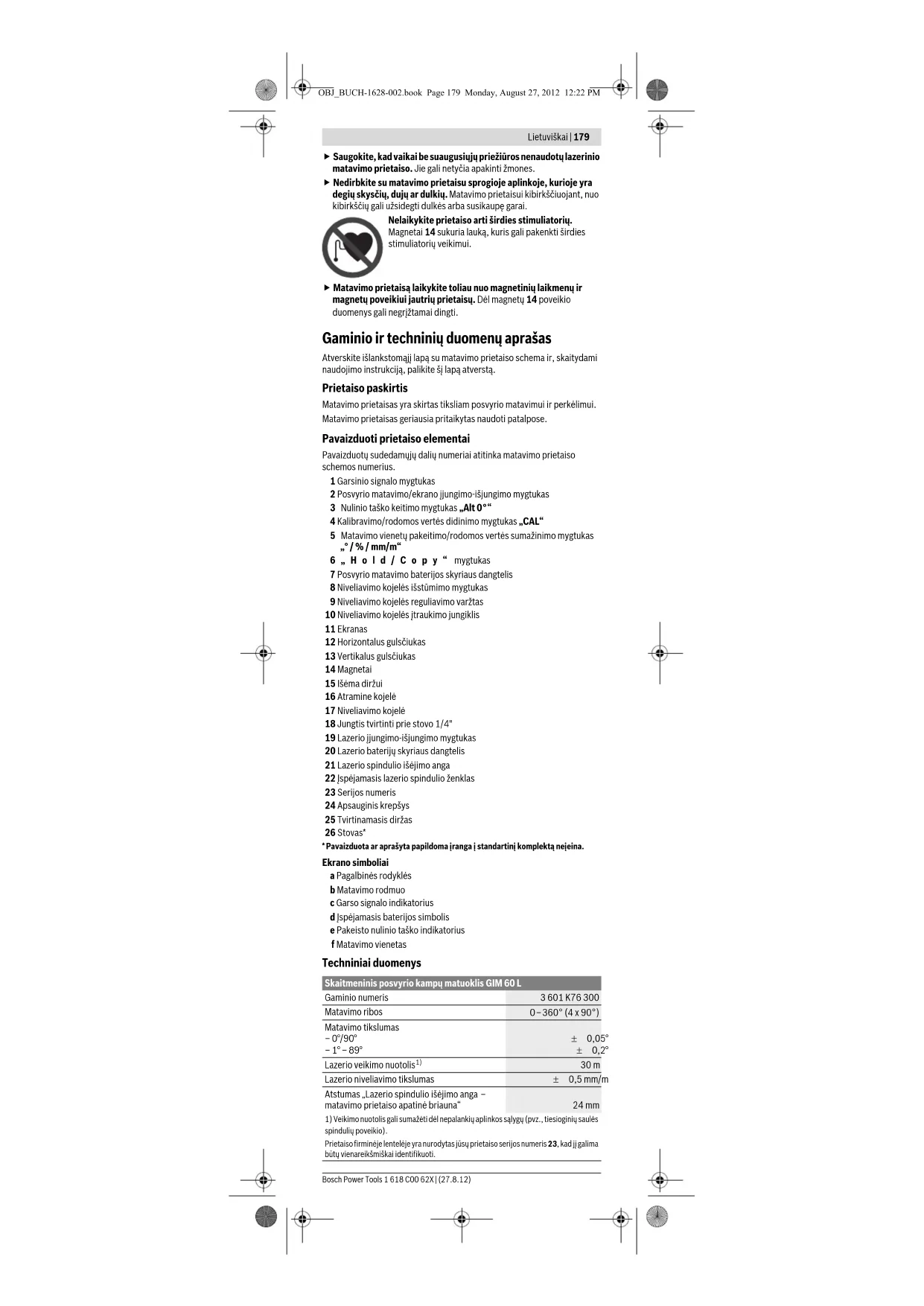 spindulių poveikio). Prietaiso firminėje lentelėje yra nurodytas jūsų prietaiso serijos numeris 23, kad jį galima būtų vienareikšmiškai identifikuoti. OBJ_BUCH-1628-002.book Page 180 Monday, August 27, 2012 12:22 PMLietuviškai | 181 Bosch Power Tools 1 618 C00 62X | (27.8.12) f Saugokite, kad matavimo prietaisas nenukristų ir nebūtų sutrenkiamas. Po stipraus išorinio poveikio matavimo prietaisui, prieš tęsdami darbą, visada turėtumėte atlikti tikslumo patikrinimą (žr. „Matavimo prietaiso tikslumo tikrinimas ir kalibravimas“, 183 psl.). f Užtikrinkite, kad matavimo prietaiso atraminiai paviršiai visada būtų švarūs, saugokite juos nuo smūgių ir sutrenkimų. Dėl nešvarumų ir deformacijos matavimai gali būti klaidingi. Matavimo prietaiso pastatymas ir pritvirtinimas Norėdami išmatuoti ar perkelti posvyrį, matavimo prietaisą ne tik galite padėti ant lygių paviršių ar į juos atremti, bet galite pasinaudoti kitomis jo pastatymo ir pritvirtinimo galimybės. Pastatymas su mechaniniu niveliavimo įtaisu (pvz., jei pagrindas nelygus) (žr. pav. B): – Trumpai paspauskite atraminę kojelę 16, kad ji išlįstų. Paspauskite mygtuką 8, kad išlįstų niveliavimo kojelė 17. Sukdami reguliavimo varžtą 9, nustatykite tokį niveliavimo kojelės aukštį, kad lazerio spindulys eitų palei matuojamą paviršių arba kad pageidaujamas posvyris būtų rodomas kaip matavimo vertė b. – Norėdami dirbti be mechaninio niveliavimo įtaiso, atraminę kojelę 16 ir niveliavimo kojelę 17 vėl įstumkite. Tuo tikslu abi atraminės kojelės dalis suspauskite () ir stumkite atraminę kojelę 16 į matavimo prietaisą (), kol išgirsite, kad ji užsifiksavo. Norėdami įstumti niveliavimo kojelę 17, į šoną pastumkite jungiklį 10. Tvirtinimas prie stovo: – Matavimo prietaisą 1/4" sriegiu, skirtu prie stovo tvirtinti, 18 prisukite prie stovo 26 greitojo keitimo plokštelės arba prie standartinio trikojo stovo. Matavimo prietaisą tvirtai prisukite greitojo keitimo plokštelės fiksuojamuoju varžtu. Tvirtinimas magnetais: – Matavimo prietaisą magnetais 14 pridėkite prie dalies, pasižyminčios pakankamomis magnetinėmis savybėmis. f Patikrinkite, ar matavimo prietaisas gerai pritvirtintas. Netinkamai pritvirtinti matavimo prietaisai gali nukristi ir sužaloti jus ir kitus asmenis. Krisdamas matavimo prietaisas gali būti pažeistas ir gali pažeisti kitus daiktus. Tvirtinimas diržais (žr. pav. C): – Tvirtinamuosius diržus 25 perverkite per diržams skirtas išėmas 15 ir abiem diržais pritvirtinkite matavimo prietaisą prie vamzdžių ar pan. Atkreipkite dėmesį į tai, kad diržo galo kibioji jungtis būtų prispausta prie tvirtinamojo diržo. Jei vamzdis plonas, diržą per išėmas perverkite lygia puse į išorę ir, kaip pavaizduota paveikslėlyje, jį dar kartą apjuoskite apie matavimo prietaisą; jei vamzdis storas, diržą per išėmas perverkite lygia puse į vidų. f Matavimo prietaisą visada pritvirtinkite abiem tvirtinamaisiais diržais ir patikrinkite, ar diržai tvirtai laikosi. Tvirtinamųjų diržų 25 laikymo jėga priklauso nuo medžiagos, prie kurios jie tvirtinami, savybių. Per laisvai pritvirtinti matavimo prietaisai gali nuslysti, būti pažeisti ir gali pažeisti kitus daiktus. f Neleiskite vaikams be suaugusiųjų priežiūros naudoti tvirtinamųjų diržų 25. Tvirtinamaisiais diržais jie gali susižaloti. Posvyrio matavimo ir ekrano įjungimas ir išjungimas Norėdami posvyrio matavimą ir ekraną įjungti, paspauskite įjungimo- išjungimo mygtuką 2. Matavimo prietaisas veikia posvyrio matavimo funkcija su standartiniu nuliniu tašku. Norėdami posvyrio matavimą ir ekraną išjungti, paspauskite įjungimo- išjungimo mygtuką 2. Jei apie 30 min nepaspaudžiamas joks matavimo prietaiso mygtukas ir matavimo prietaiso posvyris nebekinta daugiau kaip 1,5°, kad būtų tausojamos baterijos, posvyrio matavimo funkcija ir ekranas automatiškai išjungiami. Lazeriui tai įtakos nedaro. Lazerio įjungimas ir išjungimas Norėdami lazerį įjungti, įjungimo-išjungimo mygtuką 19 nustatykite į padėtį „I“. f Nenukreipkite lazerio spindulio į kitus asmenis ar gyvūnus ir nežiū- rėkite į lazerio spindulį patys, net ir būdami atokiau nuo prietaiso. Norėdami lazerį išjungti, įjungimo-išjungimo mygtuką 19 nustatykite į padėtį „0“. f Nepalikite matavimo prietaiso su įjungtu lazeriu be priežiūros, o baigę dirbti, lazerį išjunkite. Lazerio spindulys gali apakinti kitus žmones. Jei lazerio nenaudojate, kad taupytumėte energiją, jį išjunkite. OBJ_BUCH-1628-002.book Page 181 Monday, August 27, 2012 12:22 PM182 | Lietuviškai 1 618 C00 62X | (27.8.12) Bosch Power Tools Matavimo vienetų keitimas (žr. pav. A) Matavimo vienetus „°“, „%“ ir „mm/m“ bet kada galite pakeisti. Tuo tikslu pakartotinai spauskite matavimo vienetų pakeitimo mygtuką 5, kol indikatoriuje f atsiras pageidaujamas matavimo vienetas. Rodoma matavimo vertė bus automatiškai perskaičiuojama. Pasirinkti matavimo vienetai išliks ir išjungus bei vėl įjungus prietaisą. Garsinio signalo įjungimas ir išjungimas Garsinio signalo mygtuku 1 galite įjungti ir išjungti garsinį signalą. Kai garsinis signalas yra įjungtas, ekrane rodomas indikatorius c. Įjungiant ir išjungiant prietaisą garso signalo nustatymai išlieka nepakitę. Matavimo vertės rodmuo ir pagalbinės rodyklės Matavimų rezultatai yra atnaujinami po kiekvieno prietaiso judesio. Daugiau pajudinę prietaisą, palaukite, kol rodmenys nebesikeis, ir tik tuomet užfiksuokite matavimo rezultatą. Priklausomai nuo matavimo prietaiso padėties, matavimo rezultatai ir matavimo vienetai gali būti rodomi apversti 180° kampu. Tuomet galima lengvai perskaityti rodmenis ir laikant prietaisą virš galvos. Pagalbinėmis rodyklėmis a ekrane matavimo prietaisas rodo, kuria kryptimi reikia paversti, norint pasiekti reikiamą vertę. Atliekant standartinius mat
