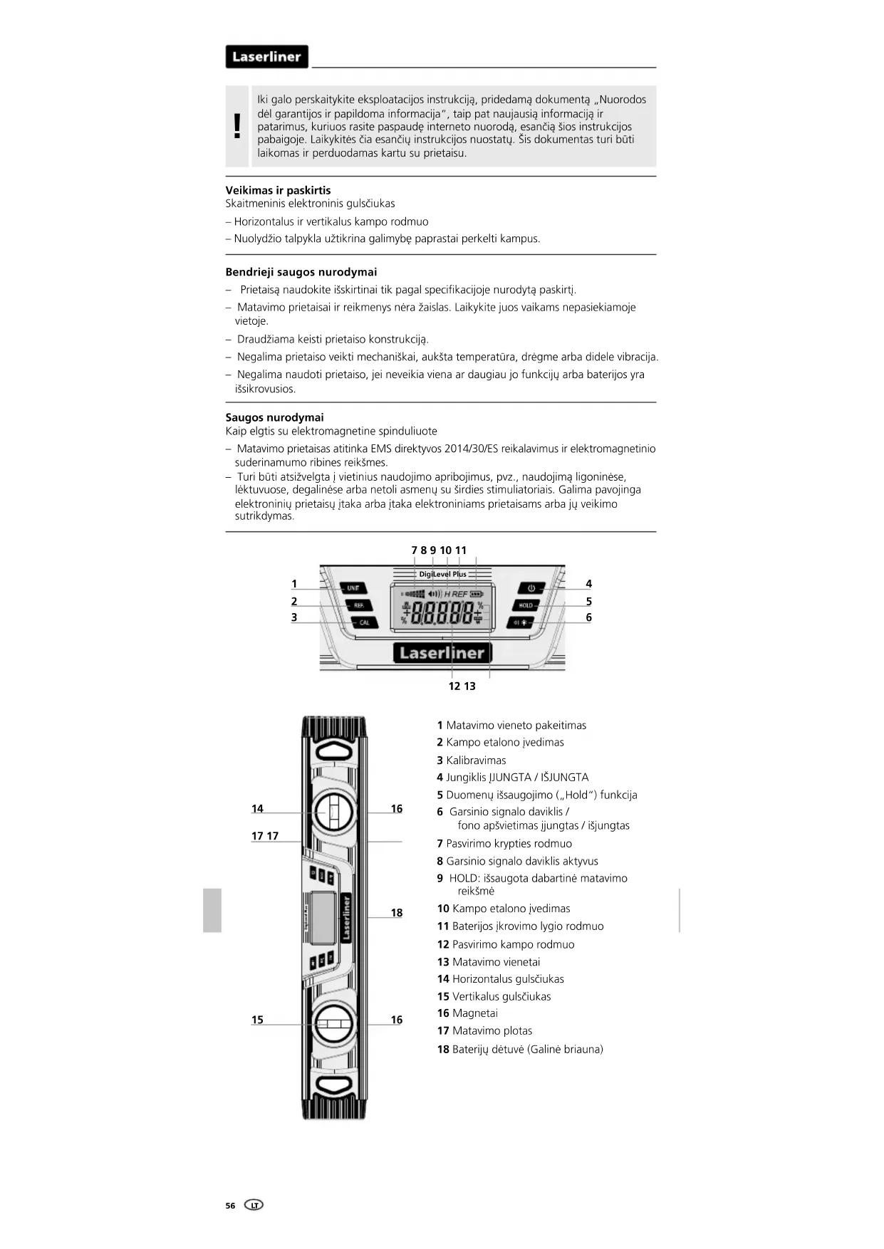 1 Matavimo vieneto pakeitimas 2 Kampo etalono įvedimas 3 Kalibravimas 4 Jungiklis ĮJUNGTA / IŠJUNGTA 5 Duomenų išsaugojimo („Hold“) funkcija 6 Garsinio signalo daviklis / fono apšvietimas įjungtas / išjungtas 7 Pasvirimo krypties rodmuo 8 Garsinio signalo daviklis aktyvus 9 HOLD: išsaugota dabartinė matavimo reikšmė 10 Kampo etalono įvedimas 11 Baterijos įkrovimo lygio rodmuo 12 Pasvirimo kampo rodmuo 13 Matavimo vienetai 14 Horizontalus gulsčiukas 15 Vertikalus gulsčiukas 16 Magnetai 17 Matavimo plotas 18 Baterijų dėtuvė (Galinė briauna)DigiLevel Plus