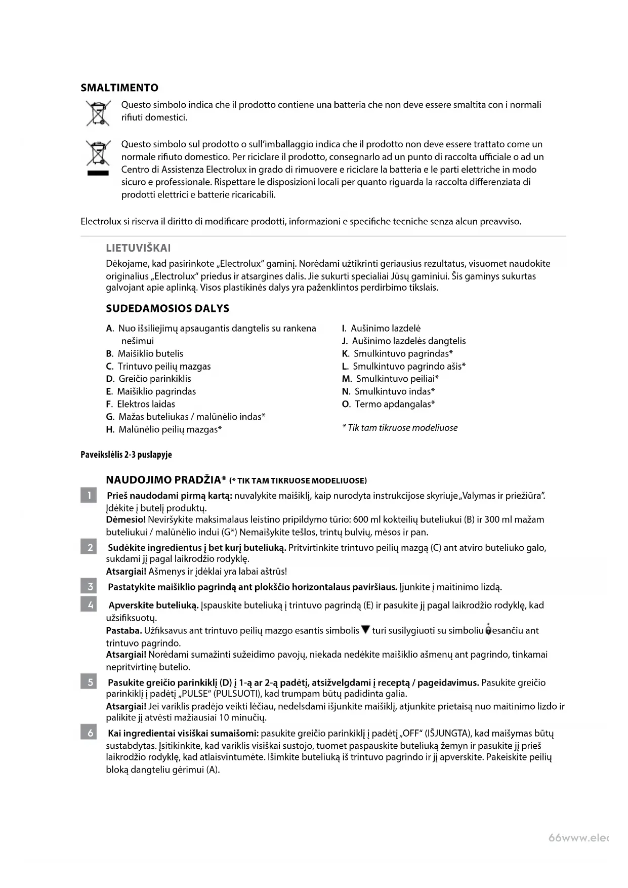 11 Pritvirtinkite smulkintuvo peilius (M*) ant smulkintuvo pagrindo ašies (L*), spausdami juos žemyn, kol peiliai užsiksuos savo vietoje. Sudėkite ingredientus į smulkintuvo indą (N*). Uždėkite smulkintuvo pagrindą (K*) ant smulkintuvo indo, pasukdami jį pagal laikrodžio rodyklę, kol smulkintuvo indas užsiksuos savo vietoje. 12 Apverskite smulkintuvą. Įspauskite smulkintuvą į trintuvo pagrindą (E) ir pasukite jį pagal laikrodžio rodyklę, kad užsiksuotų. Pastaba. Užksavus ant smulkintuvo pagrindo esantis simbolis turi susilygiuoti su simboliu , esančiu ant trintuvo pagrindo. Dėmesio! Norėdami sumažinti sužalojimo riziką, niekada nedėkite peilių mazgo ant pagrindo tinkamai neuždėję smulkintuvo indo. TERMO APDANGALO NAUDOJIMAS* * TIK TAM TIKRUOSE MODELIUOSE 13 Termo apdangalo charakteristikos: palaiko tokios pačios temperatūros skysčius ilgiau, tiek šaltiems, tiek karštiems gėrimams. Įdėkite butelį į apdangalą ir užtraukite užtrauktuką. VALYMAS IR PRIEŽIŪRA* * TIK TAM TIKRUOSE MODELIUOSE 14 Atjunkite prietaisą nuo maitinimo. Priedus galima plauti indaplovėje, išskyrus trintuvo peilių mazgą (C), malūnėlio peilių mazgą (H*) ir smulkintuvo pagrindą (K*). Palaukite, kol visos dalys gerai išdžius. Atsargiai! Ašmenys ir įdėklai yra labai aštrūs! 15 Nuvalykite maišiklio pagrindą drėgnu skudurėliu. Atsargiai! Niekada nepanardinkite maišiklio pagrindo į vandenį! Prietaiso nevalykite abrazyviniais valikliais arba šveičiamosiomis kempinėmis. Naudokitės savo nauju „Electrolux“ gaminiu! SAUGOS PATARIMAS Prieš naudodami prietaisą pirmą kartą atidžiai perskaitykite šias instrukcijas.
