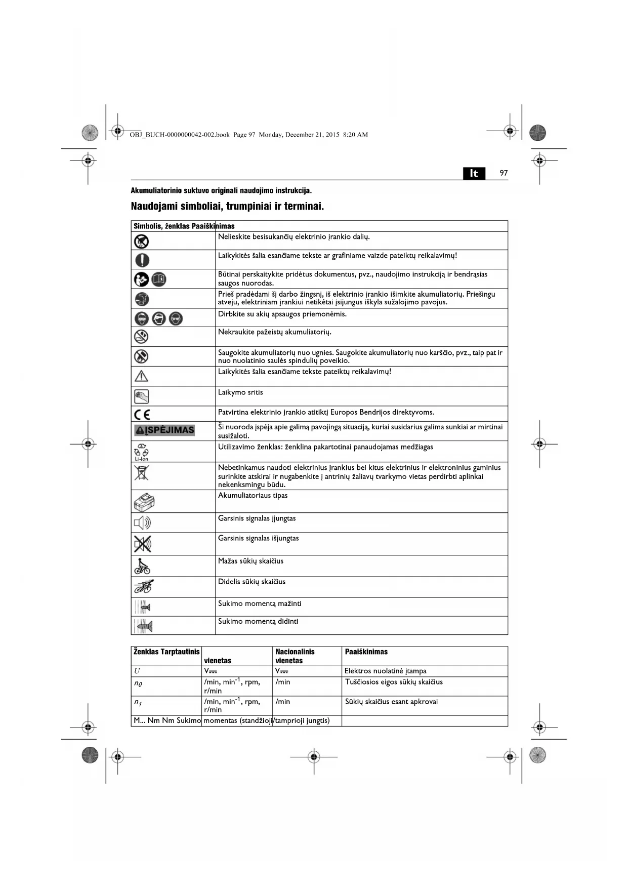 Akumuliatorinio suktuvo originali naudojimo instrukcija. Naudojami simboliai, trumpiniai ir terminai. Simbolis, ženklas Paaiškinimas Nelieskite besisukančių elektrinio įrankio dalių. Laikykitės šalia esančiame tekste ar grafiniame vaizde pateiktų reikalavimų! Būtinai perskaitykite pridėtus dokumentus, pvz., naudojimo instrukciją ir bendrąsias saugos nuorodas. Prieš pradėdami šį darbo žingsnį, iš elektrinio įrankio išimkite akumuliatorių. Priešingu atveju, elektriniam įrankiui netikėtai įsijungus iškyla sužalojimo pavojus. Dirbkite su akių apsaugos priemonėmis. Nekraukite pažeistų akumuliatorių. Saugokite akumuliatorių nuo ugnies. Saugokite akumuliatorių nuo karščio, pvz., taip pat ir nuo nuolatinio saulės spindulių poveikio. Laikykitės šalia esančiame tekste pateiktų reikalavimų! Laikymo sritis Patvirtina elektrinio įrankio atitiktį Europos Bendrijos direktyvoms. Ši nuoroda įspėja apie galimą pavojingą situaciją, kuriai susidarius galima sunkiai ar mirtinai susižaloti. Utilizavimo ženklas: ženklina pakartotinai panaudojamas medžiagas Nebetinkamus naudoti elektrinius įrankius bei kitus elektrinius ir elektroninius gaminius surinkite atskirai ir nugabenkite į antrinių žaliavų tvarkymo vietas perdirbti aplinkai nekenksmingu būdu. Akumuliatoriaus tipas Garsinis signalas įjungtas Garsinis signalas išjungtas Mažas s ūkių skaičius Didelis sūkių skaičius Sukimo momentą mažinti Sukimo momentą didinti Ženklas Tarptautinis vienetas Nacionalinis vienetas Paaiškinimas U V V Elektros nuolatinė įtampa